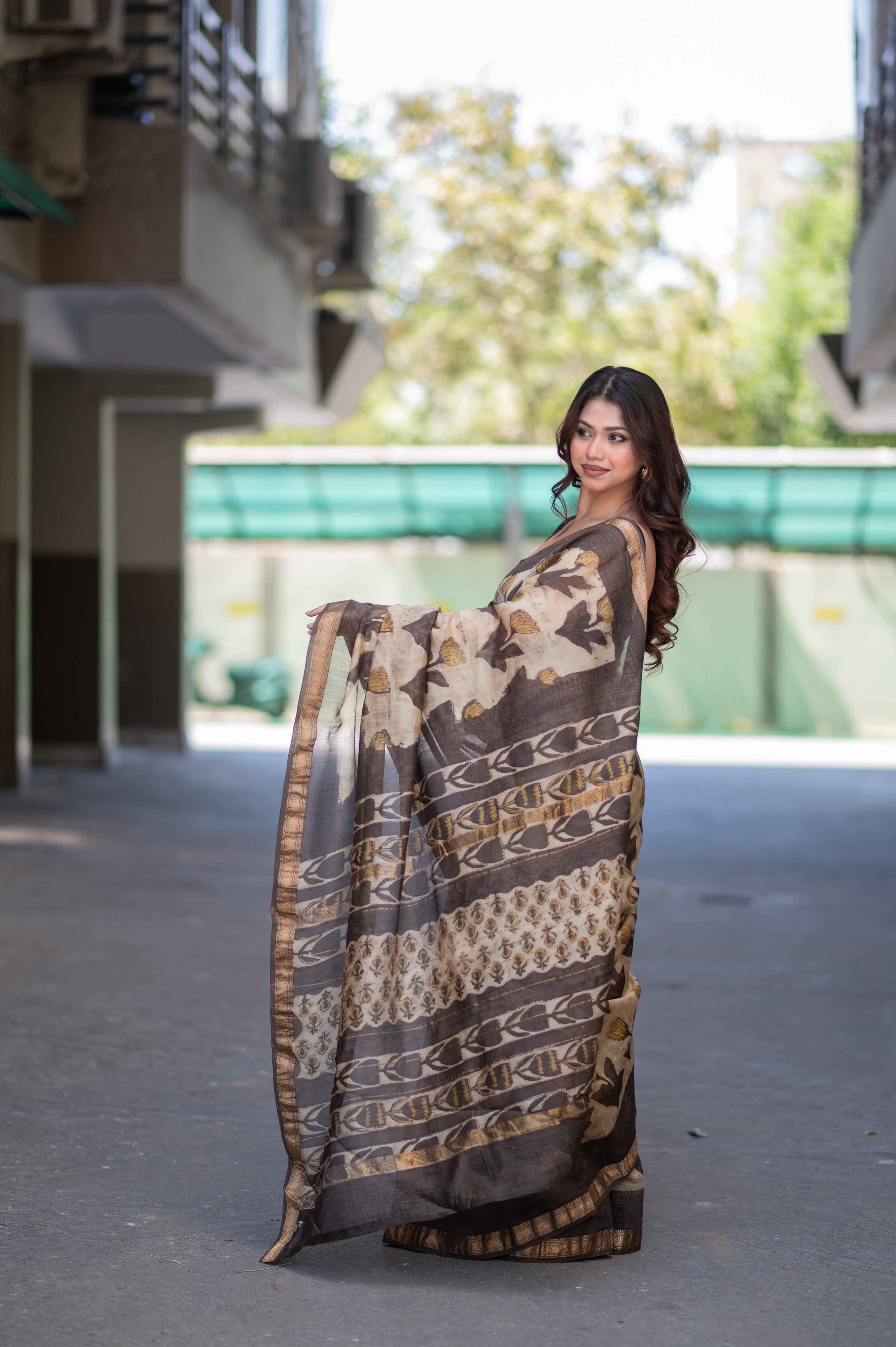 Kamalini- Beige Ajrakh Maheshwari Silk Saree