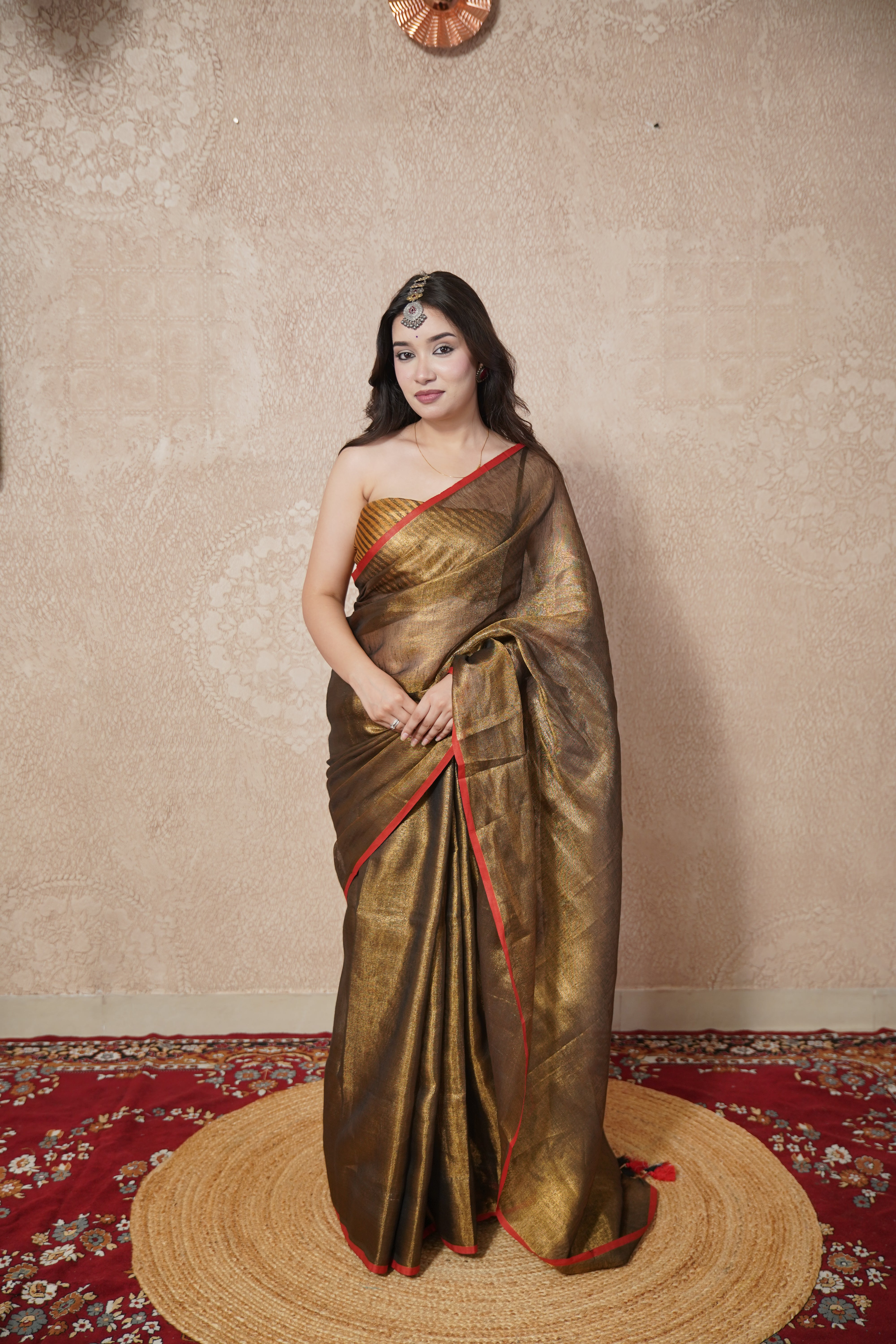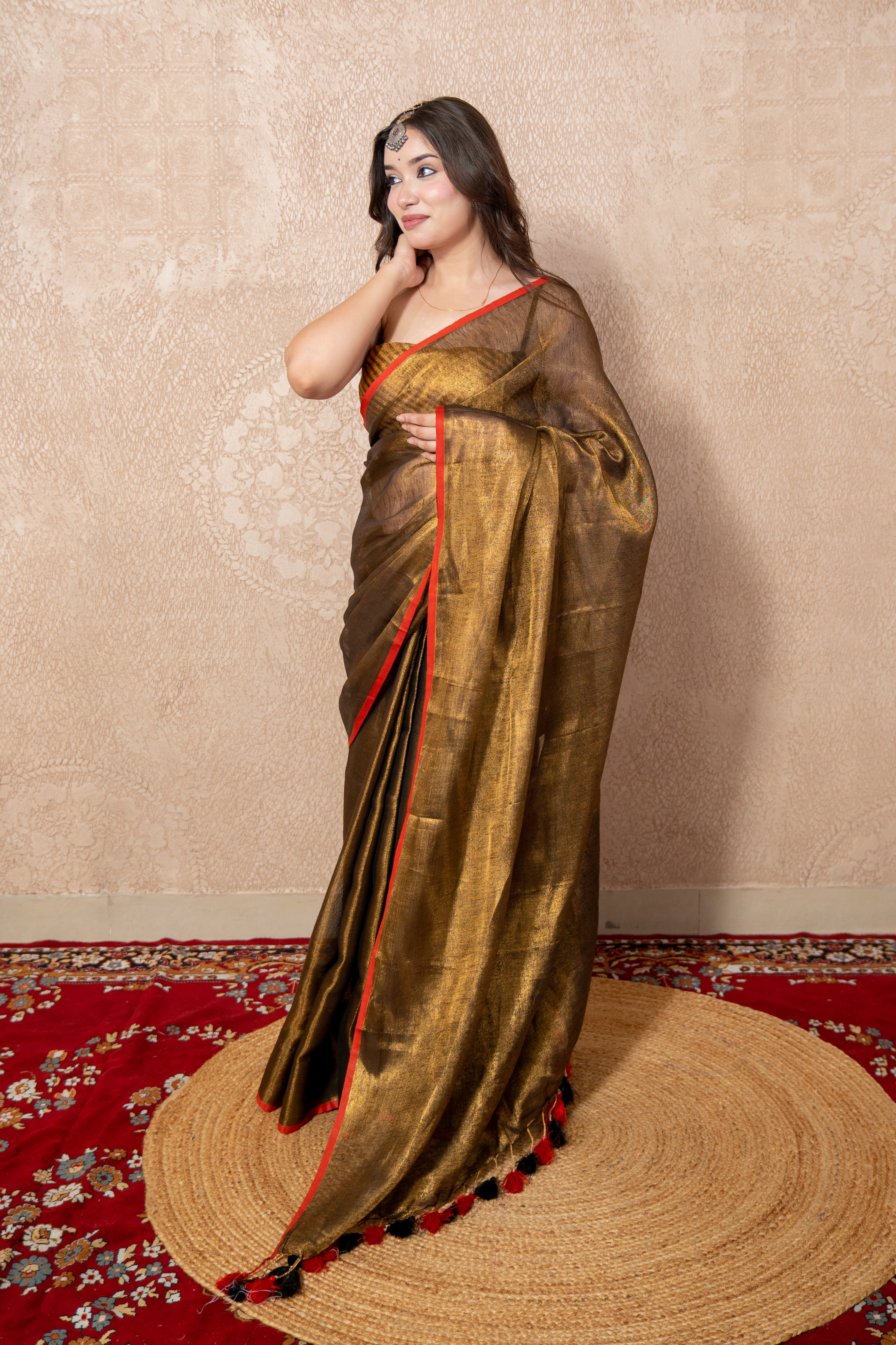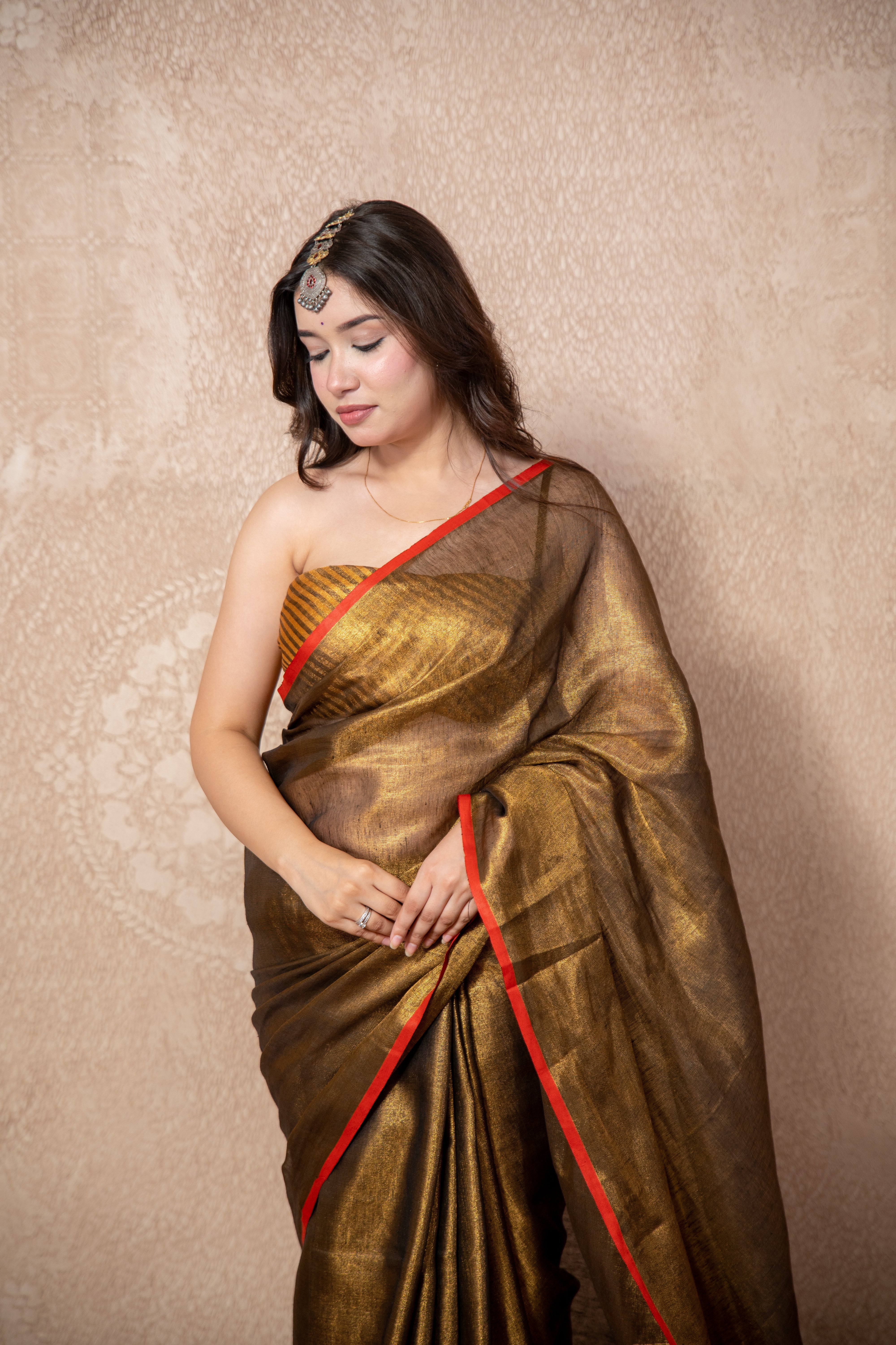 Copper Zari Linen Saree with Red Edging – Exquisite Elegance Redefined