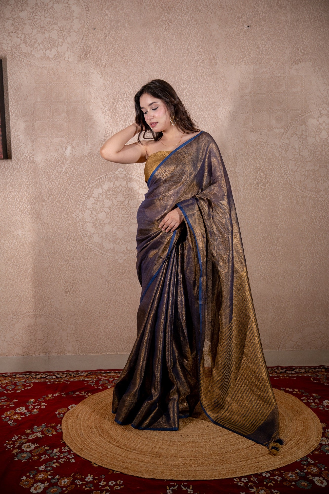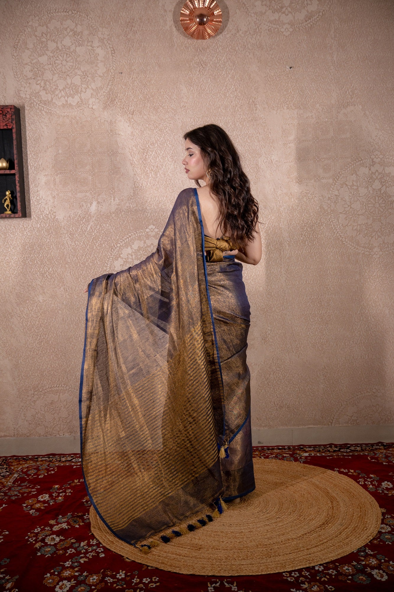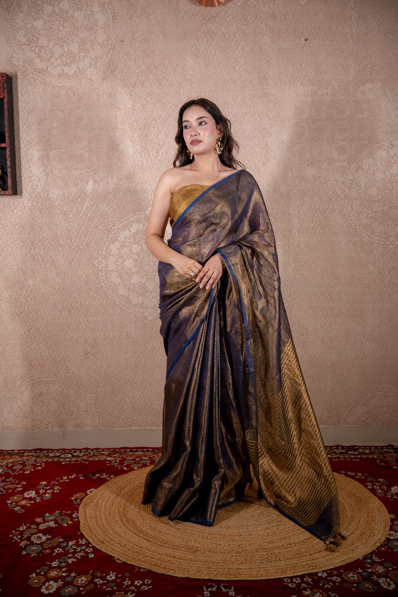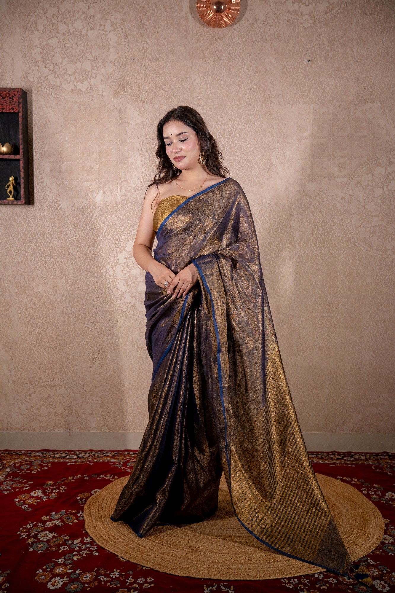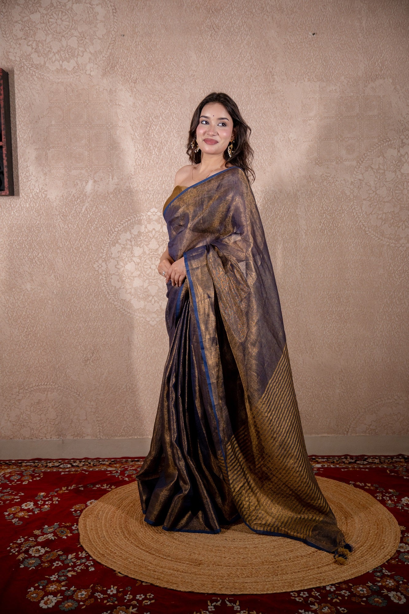 Elegant and timeless, Aarna is a serene Blue Zari Saree with a Striped Pallu—a perfect blend of subtle luxury and heritage grace. Part of our handpicked "Sone ki Abha" collection, this saree is designed for those who appreciate classic tradition with a refined, modern touch.