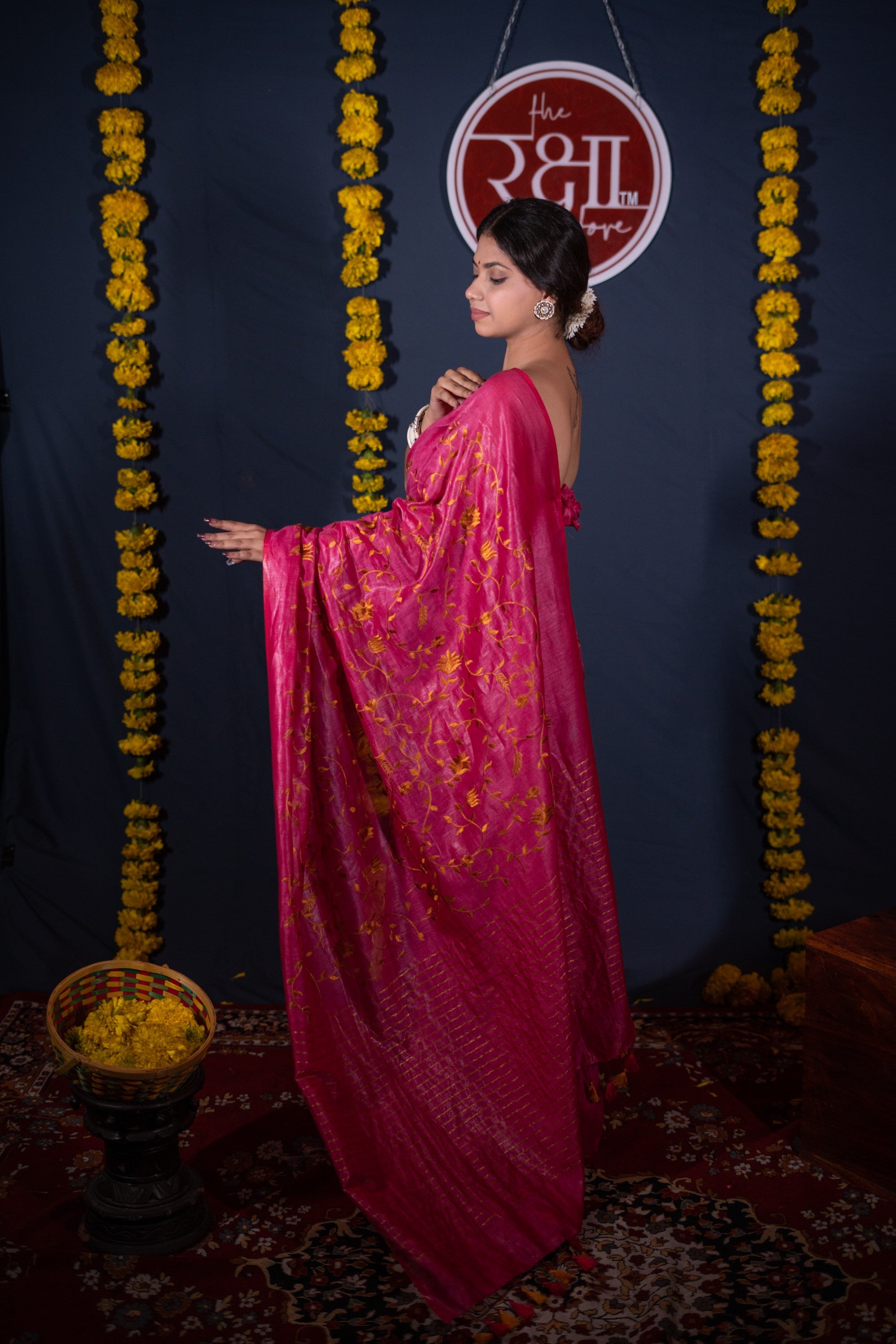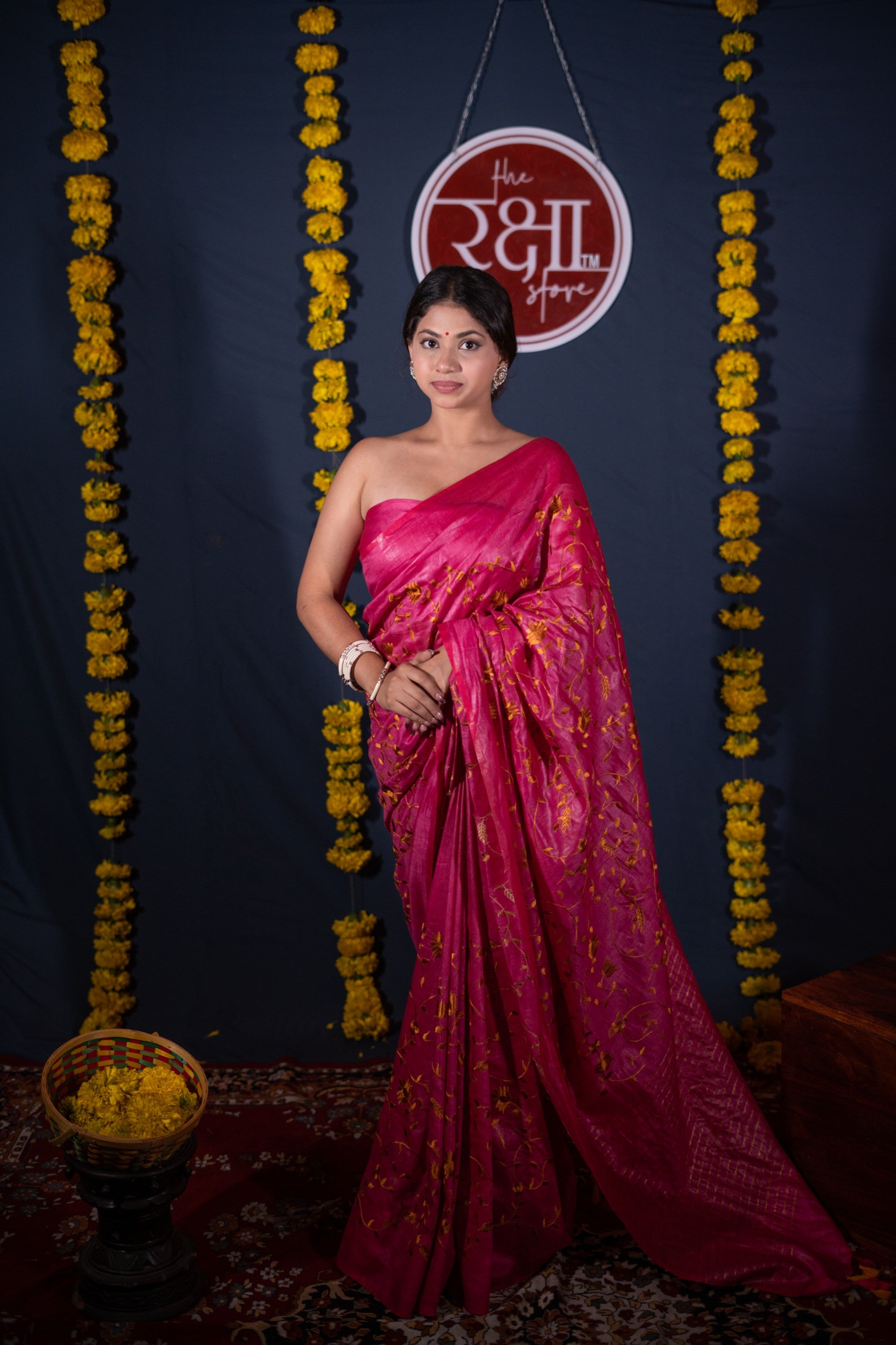 Elevate your ethnic wear collection with the Aarya Pink Silk Linen Saree, a blend of tradition, luxury, and modern aesthetics. Order now to embrace the elegance and charm of this exquisite piece, with the assurance of free shipping and impeccable quality.