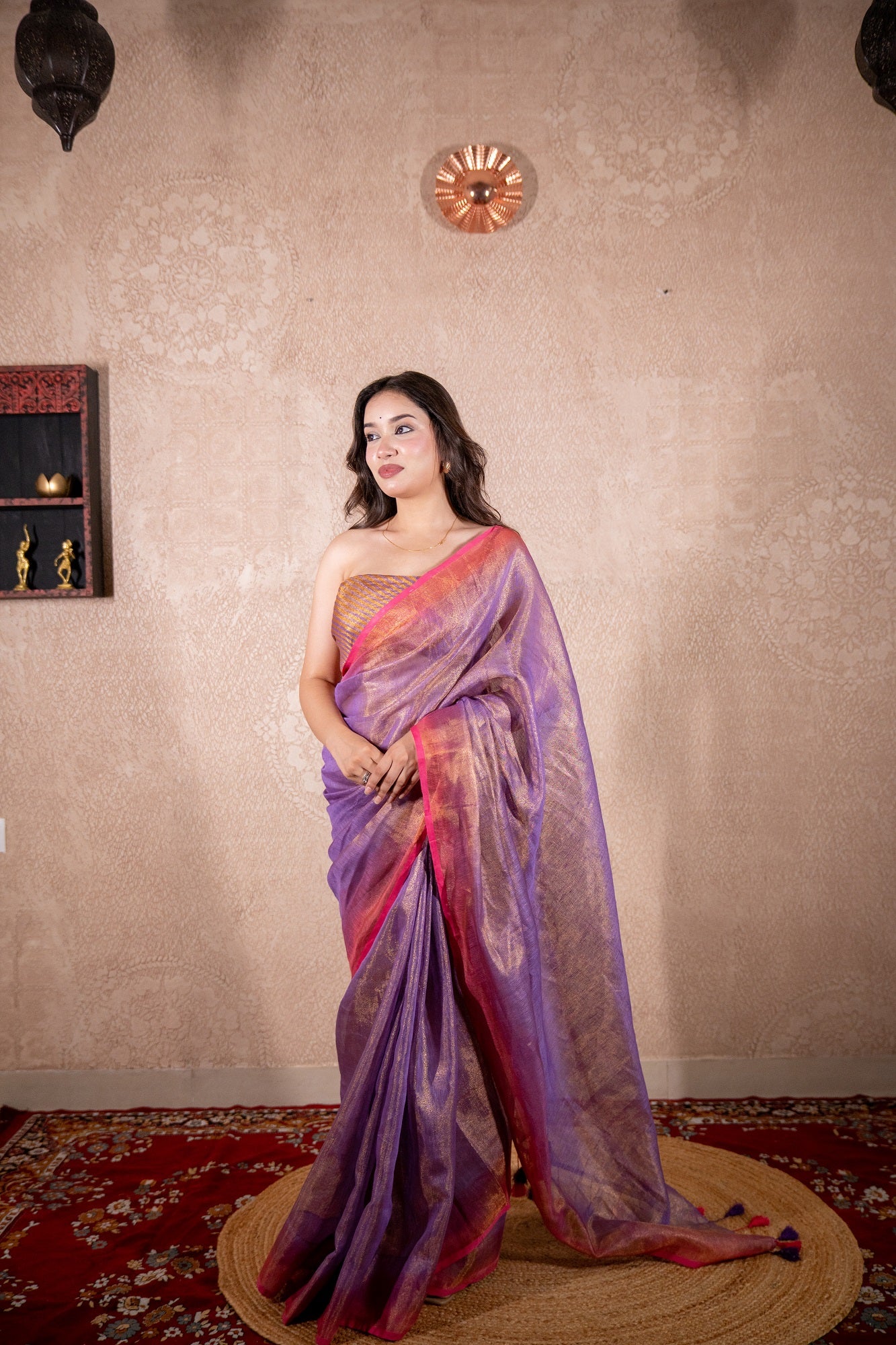 Elevate your ethnic wardrobe with Amaira, an exquisite Purple Zari Linen Saree that reflects the timeless beauty of tradition and modern sophistication. Part of our exclusive “Sone ki Abha” collection, this saree is a statement of elegance—crafted for the woman who values heritage with a contemporary twist.