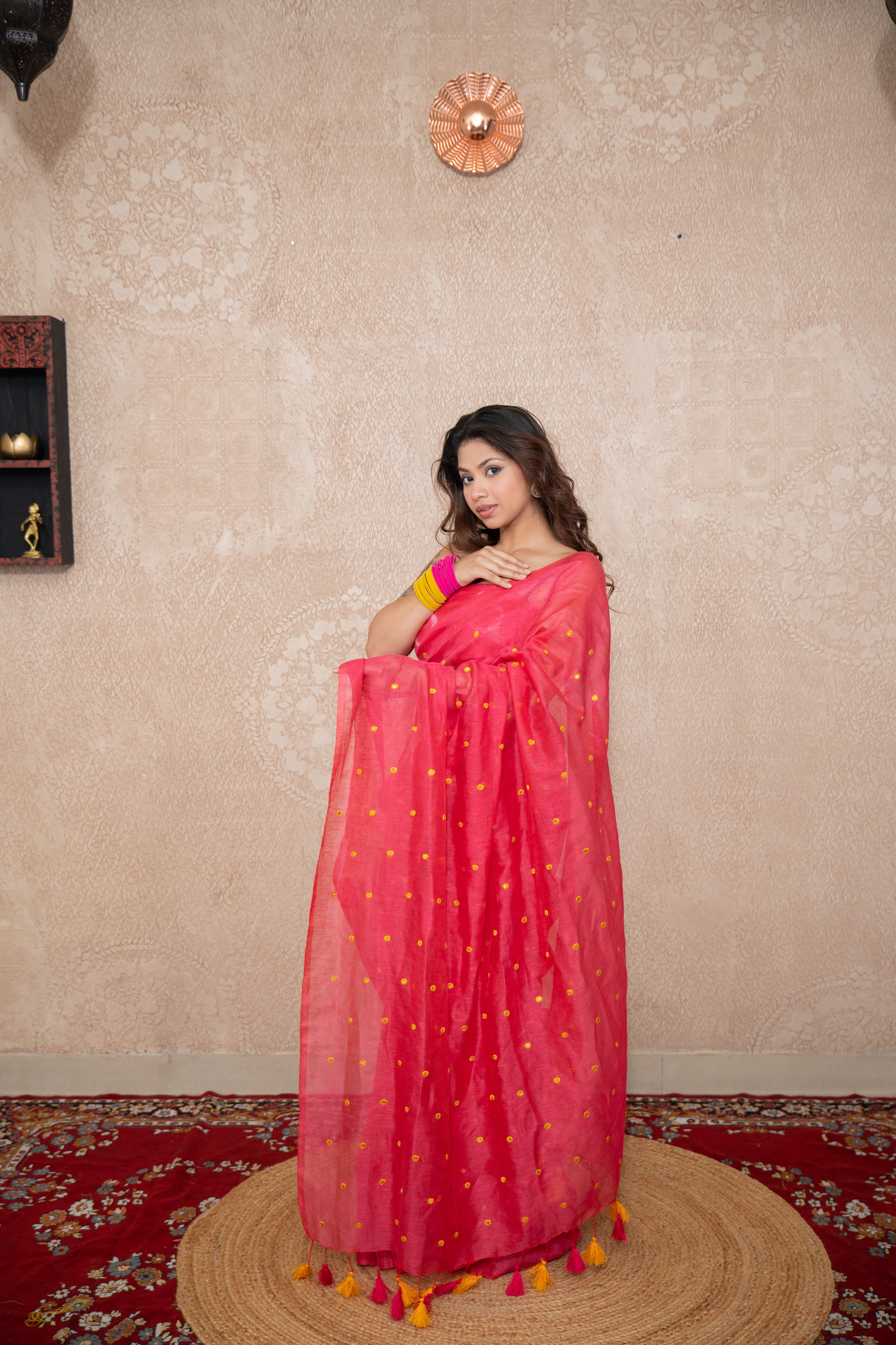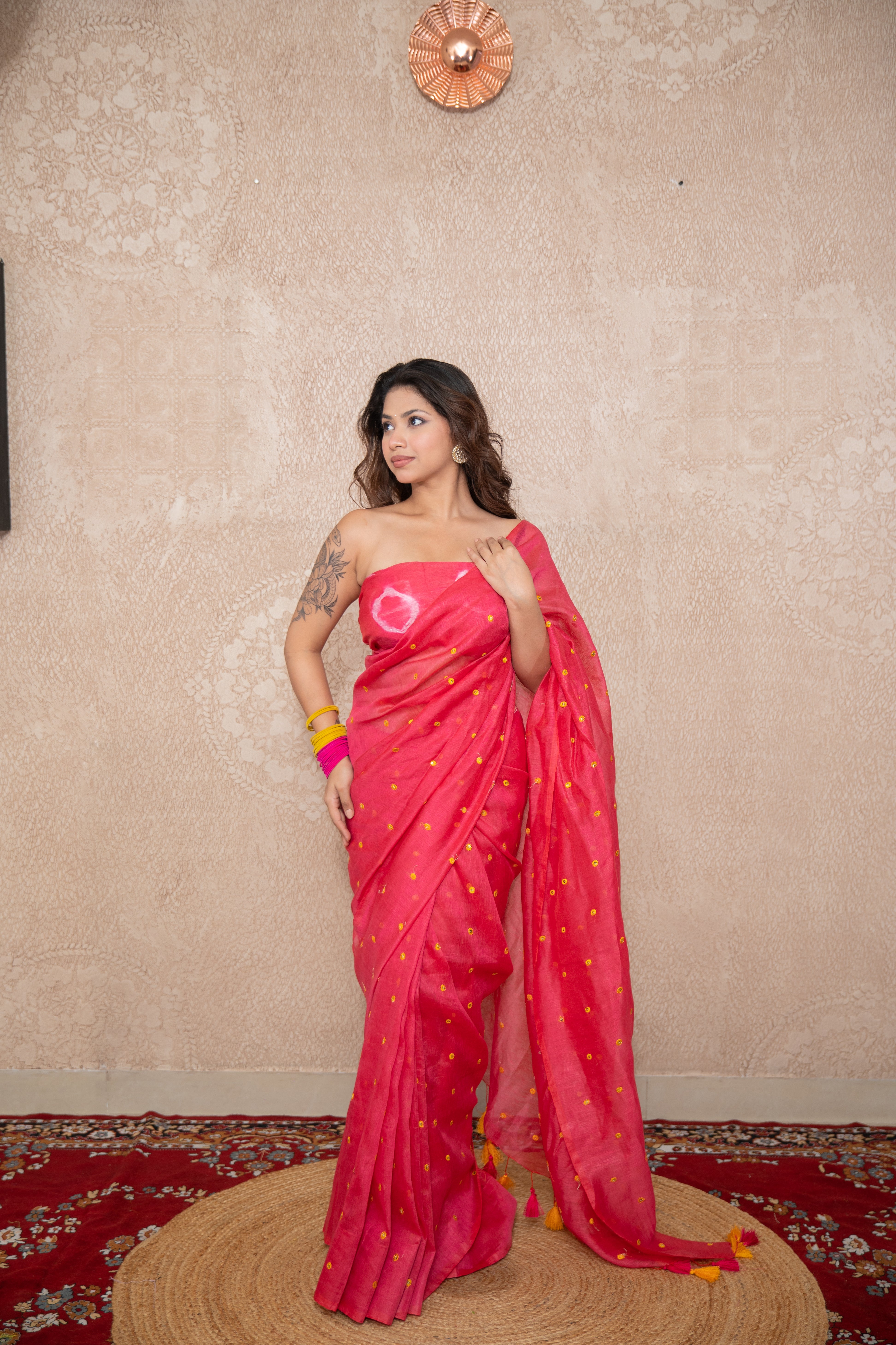 Introducing Anandita, a timeless masterpiece in pure silk linen fabric that perfectly balances tradition with contemporary aesthetics. This exquisite saree comes in a charming pink hue adorned with intricate tikli work, showcasing the finesse of hand craftsmanship. Paired with a stunning shibori-dyed blouse, Anandita is a versatile addition to your wardrobe, ideal for festive occasions, weddings, and elegant soirees.