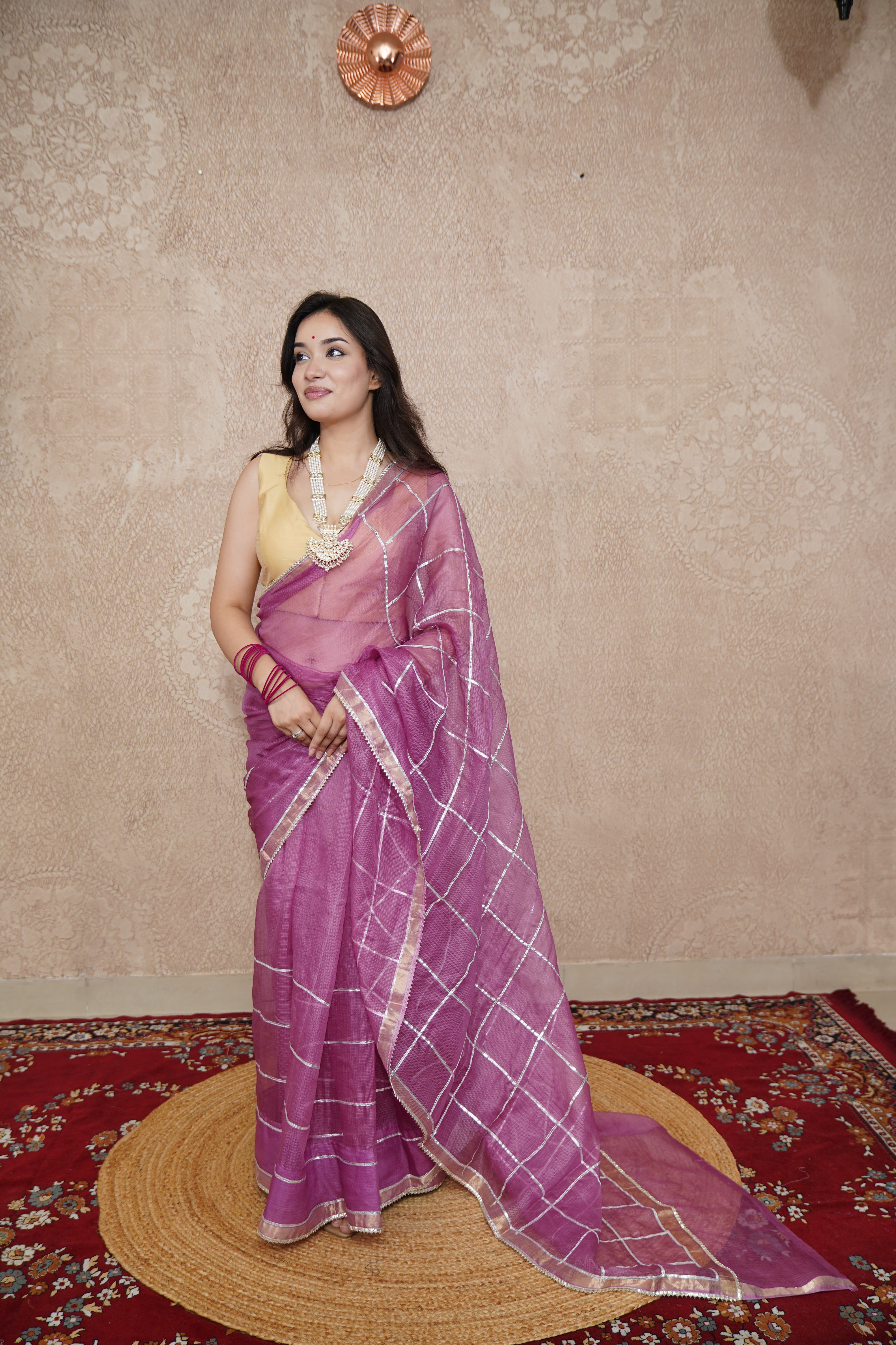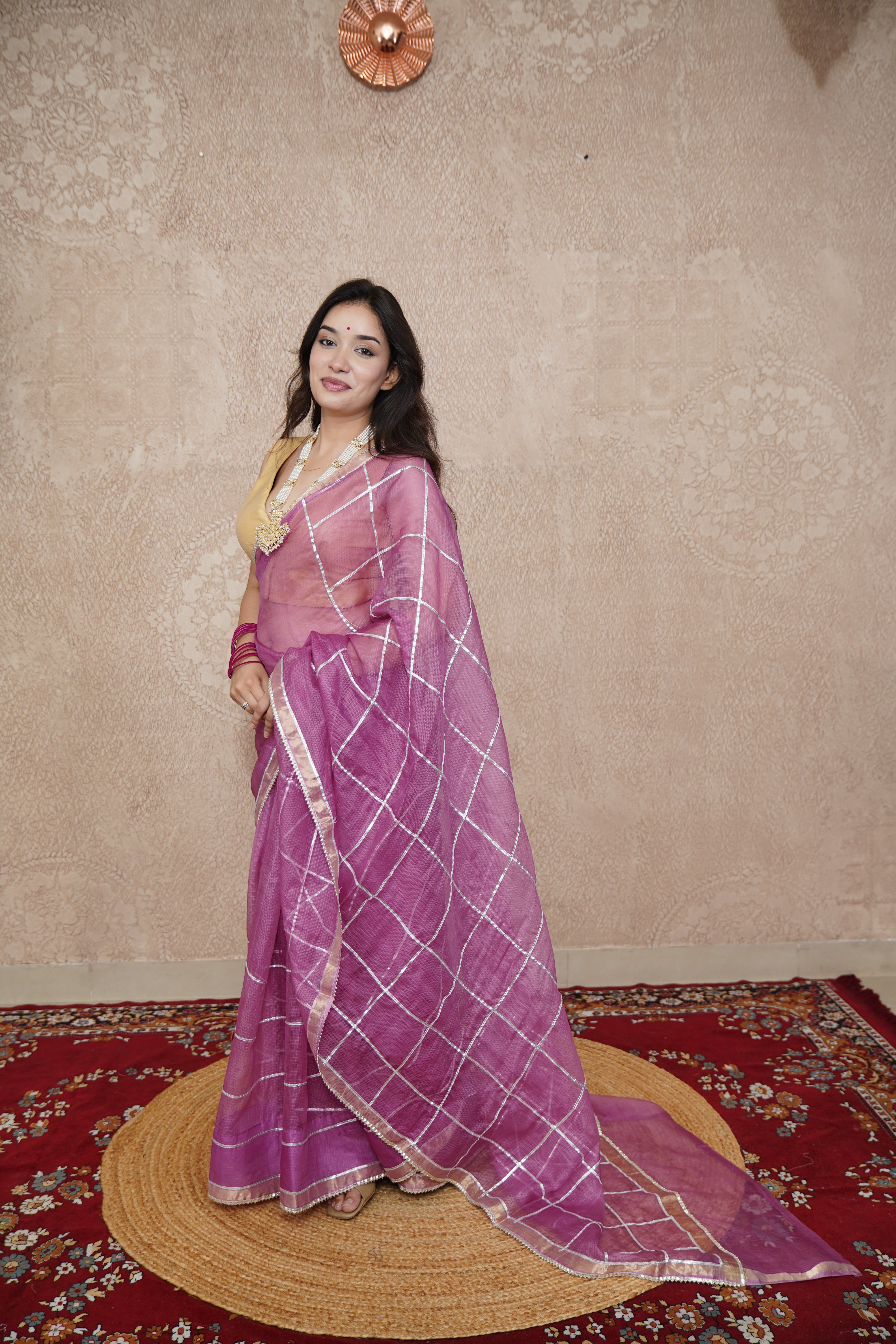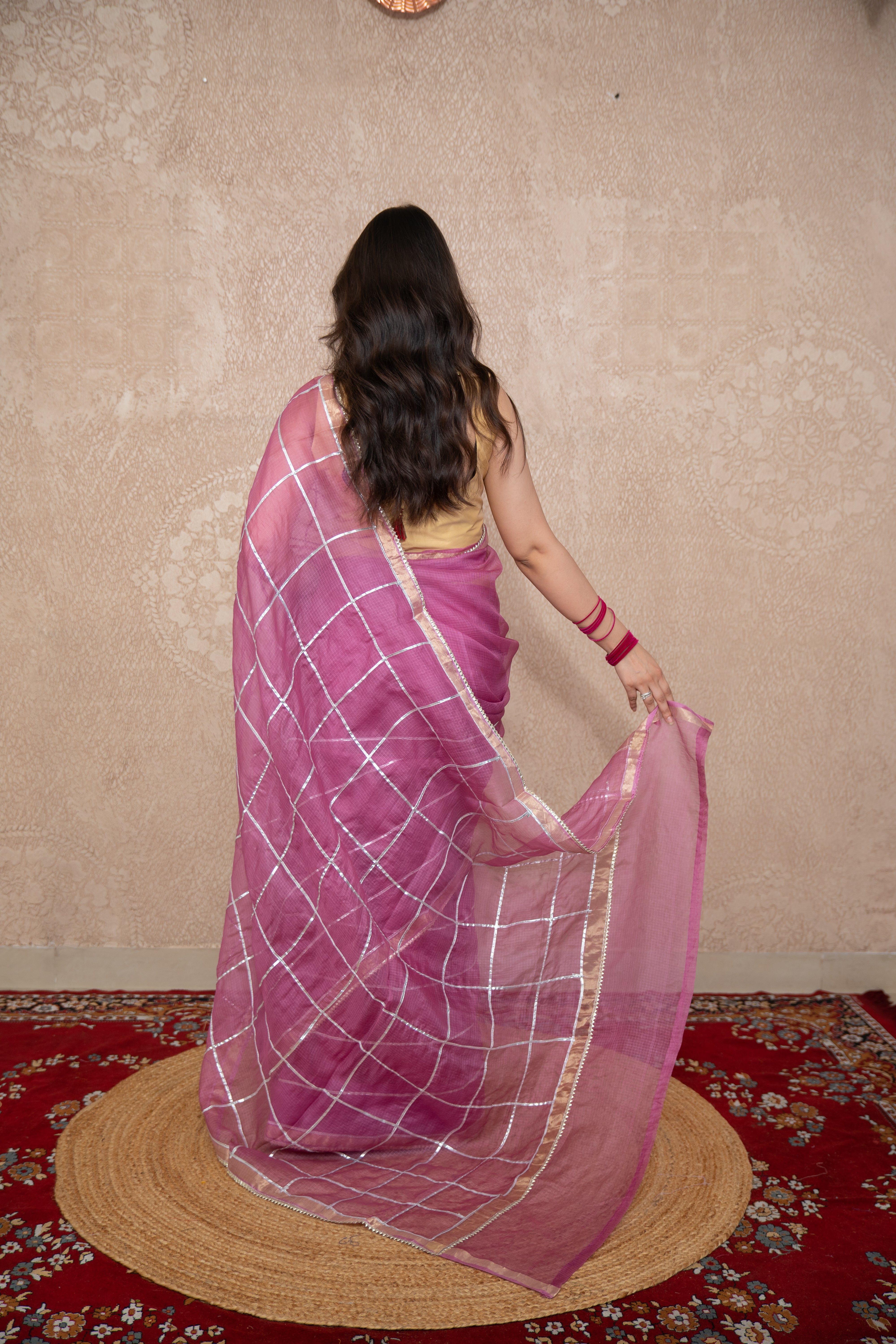 The highlight of the saree is its meticulously crafted checks gota patti work on the pallu, adding a regal touch to your ensemble. The intricate patterns reflect the rich heritage of Indian artisanship, ensuring you stand out with a unique and tasteful style. Each element of the design is carefully hand-finished, making this saree a masterpiece of craftsmanship.