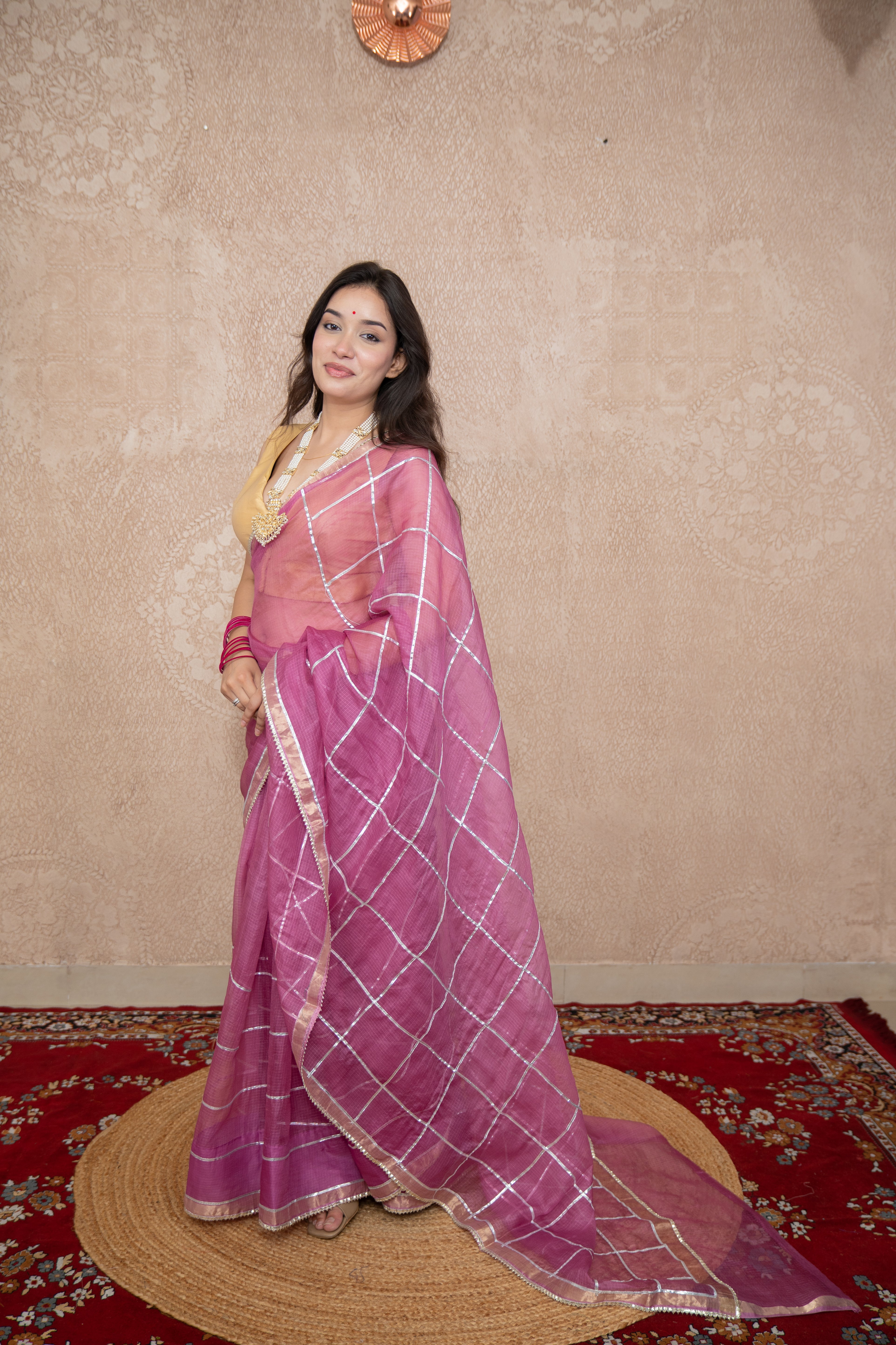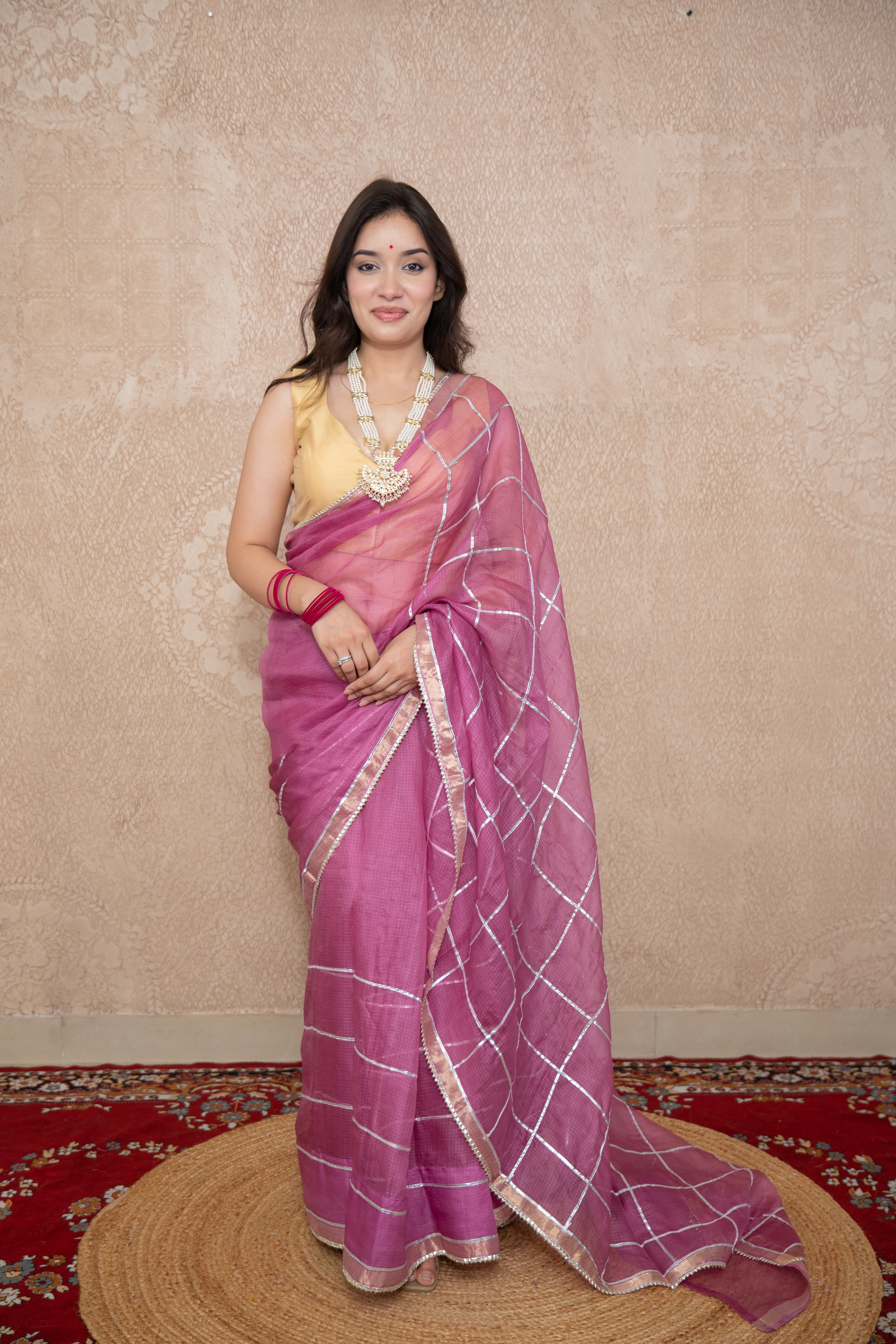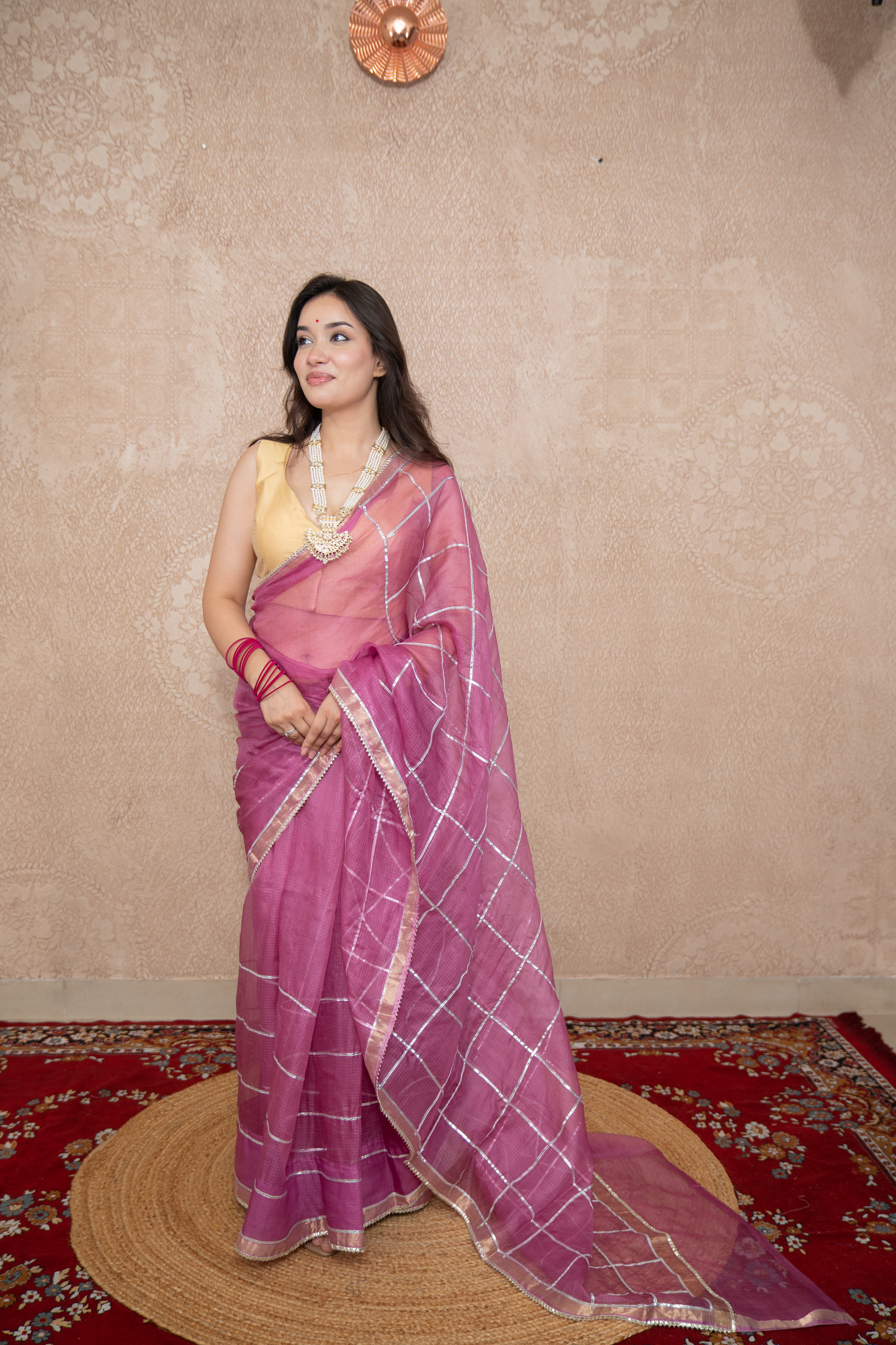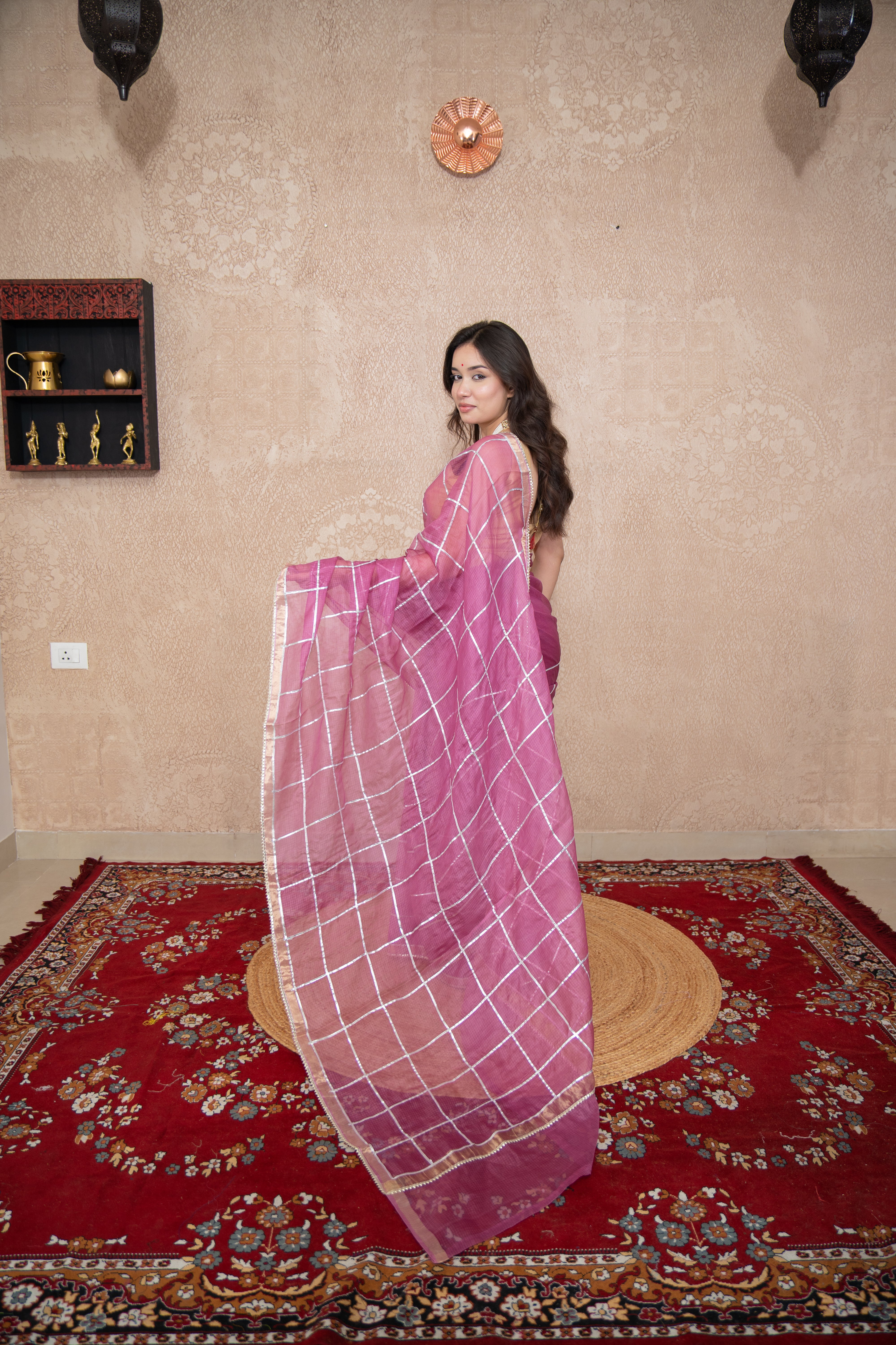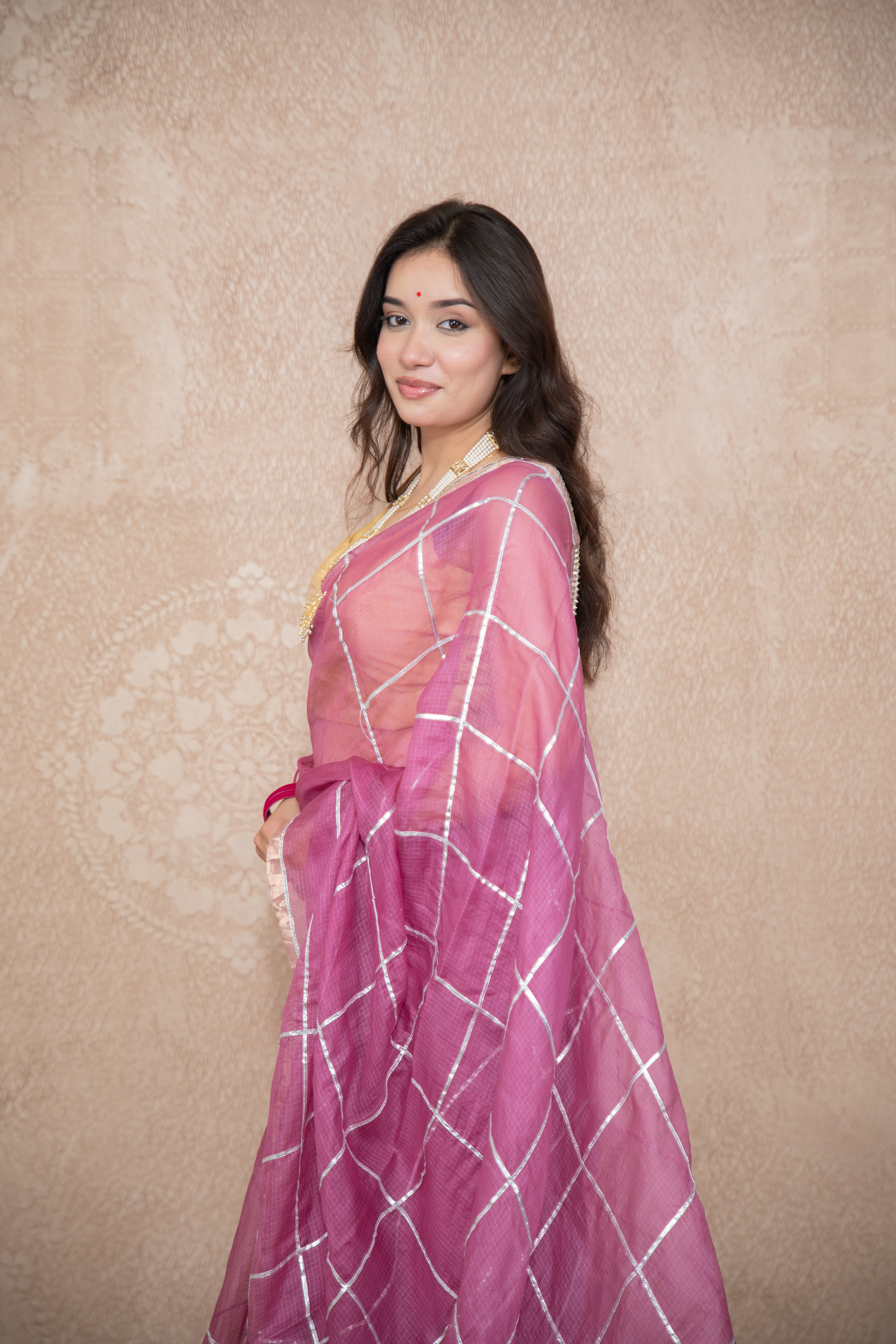 Be it weddings, festivals, or parties, the Arpita Pink Striped Gota Work Kota Doria Silk Saree ensures you exude grace and confidence. Pair it with statement jewelry and a chic clutch to create a show-stopping look that turns heads.