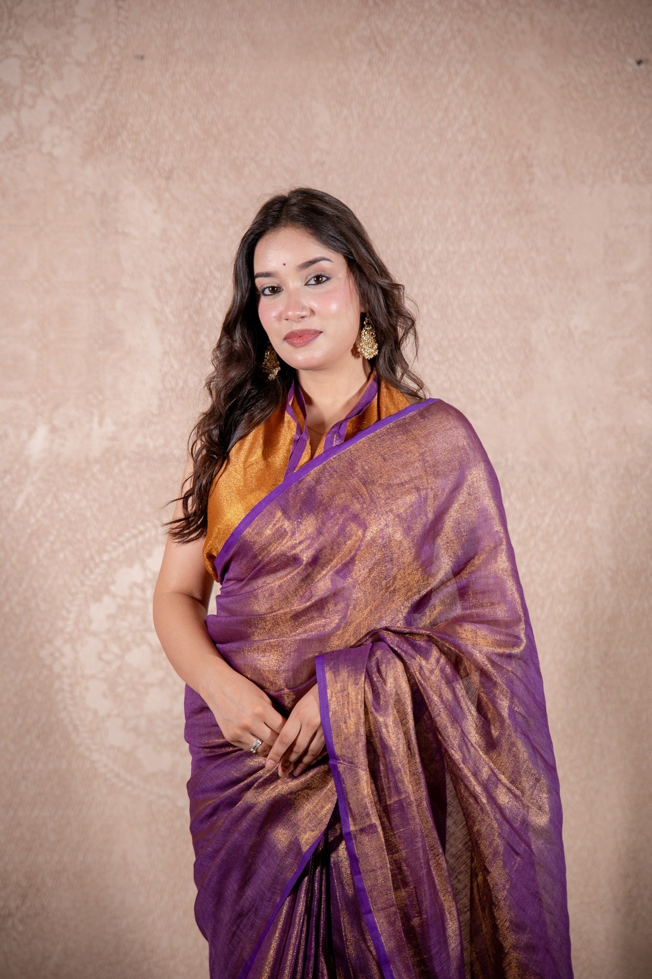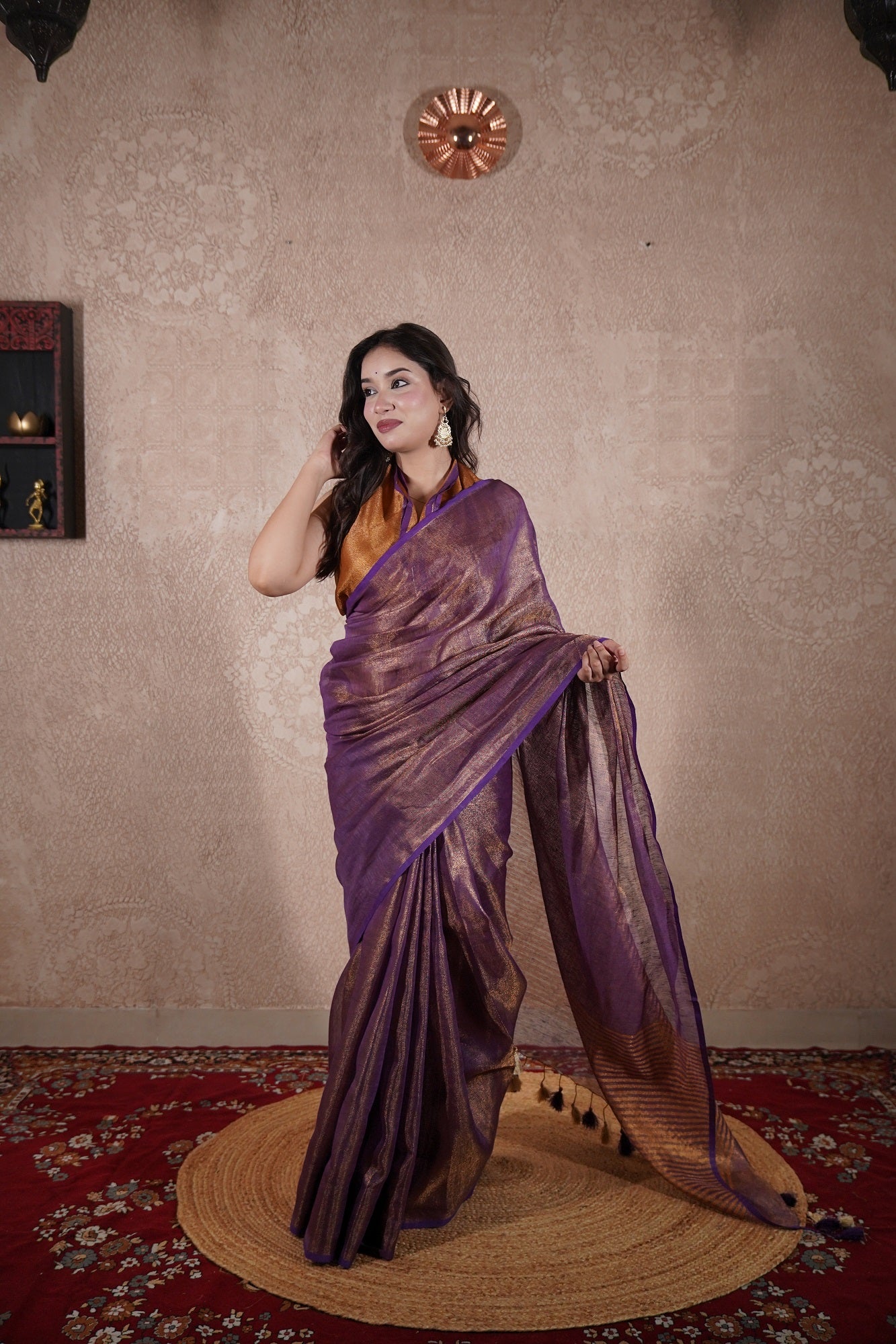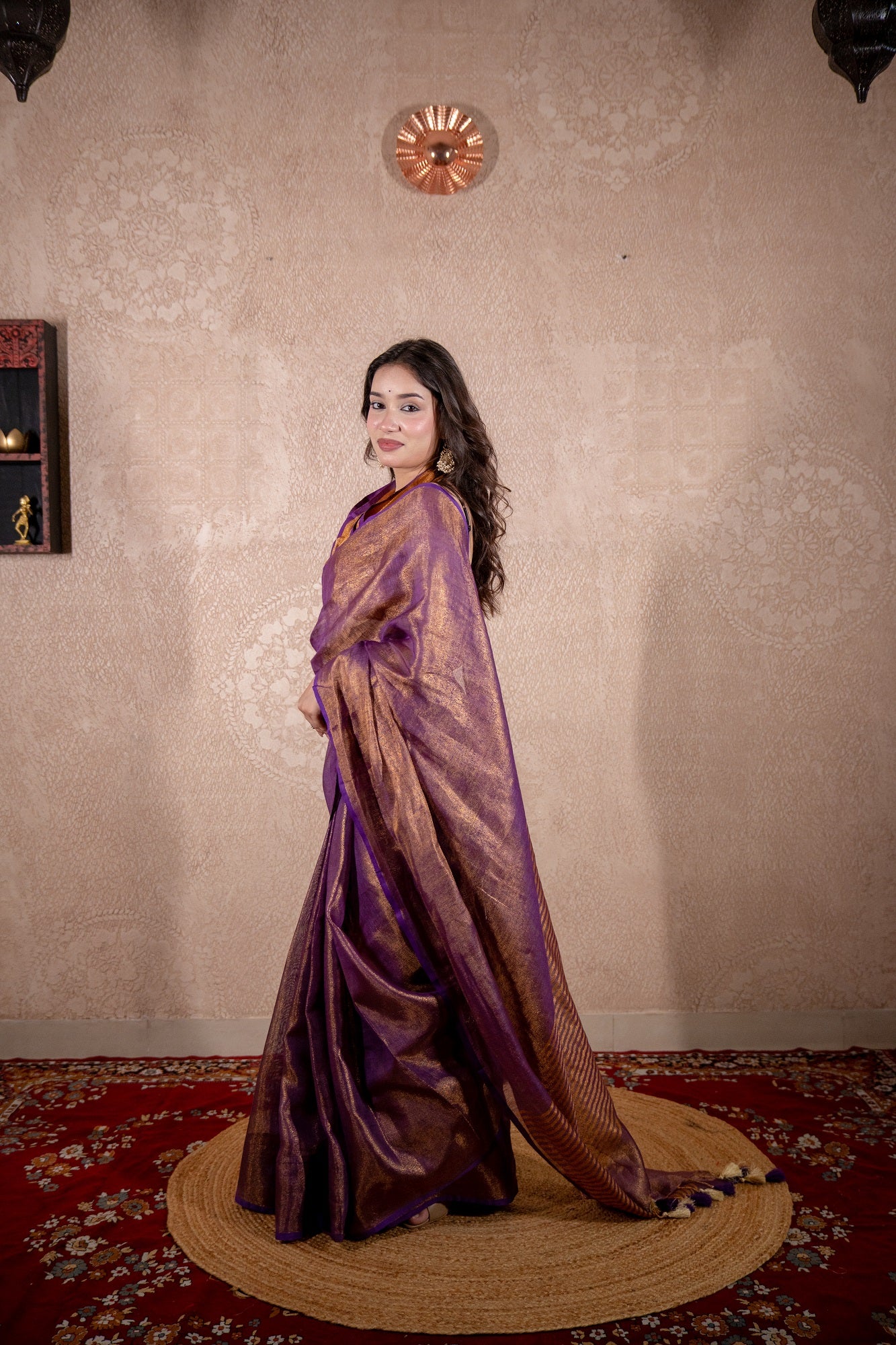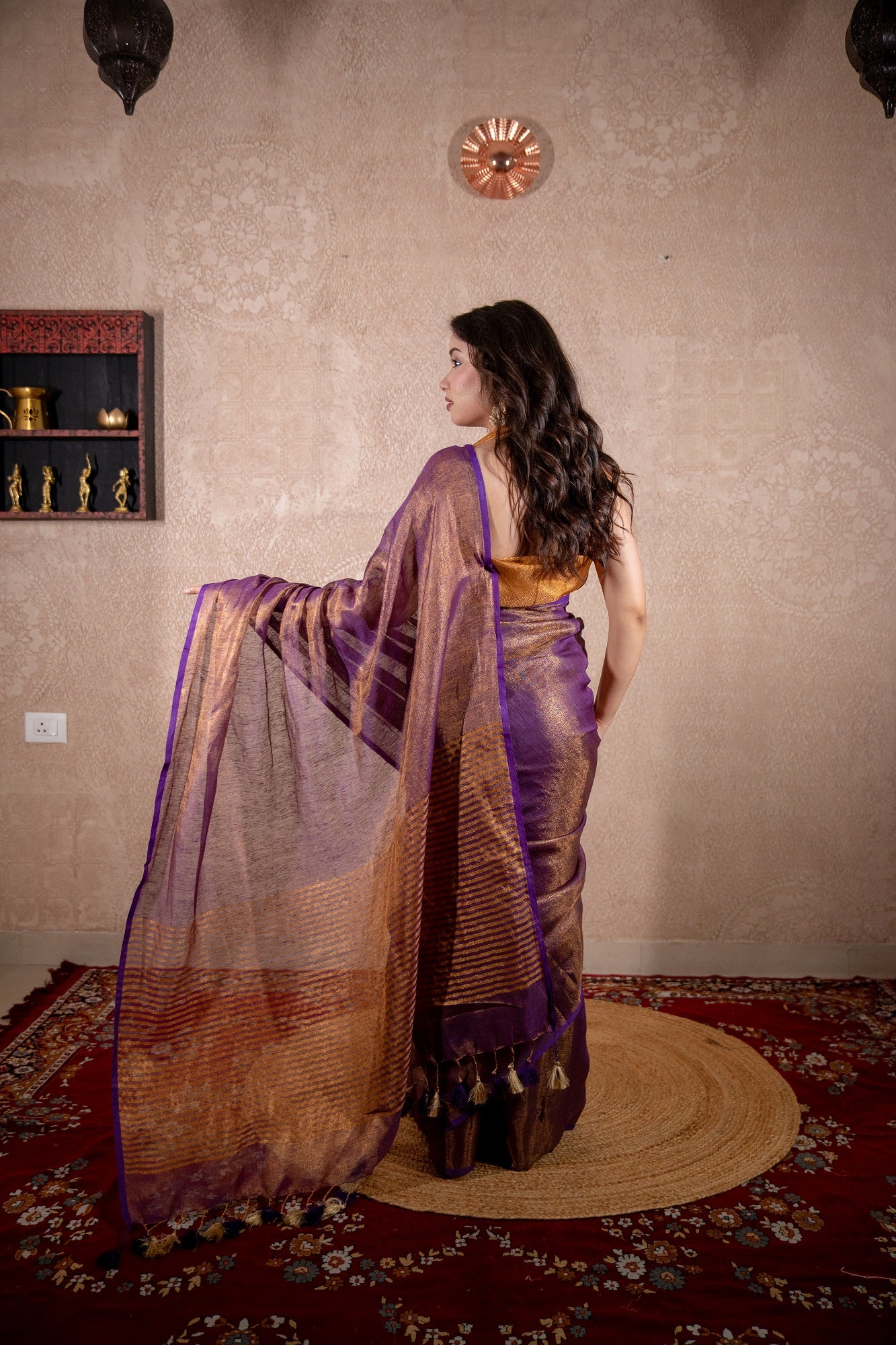 Bold, graceful, and inherently regal—Asmi is a stunning Purple Saree with a Striped Pallu, designed for those who love to carry tradition with quiet strength. A signature piece from our "Sone ki Abha" collection, Asmi is perfect for festive evenings, elegant gatherings, or cultural celebrations that call for timeless charm.