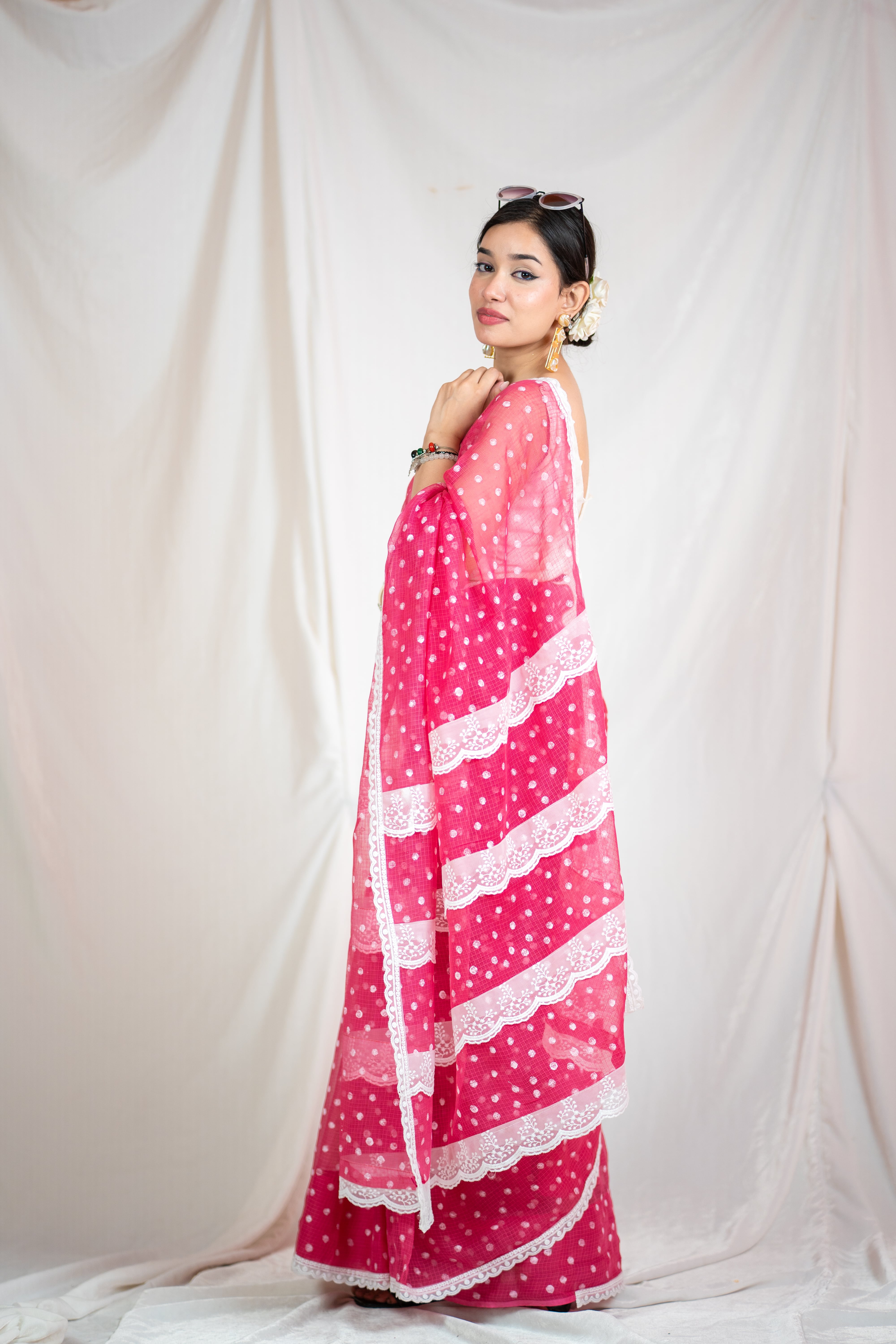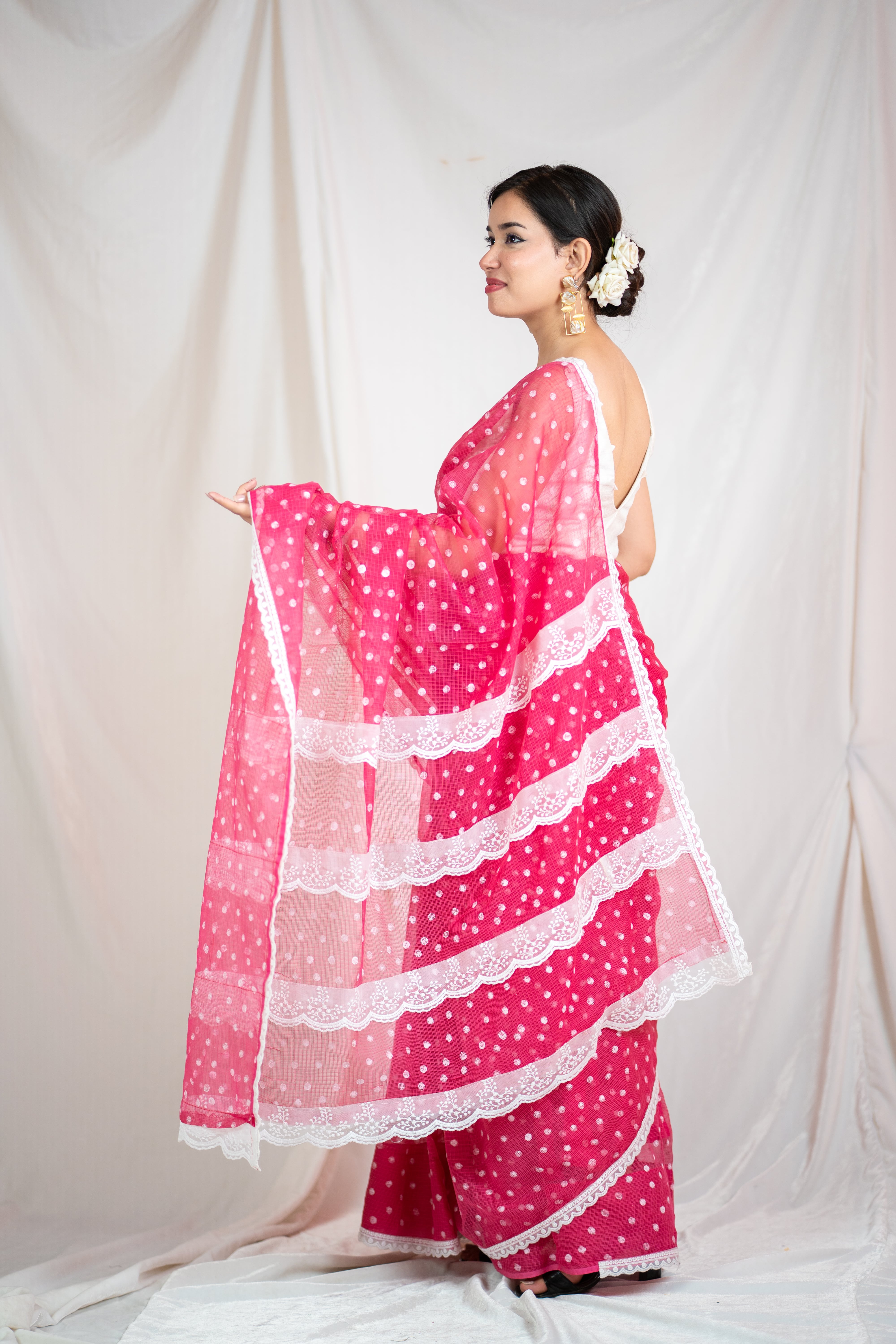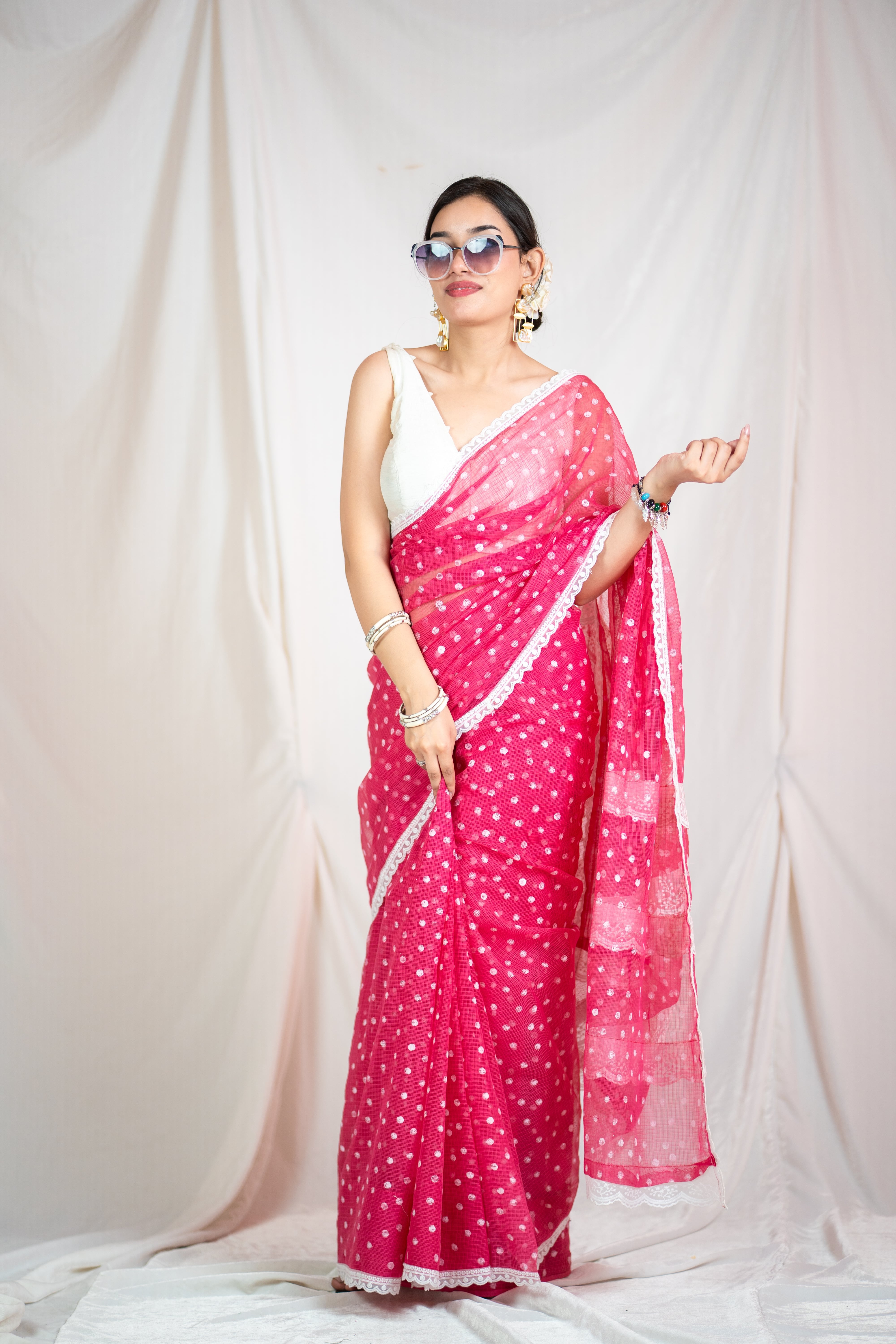 Elevate your style with the enchanting Bindu Re Bindu Pink Kota Doria saree. Crafted from premium quality pure cotton, this saree boasts a lightweight and breathable fabric that drapes beautifully. Adorned with white polka dots all over, it exudes a charming retro vibe that is both timeless and sophisticated.