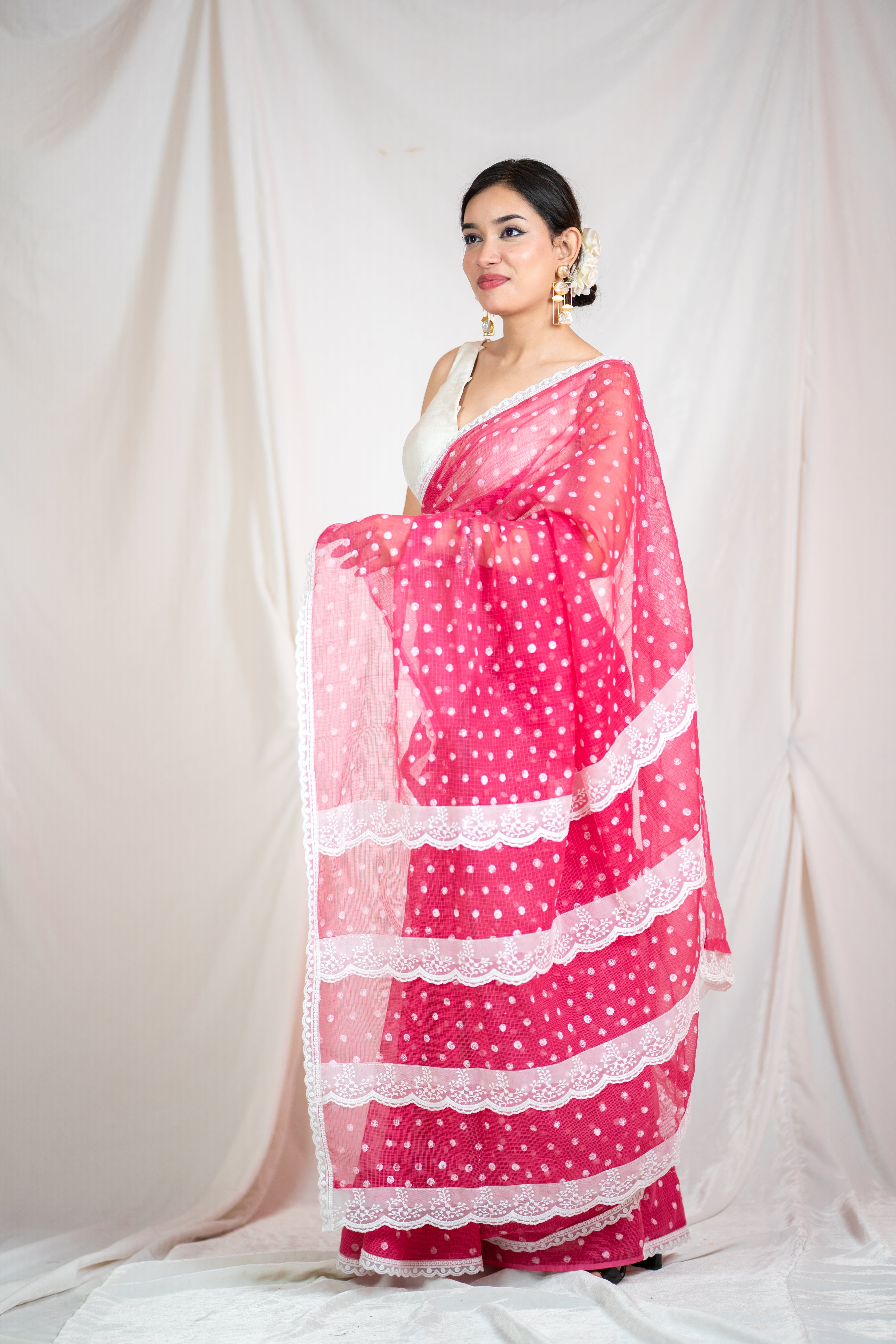 Enhancing its allure, delicate white lace detailing adorns the pallu, adding a touch of grace and femininity. The saree is elegantly finished with a fine white lace edge, showcasing exquisite craftsmanship and attention to detail.