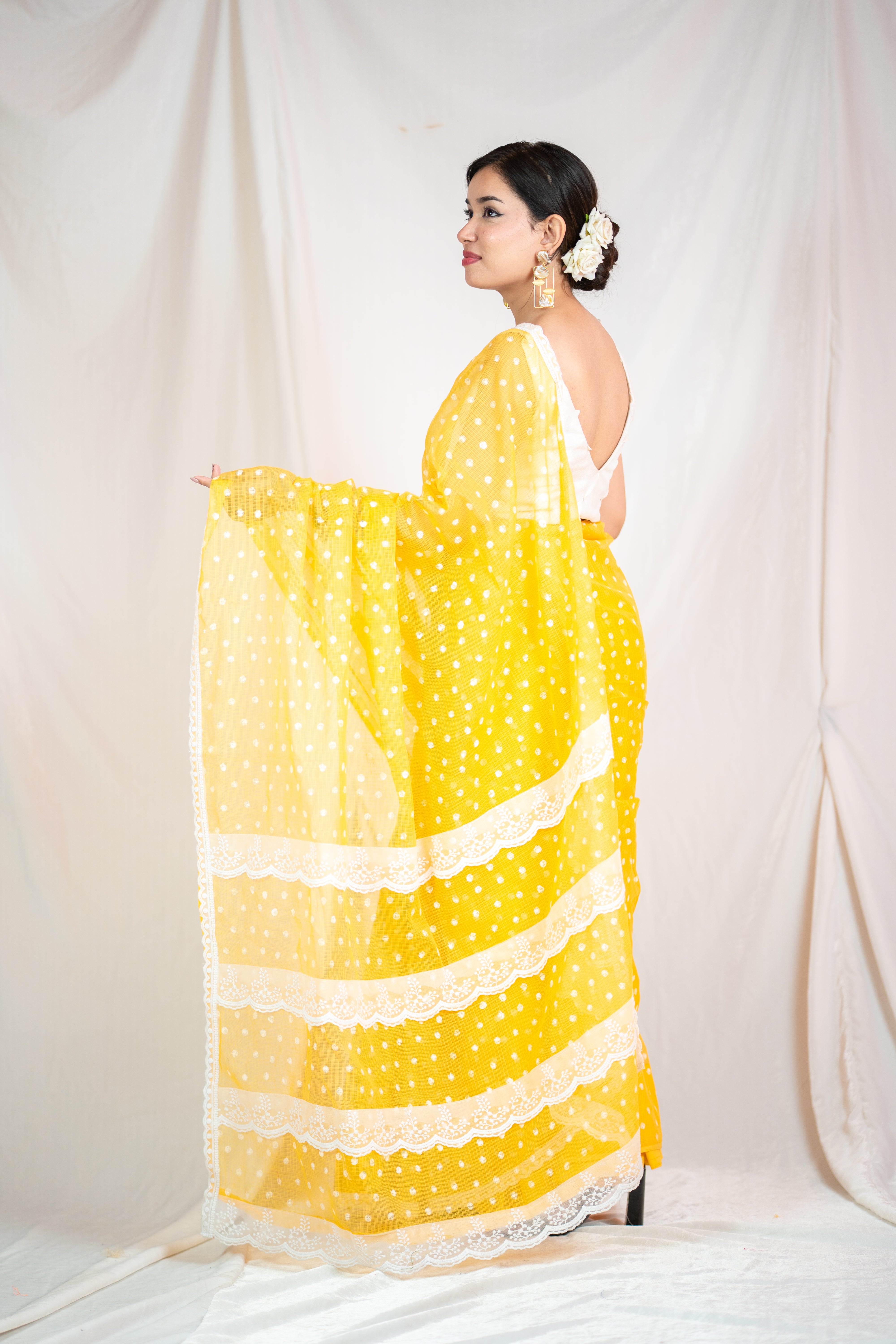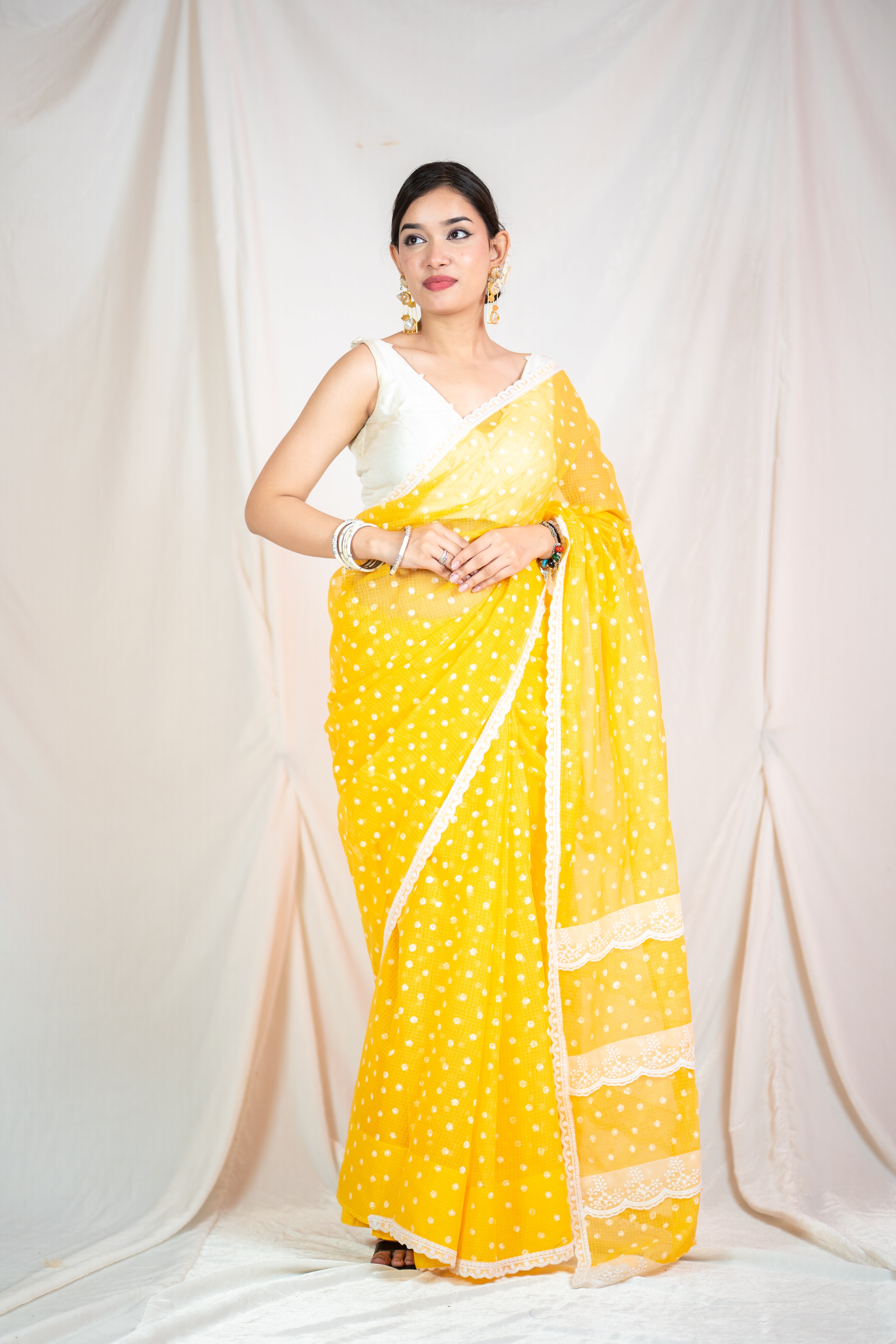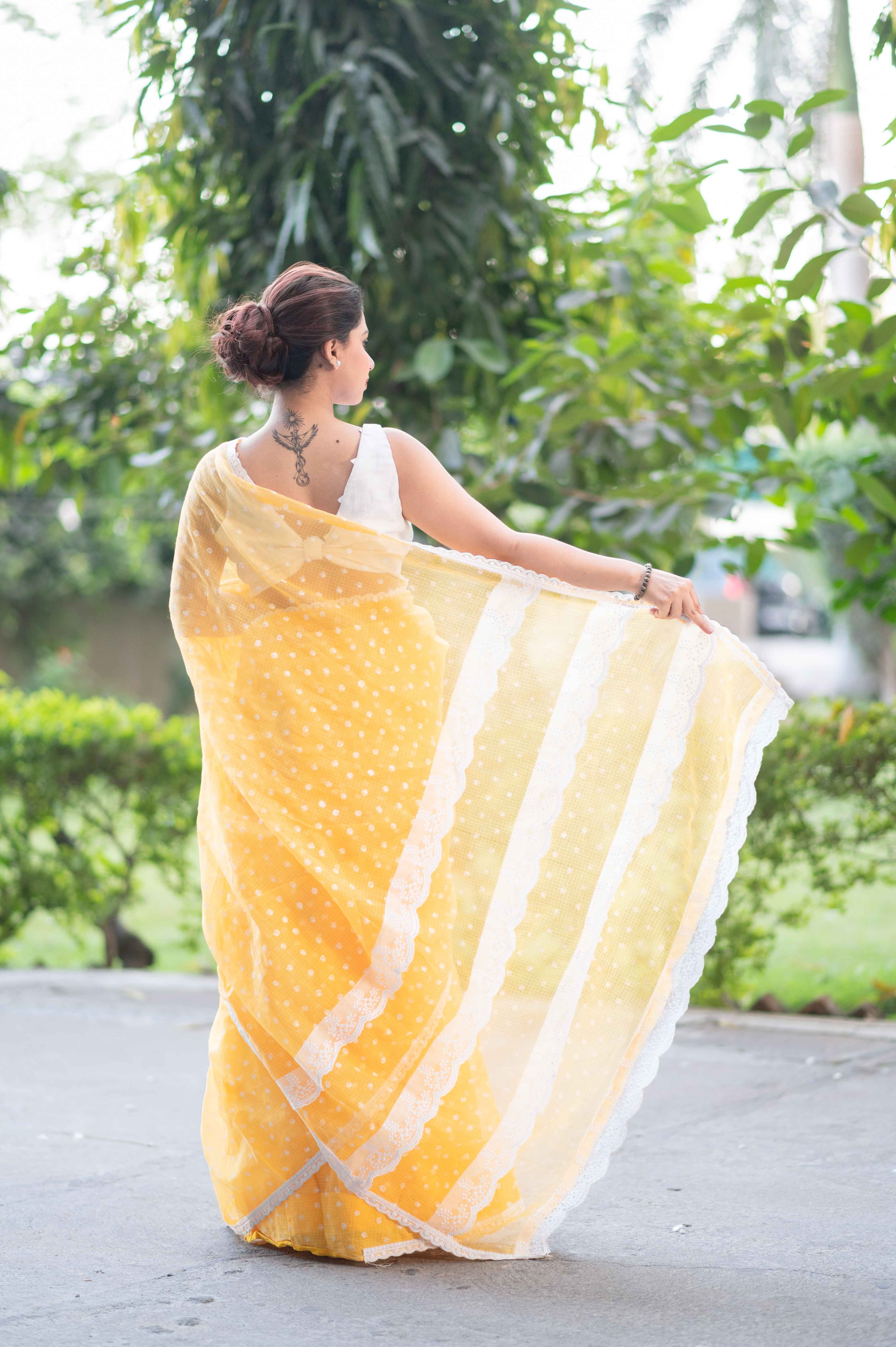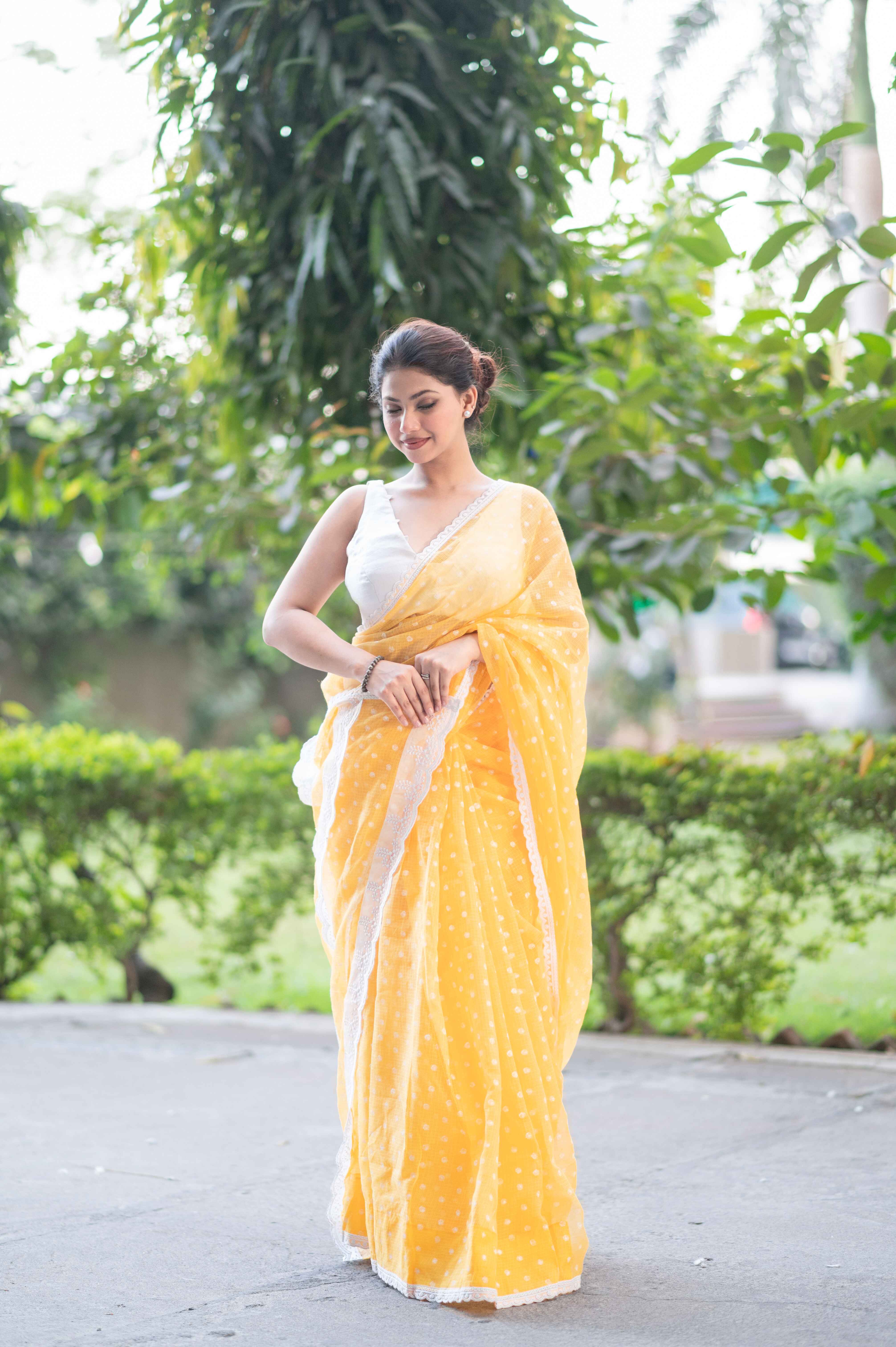 Complete with a matching yellow blouse featuring small white polka dots, this ensemble is a perfect fusion of tradition and contemporary style. Whether you're attending a special occasion or a casual gathering, this saree effortlessly captures attention and leaves a lasting impression.