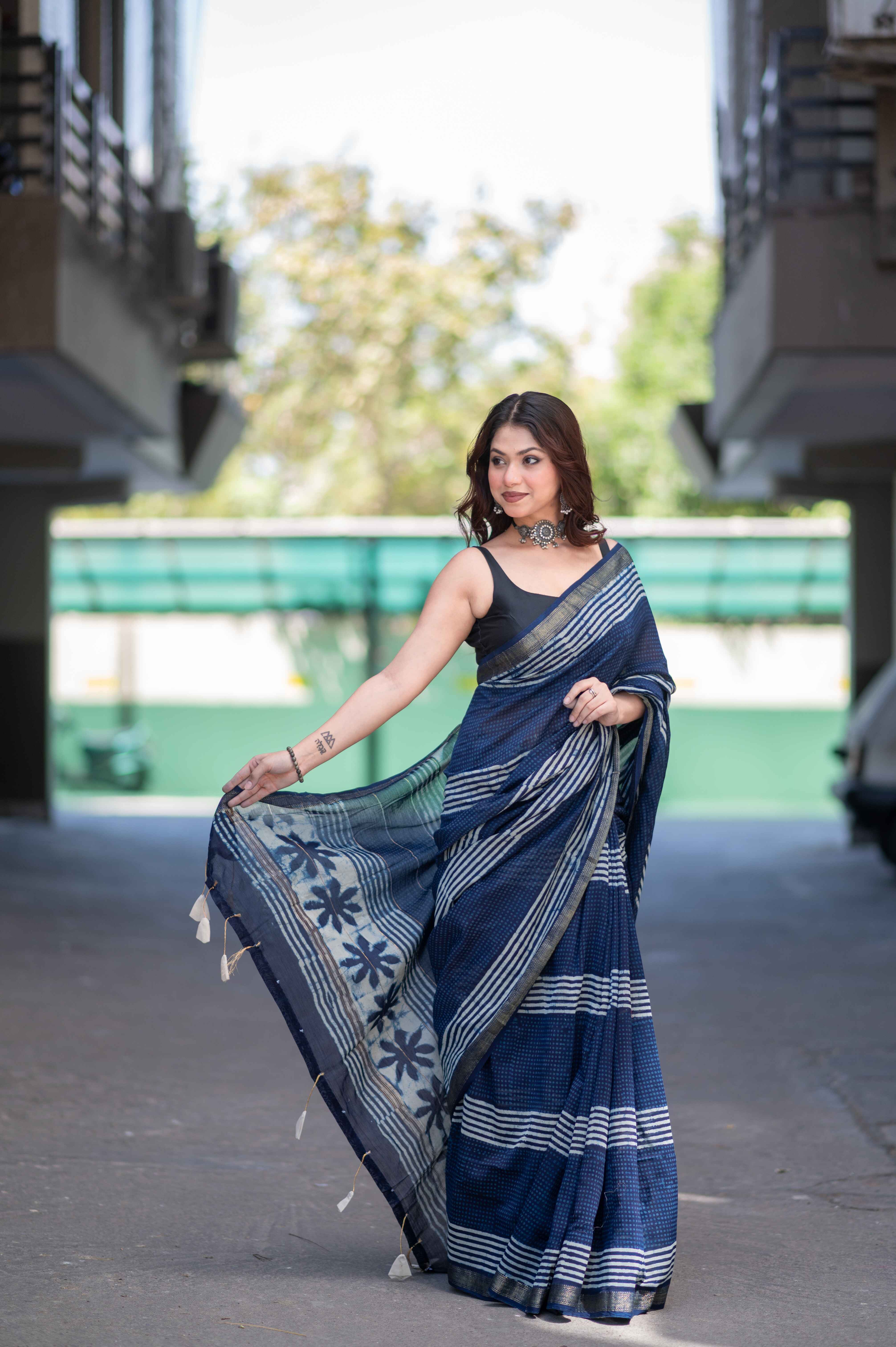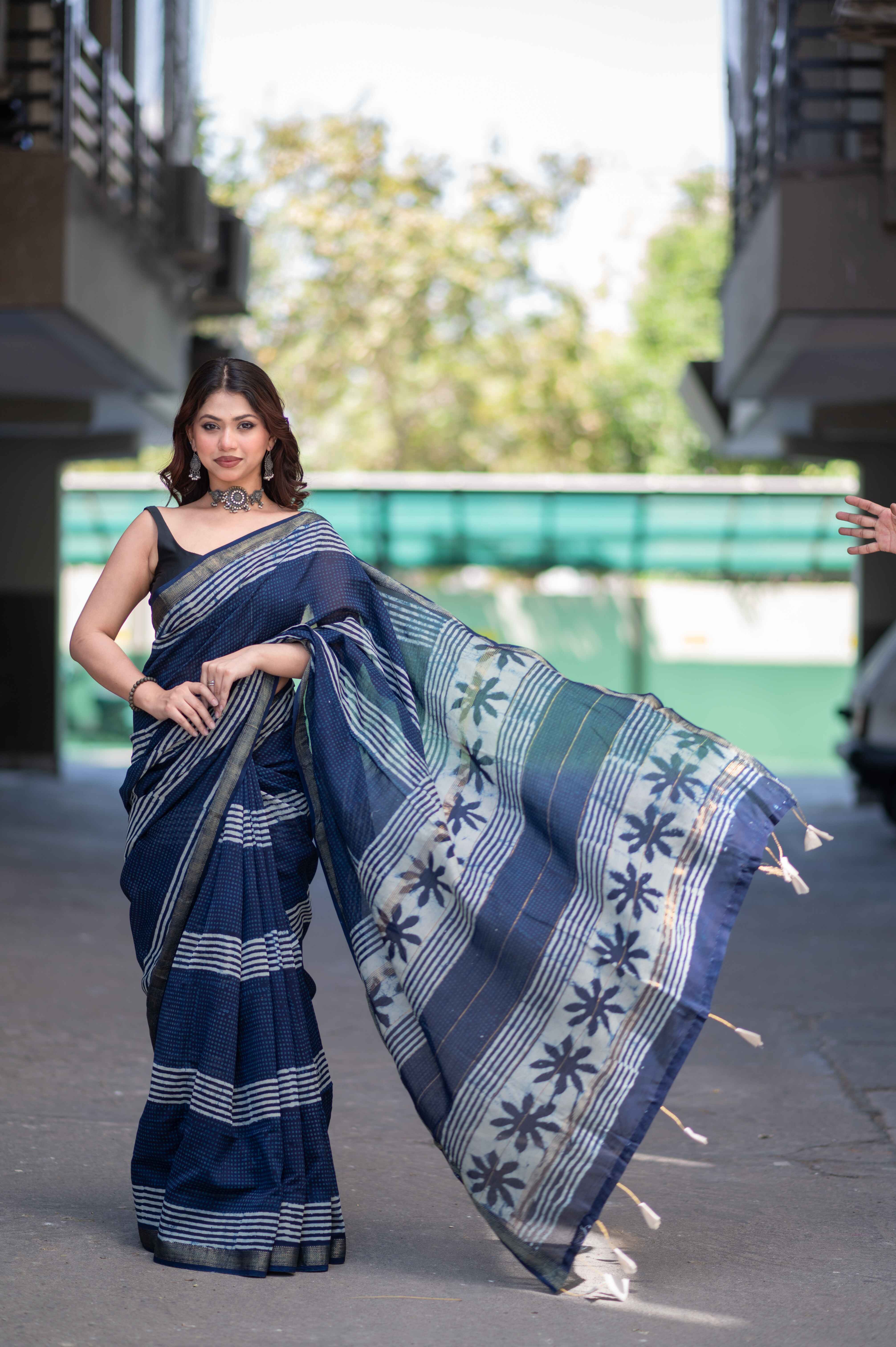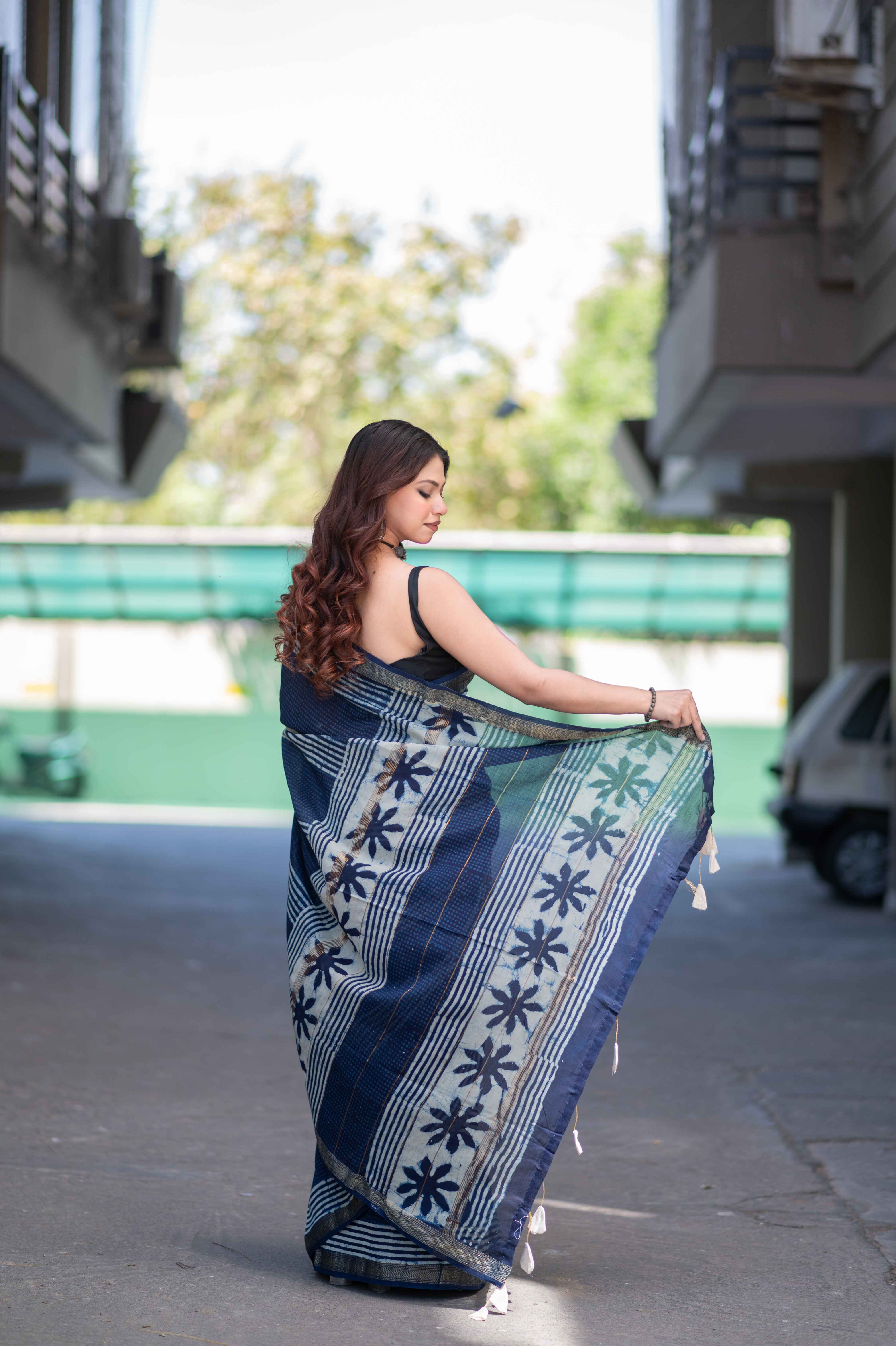 Captivated by its beauty, you envision yourself draped in its soft silk, gracefully moving through a garden blooming with indigo hues. Each thread seems to tell a story of its own, weaving together the rich heritage of Indian craftsmanship.