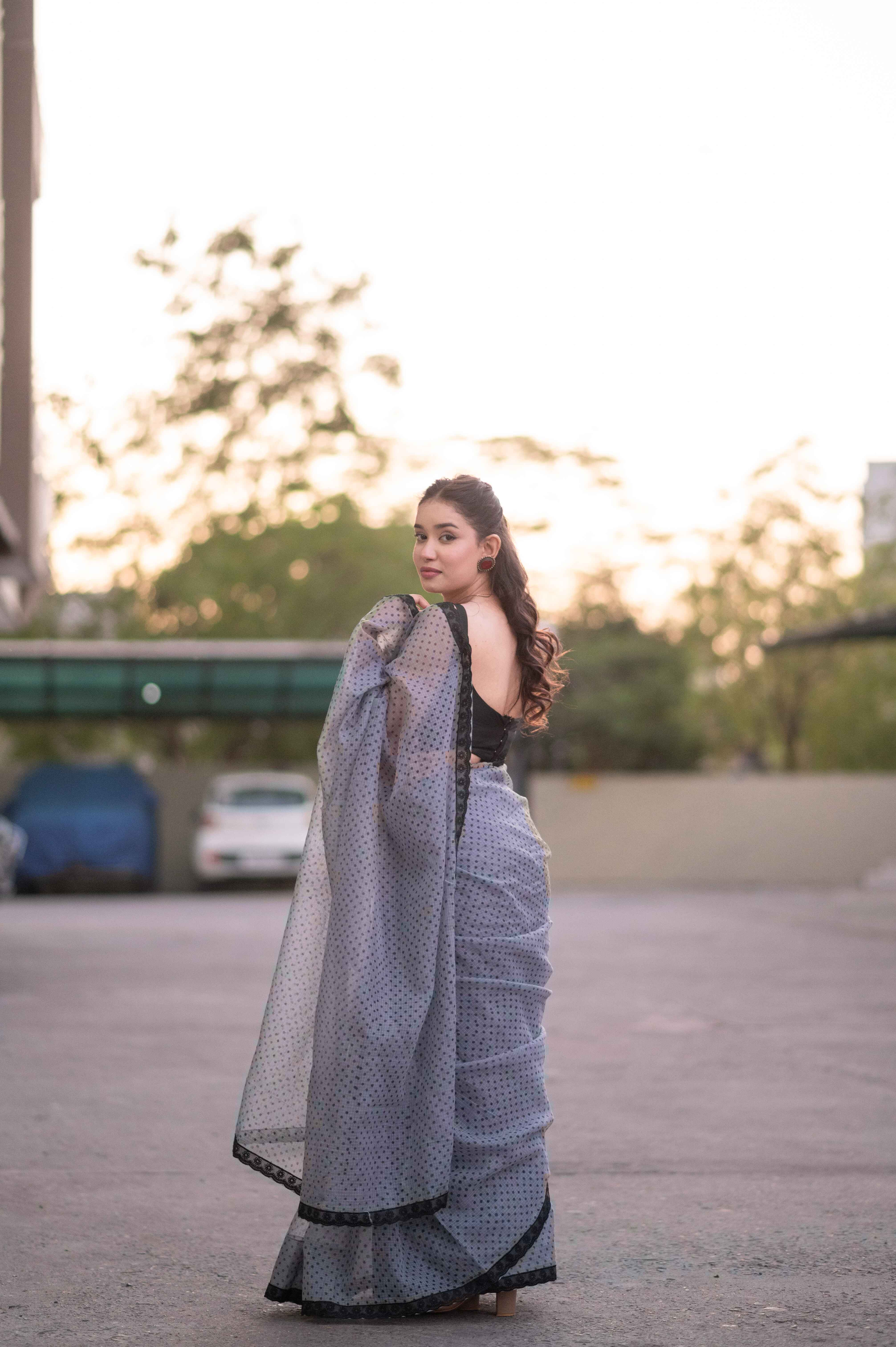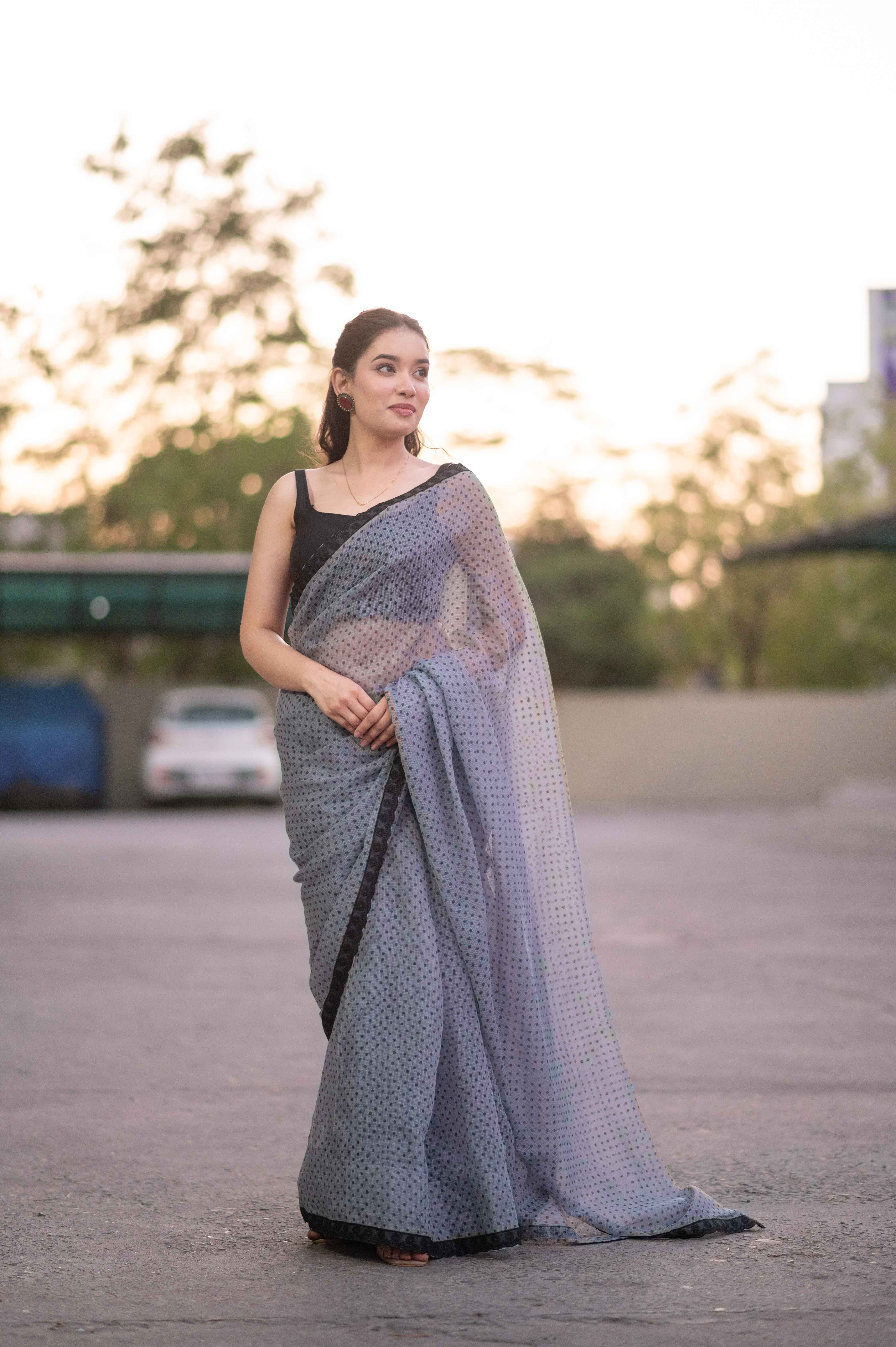 Charcoal Chic- Grey Dotted Kota Doria Saree