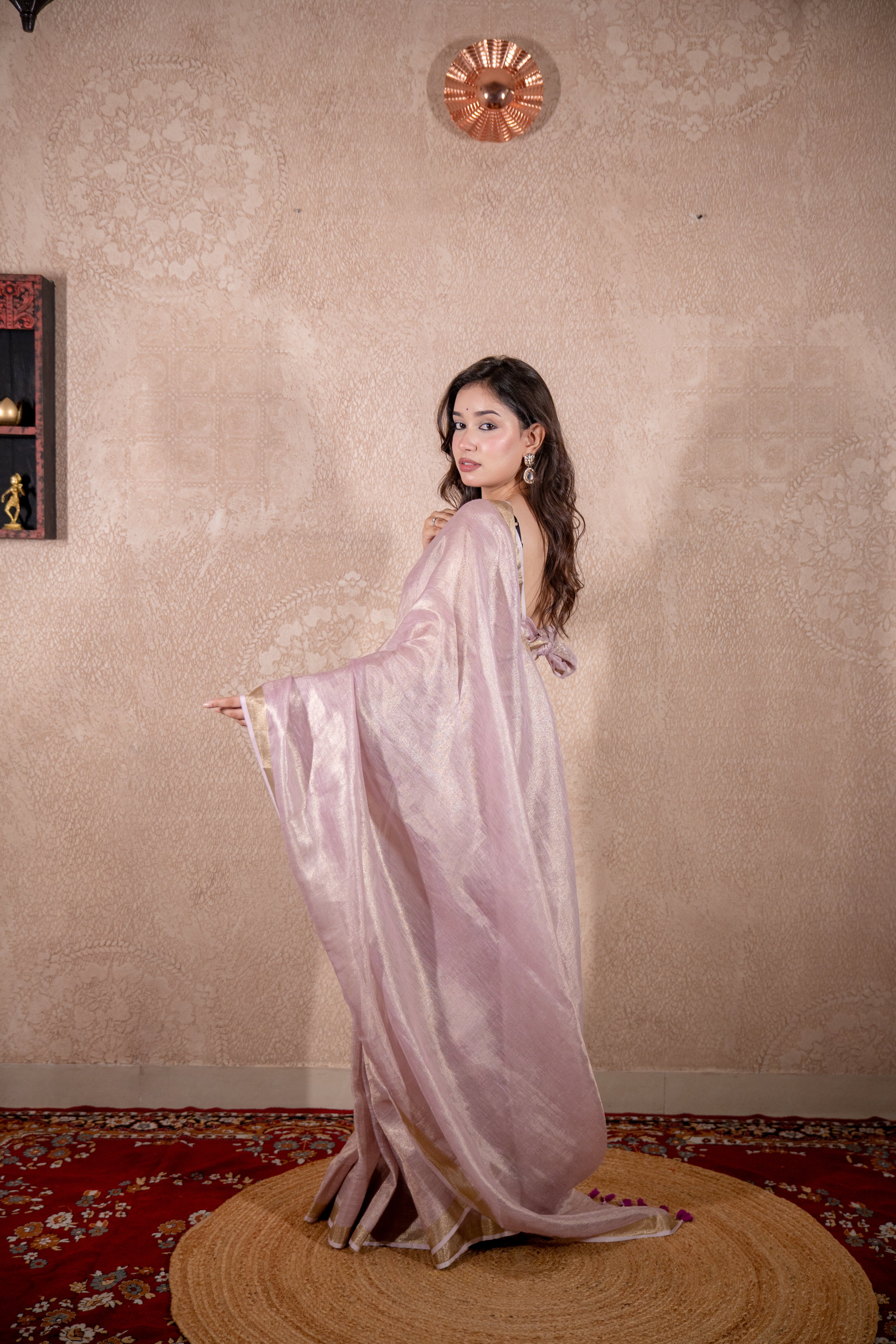 The soft lavender hue creates a serene and graceful look, while the golden border adds a traditional charm. Perfect for festive occasions, cultural events, or elegant day functions, this saree pairs beautifully with golden jewelry for a refined statement.