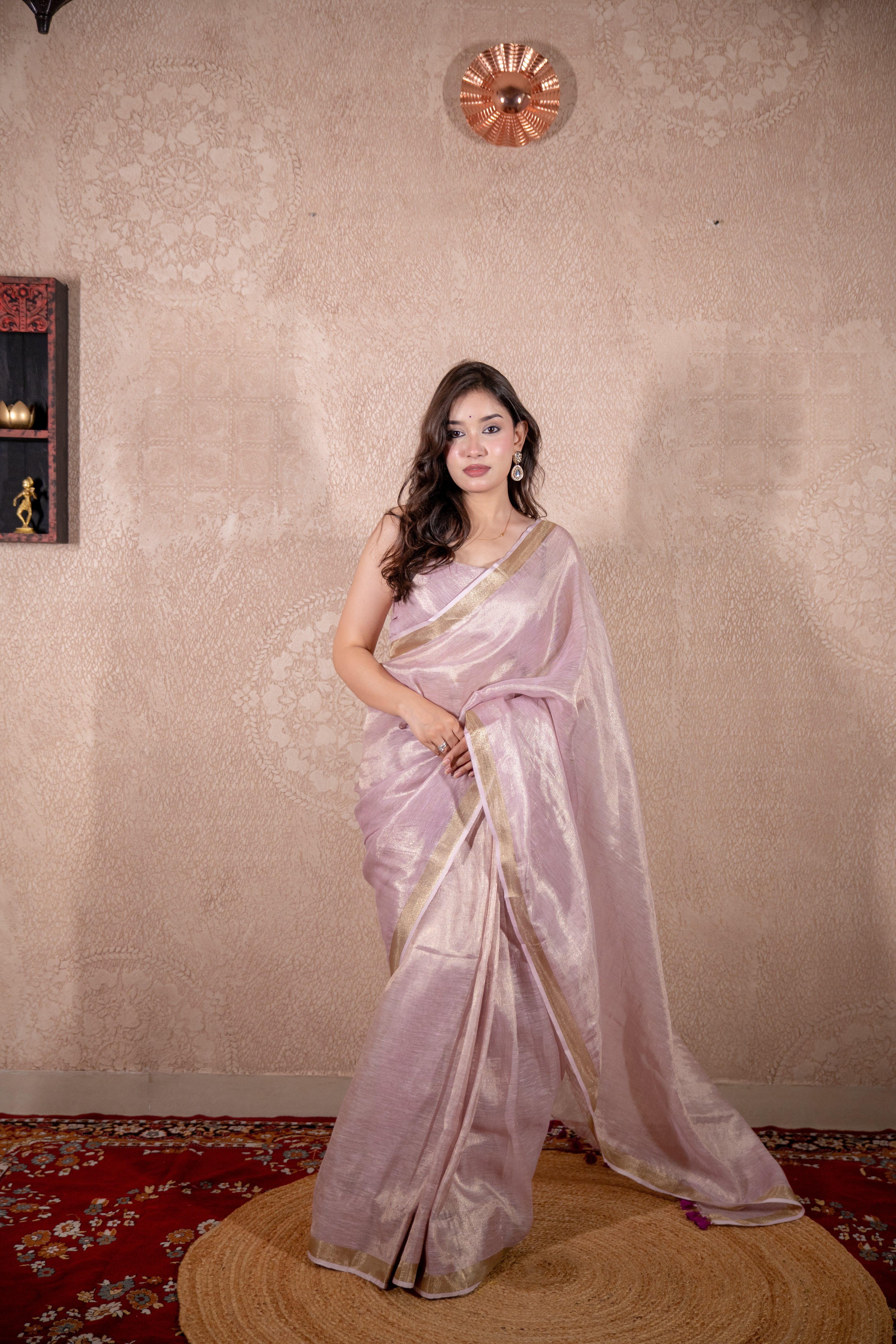 Bring a touch of understated luxury to your wardrobe with this Lavender Plain Zari Linen Saree, beautifully enhanced with a golden border. Crafted from breathable linen and adorned with delicate zari work, this saree balances simplicity with festive elegance.