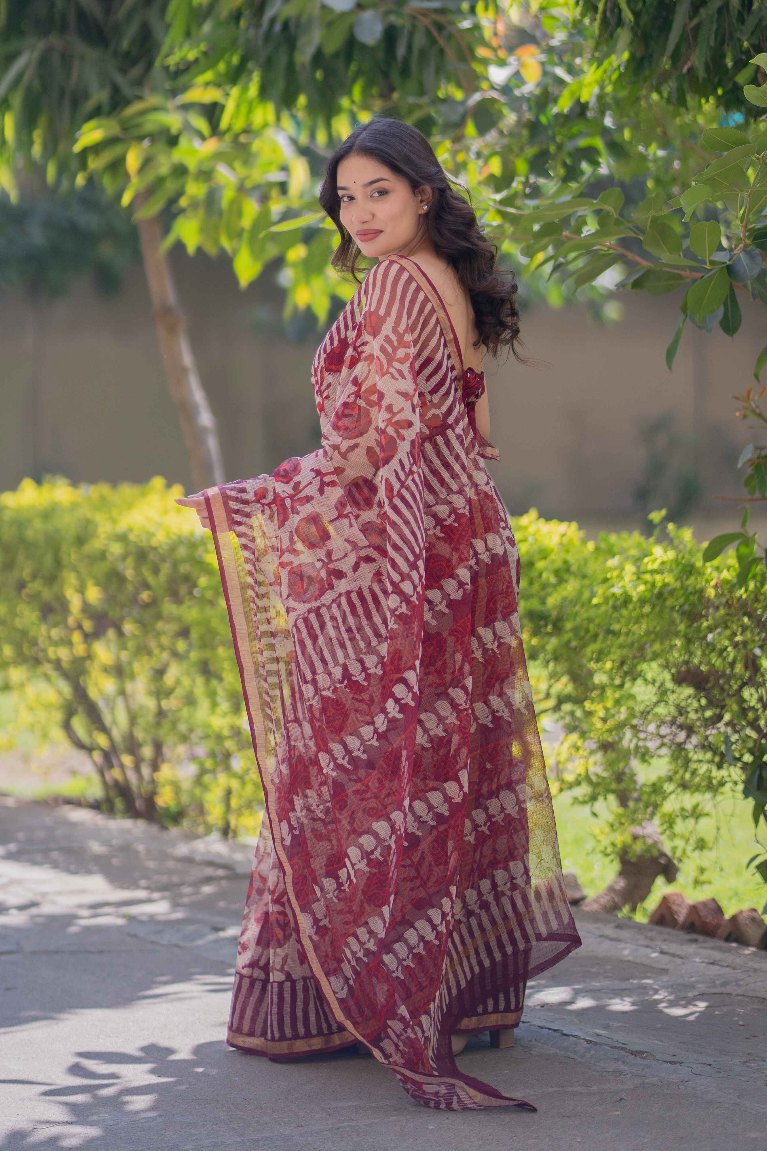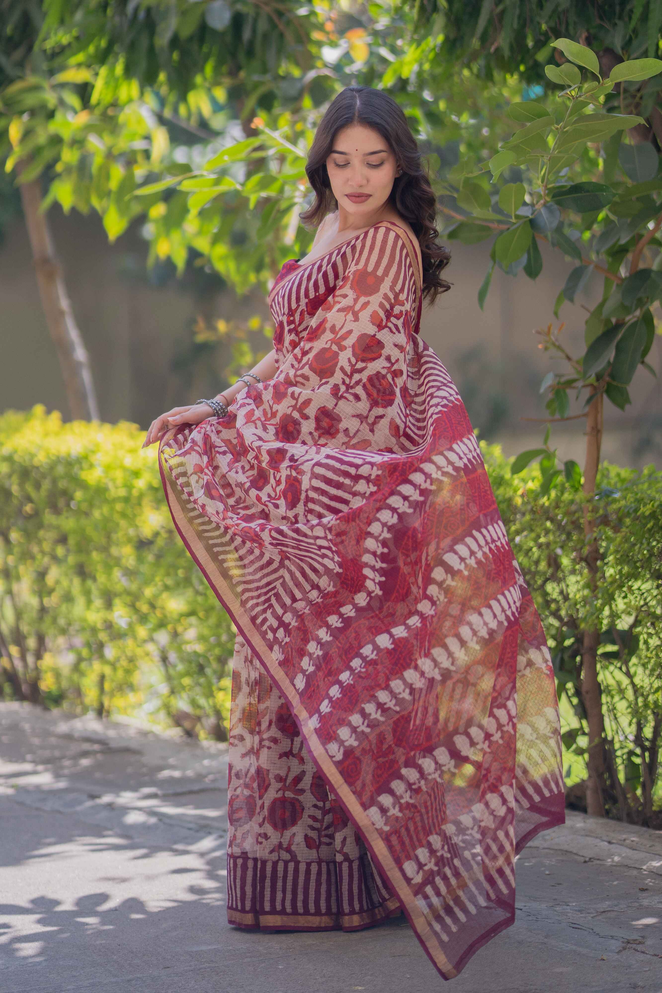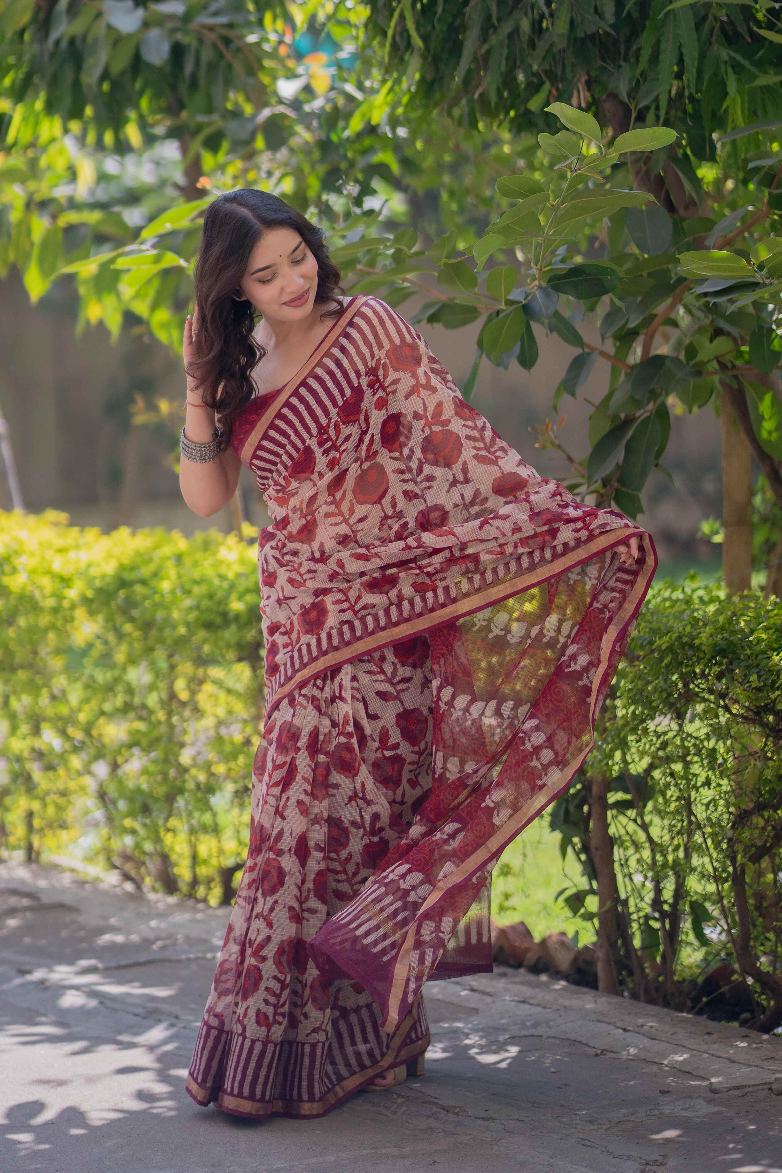 Step into elegance with Chitralekha, a timeless masterpiece from our exclusive Ashi Collection. This exquisite white Kota Doria saree, adorned with delicate maroon floral block prints, embodies the perfect blend of tradition and sophistication. Designed for women who appreciate handcrafted beauty, Chitralekha is a must-have for your wardrobe, whether for festive occasions, casual gatherings, or summer soirees.