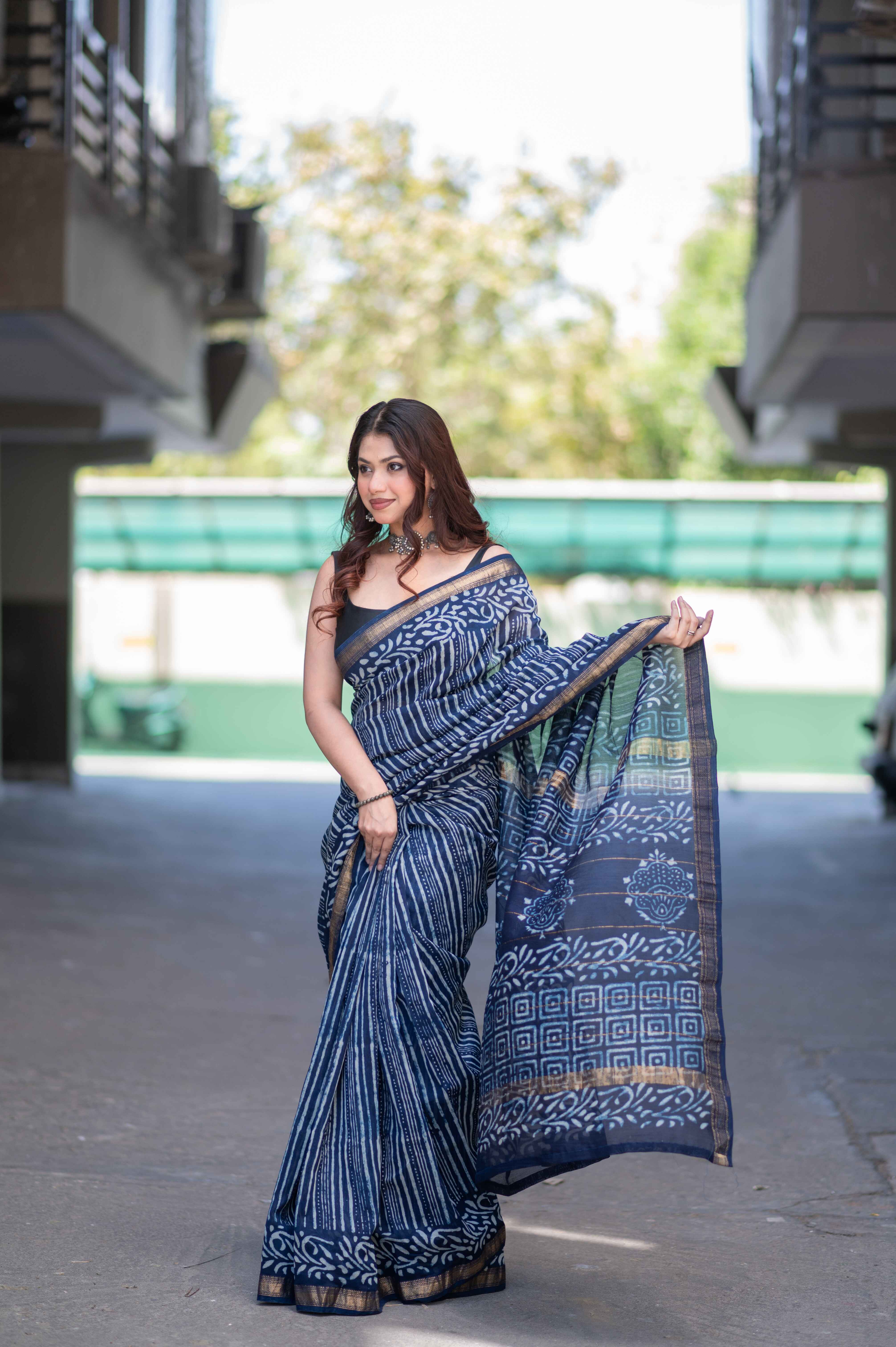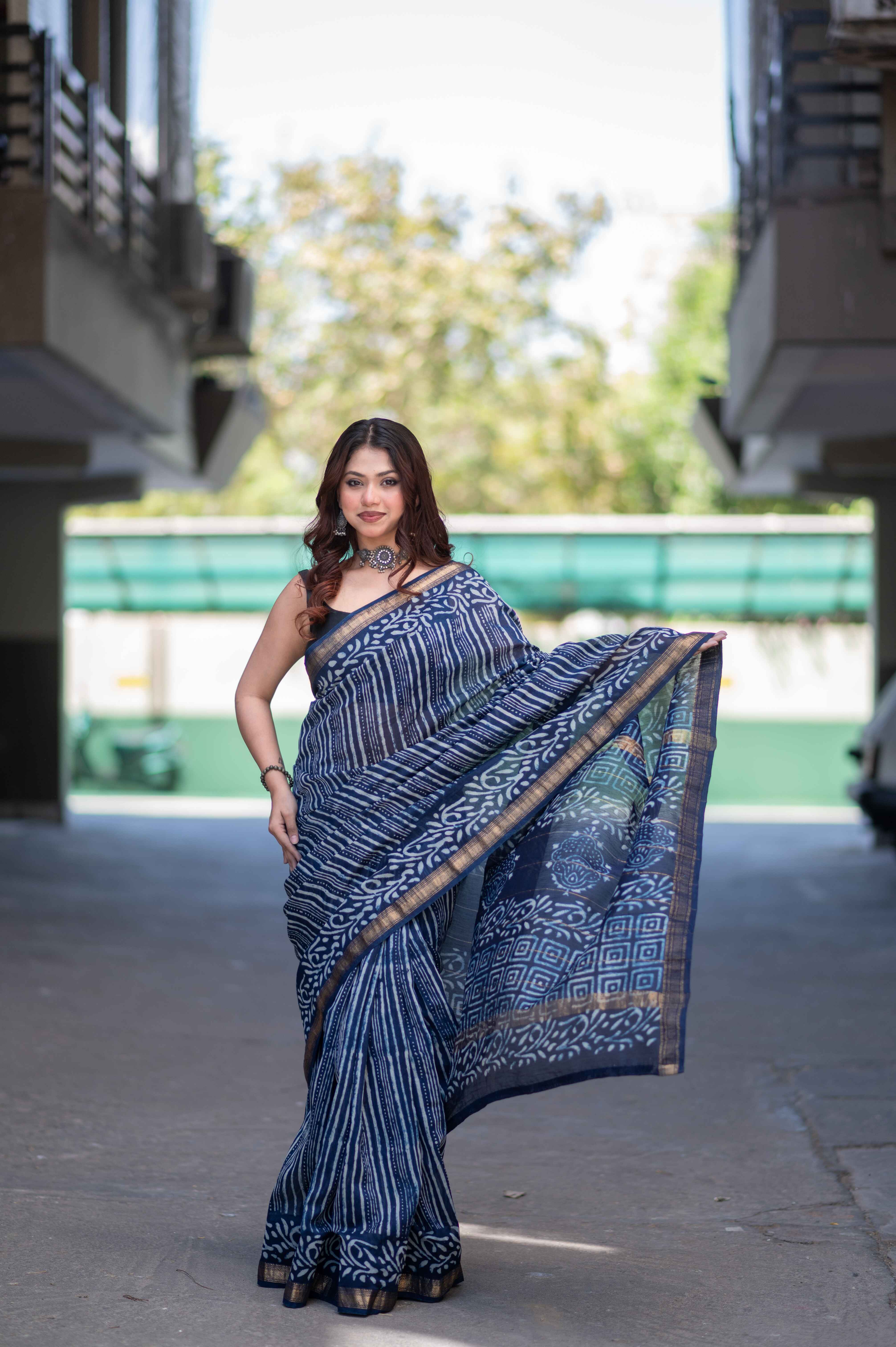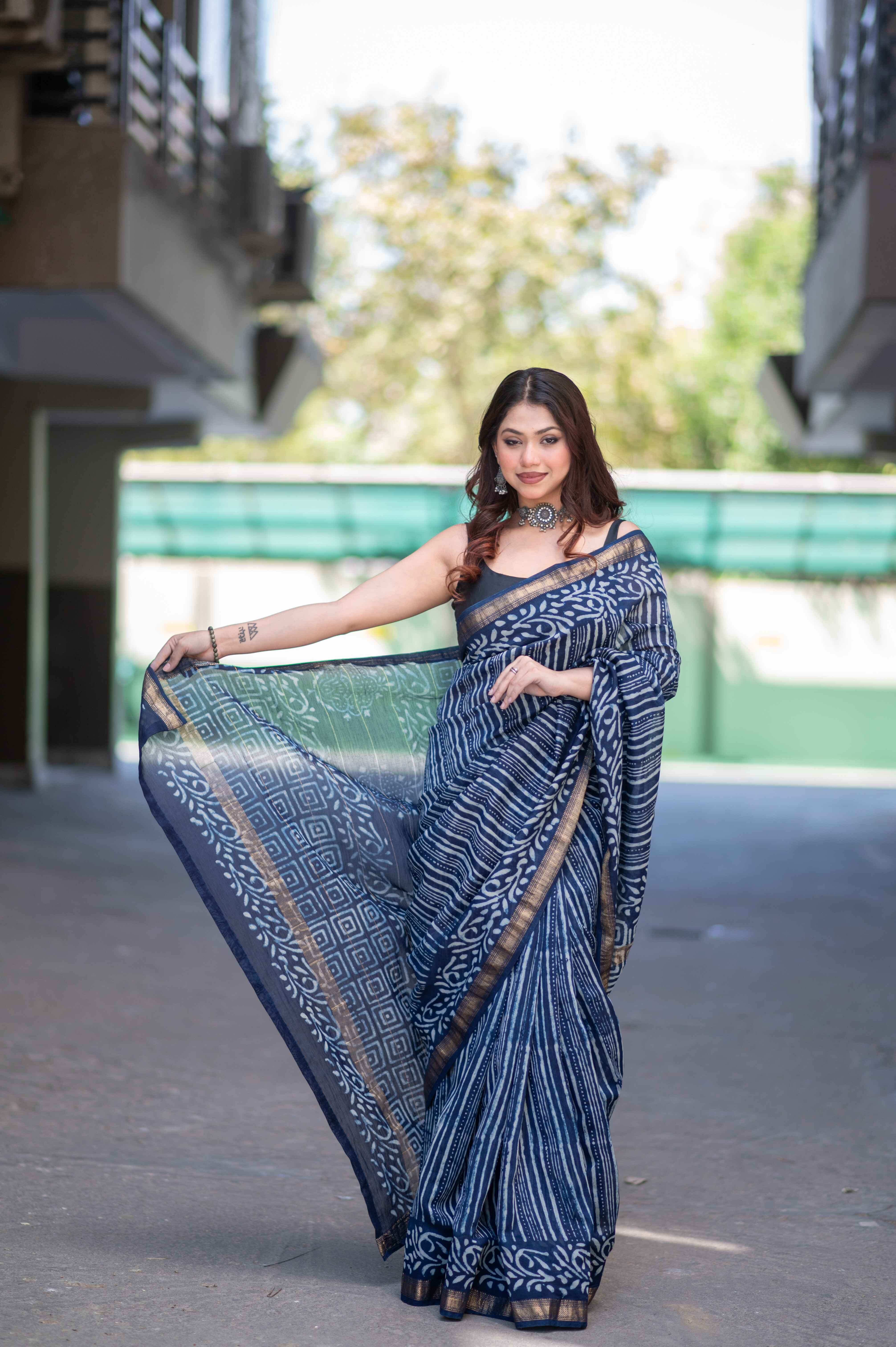 Crafted from luxurious Maheshwari Silk, this saree is a testament to skilled artistry. The ancient Dabu hand-block printing technique creates intricate patterns using eco-friendly, natural vegetable dyes. The rich Indigo hue enhances its timeless appeal, making it perfect for both festive and formal occasions. The fall and pico are done to ensure a flawless drape.