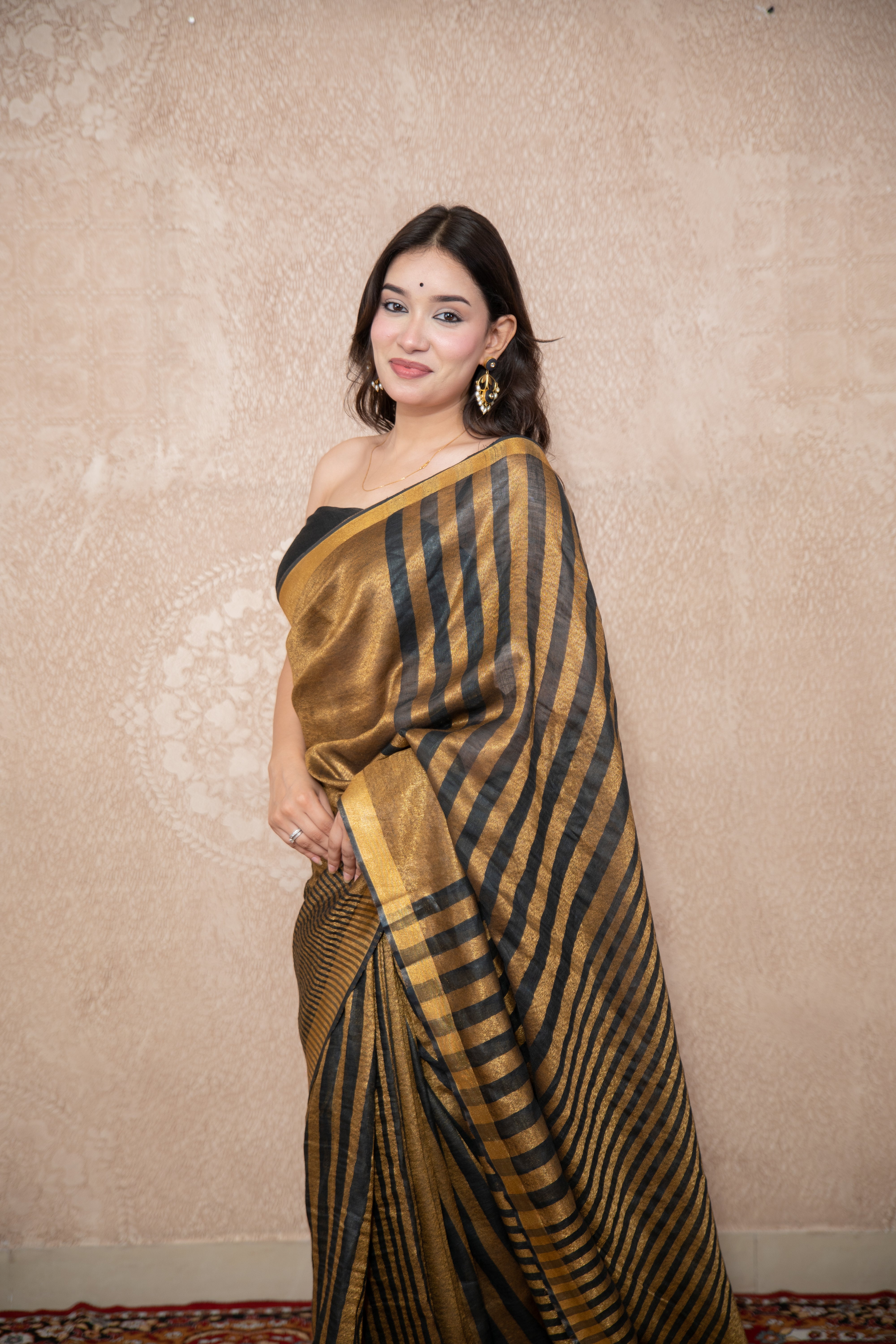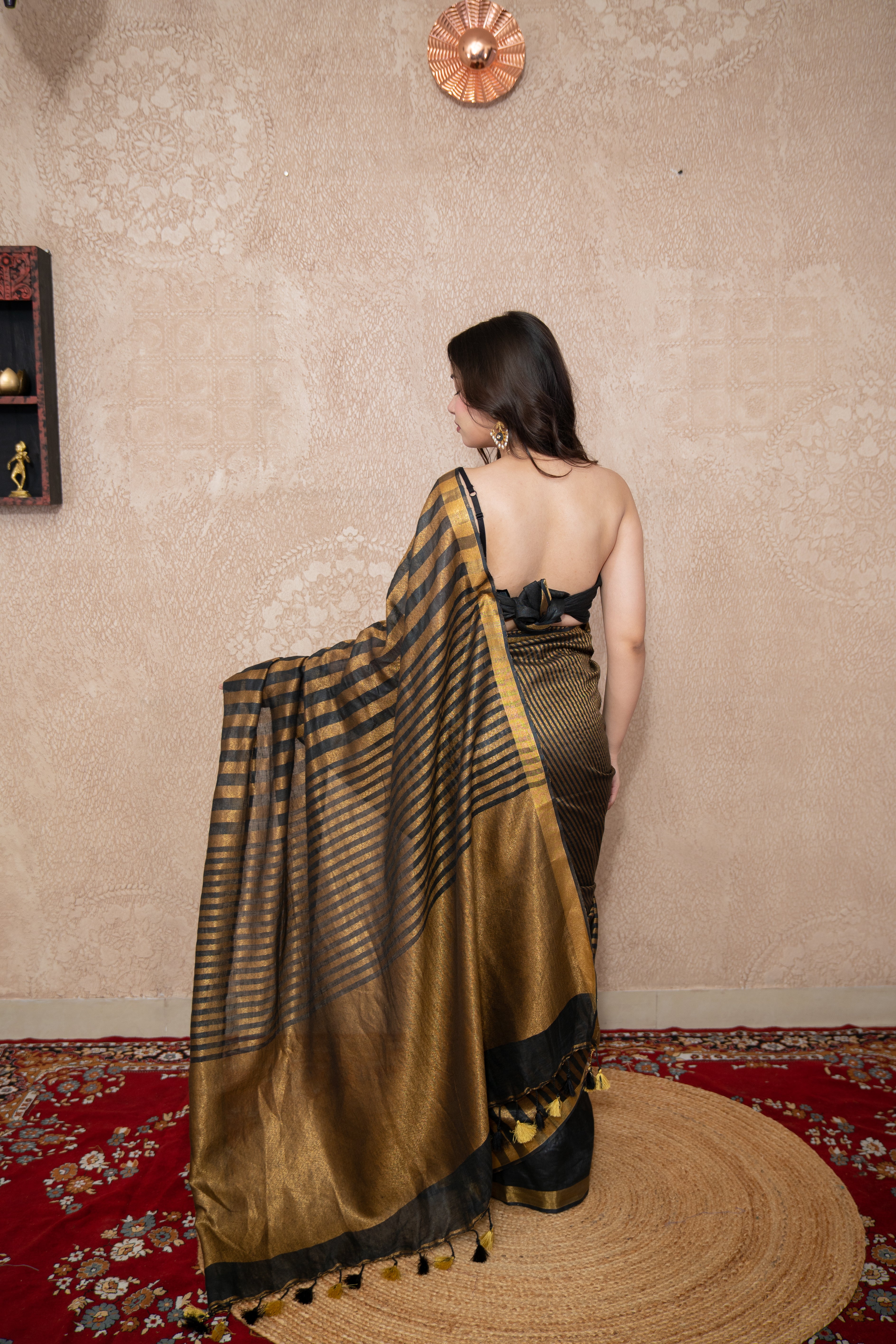 Embrace understated luxury with the Chitrika – Black Striped Zari Linen Saree, an exclusive design from our Vasanika Collection. With its striking black base and elegant zari stripes, this saree is a modern classic that blends traditional artistry with contemporary style. Perfect for festive occasions, weddings, or evening gatherings, it is a versatile statement piece for every wardrobe.