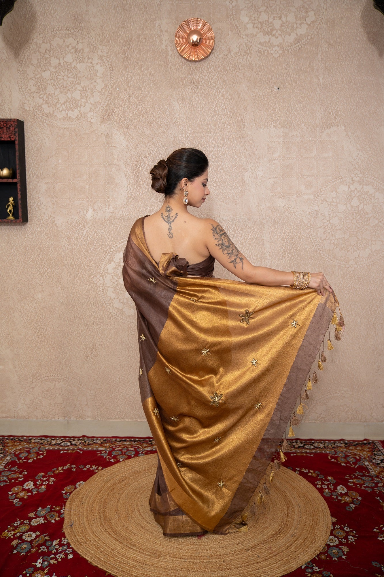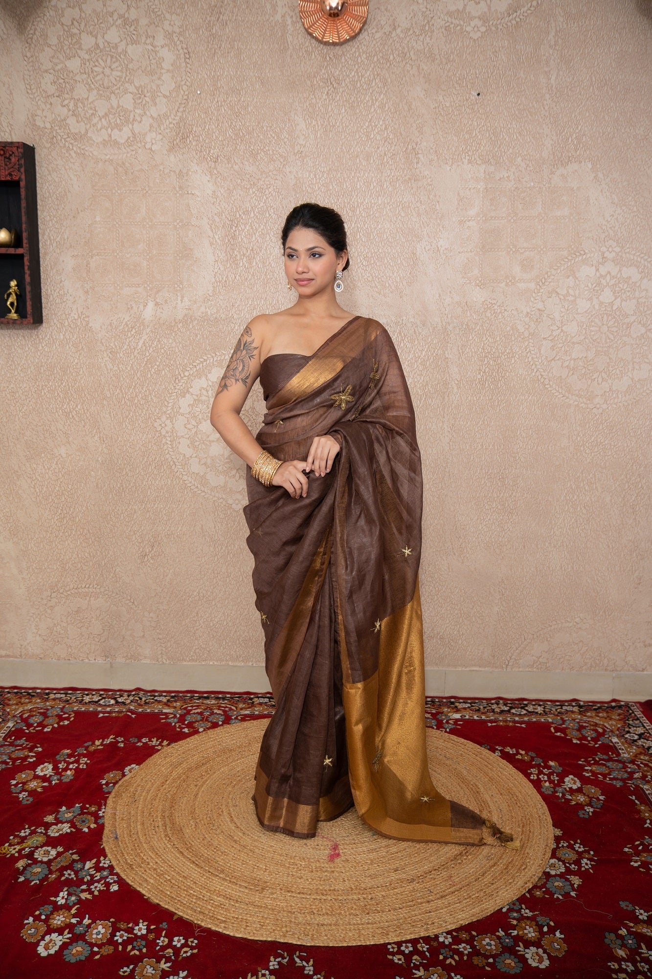 Earthy, elegant, and deeply rooted in tradition — Devangi is a refined Brown Saree with Hand Embroidery, designed for women who embrace timeless beauty with soulful charm. As part of our distinguished "Sone ki Abha" collection, Devangi is ideal for cultural gatherings, evening events, or serene festive occasions.