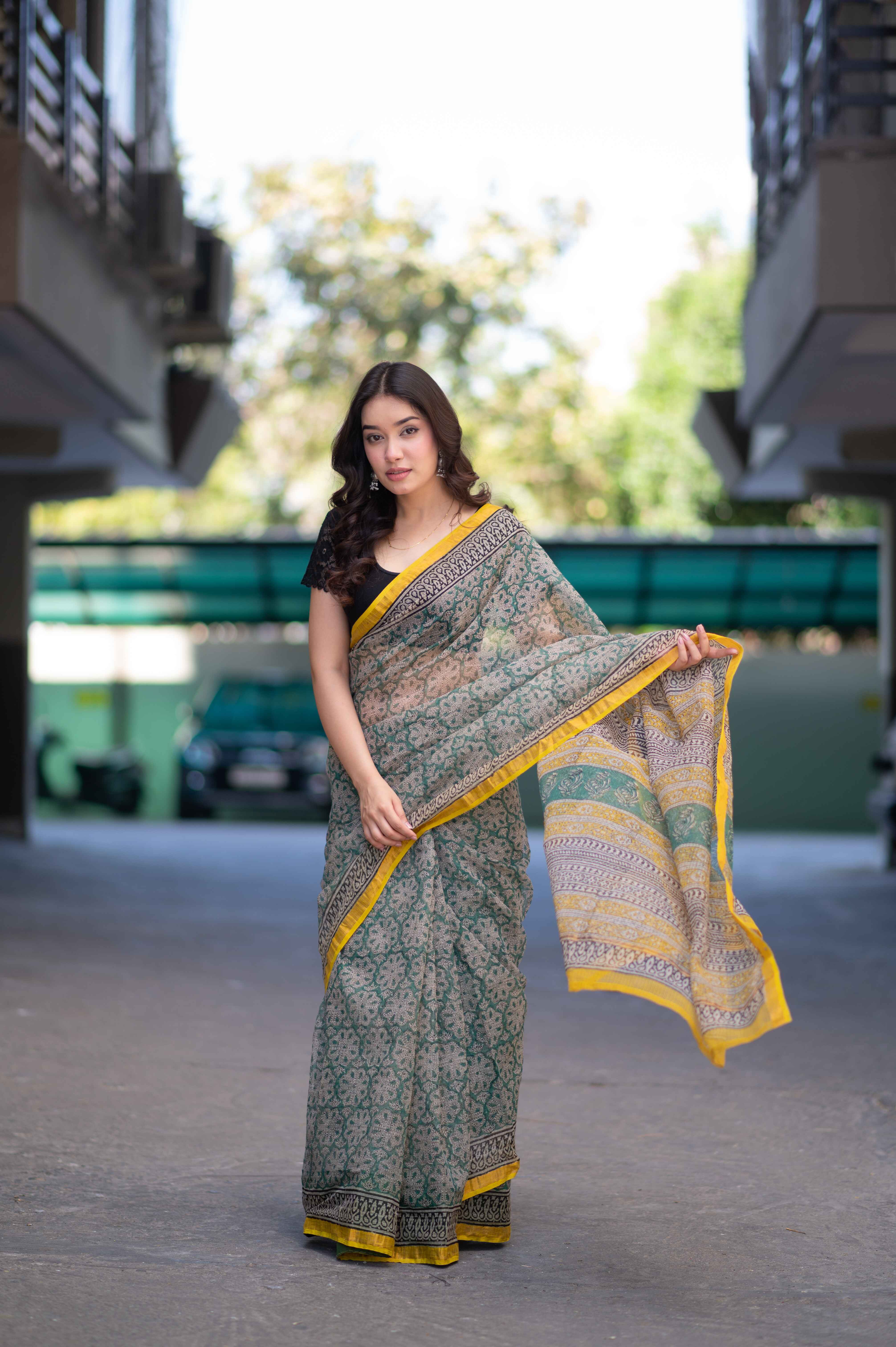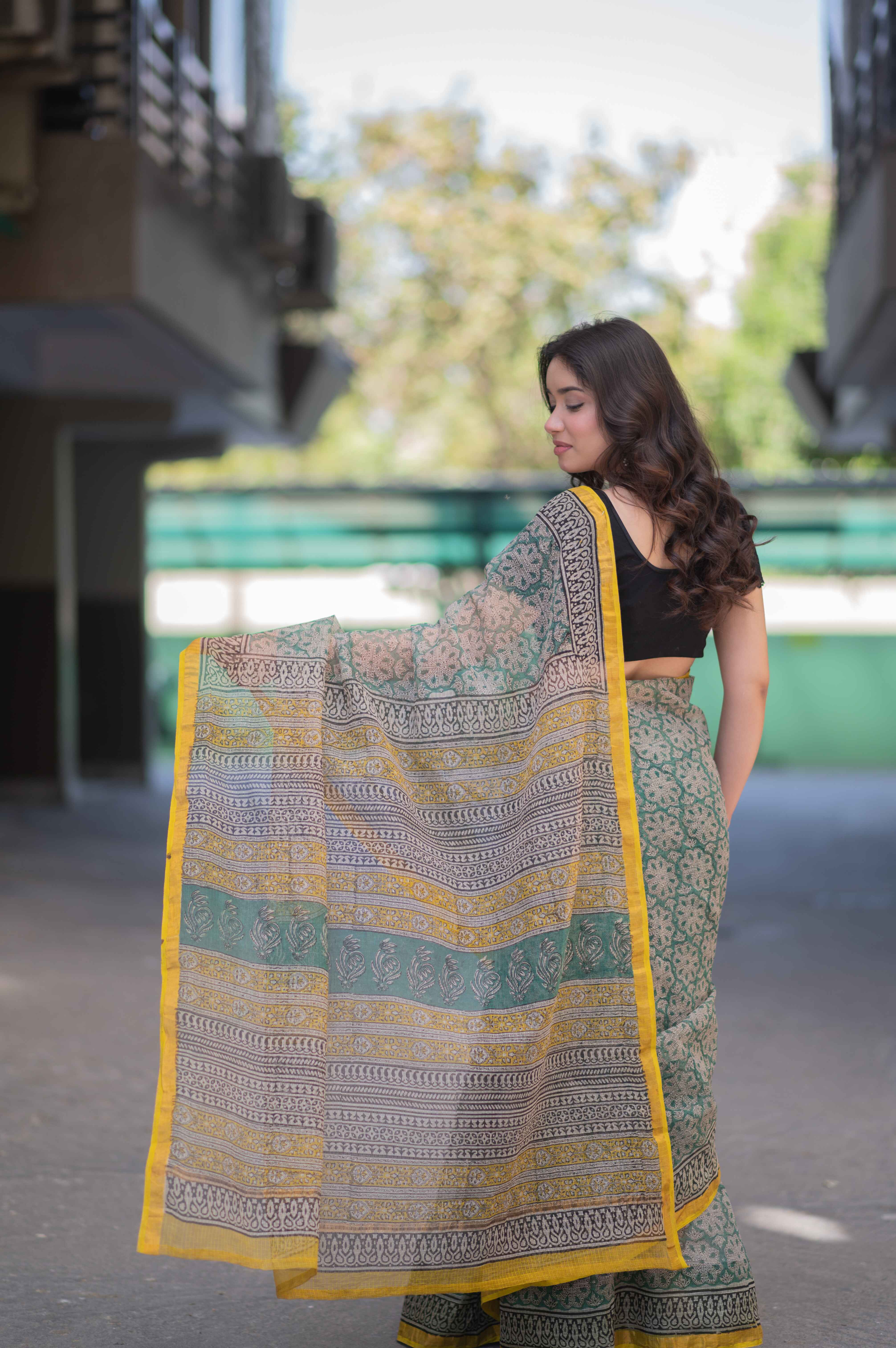Dewdrop Glow- Green Bagru Kota Doria Saree