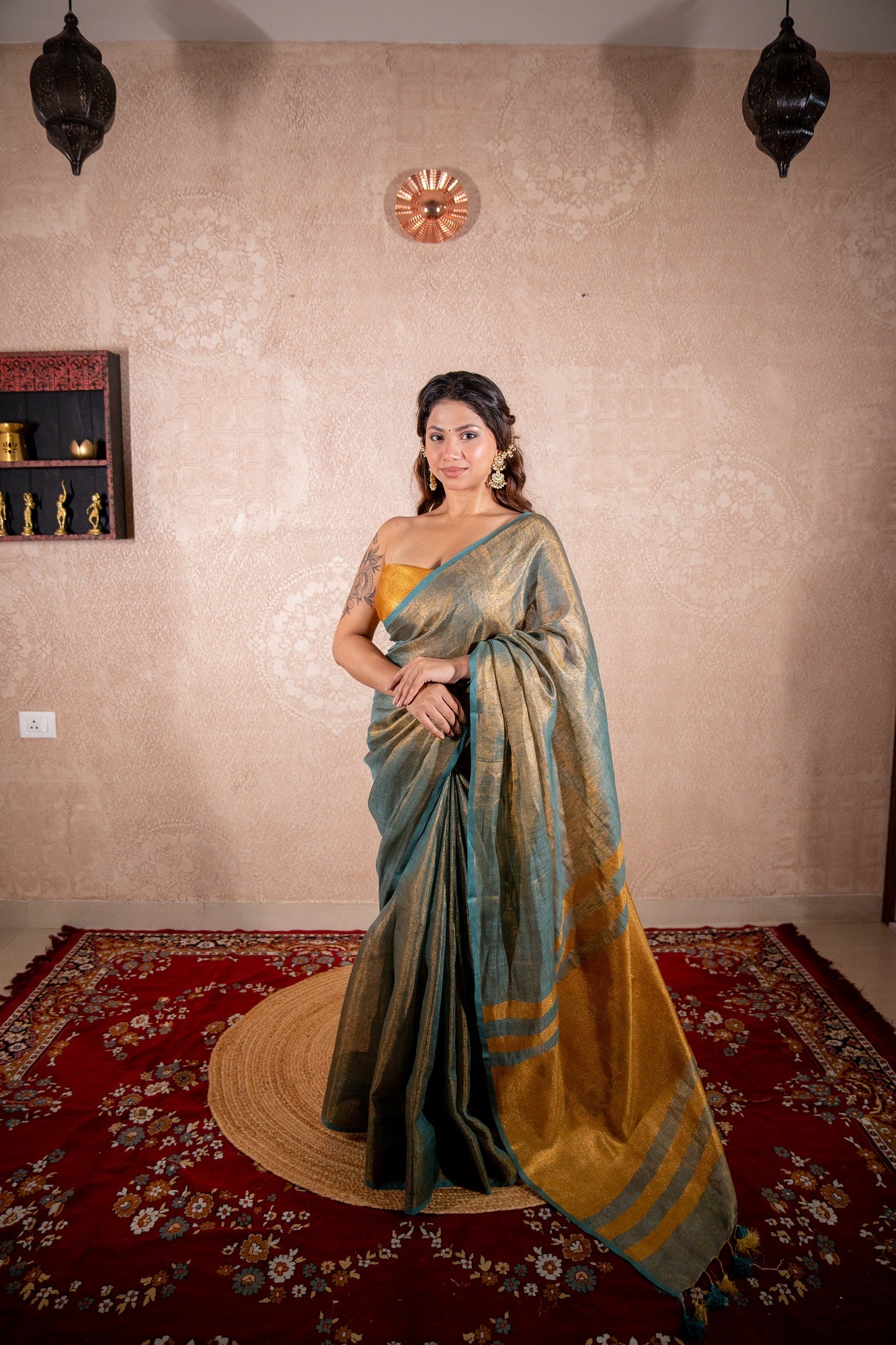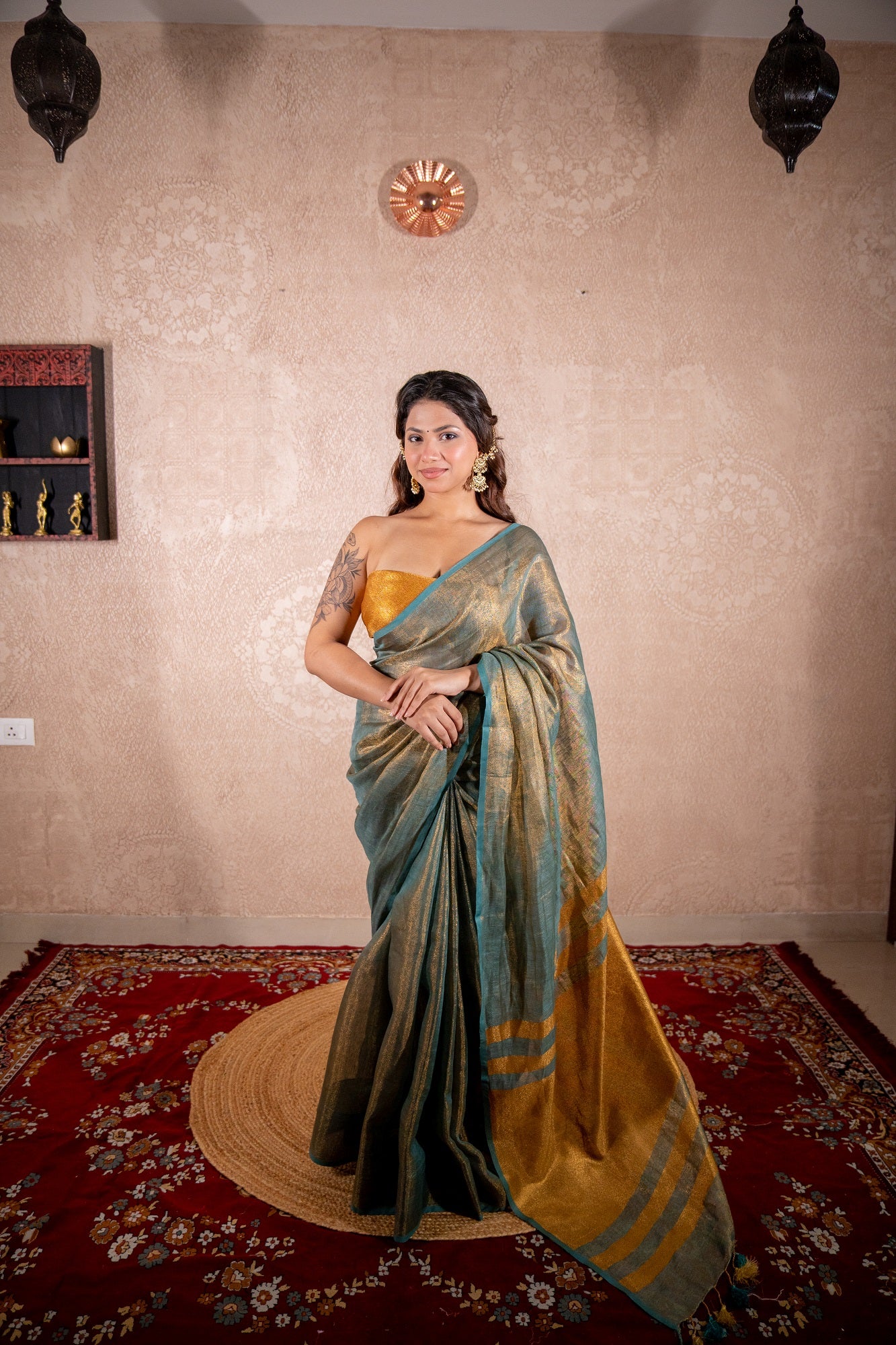Made from high-quality fabric with a soft, natural fall, Dhriti is lightweight yet rich in appearance. The saree is adorned with refined Zari stripes that run seamlessly across the body, adding a gentle shimmer to its deep green tone. Thoughtfully designed by our in-house team and handcrafted by skilled artisans, this saree reflects understated sophistication and artisanal precision.