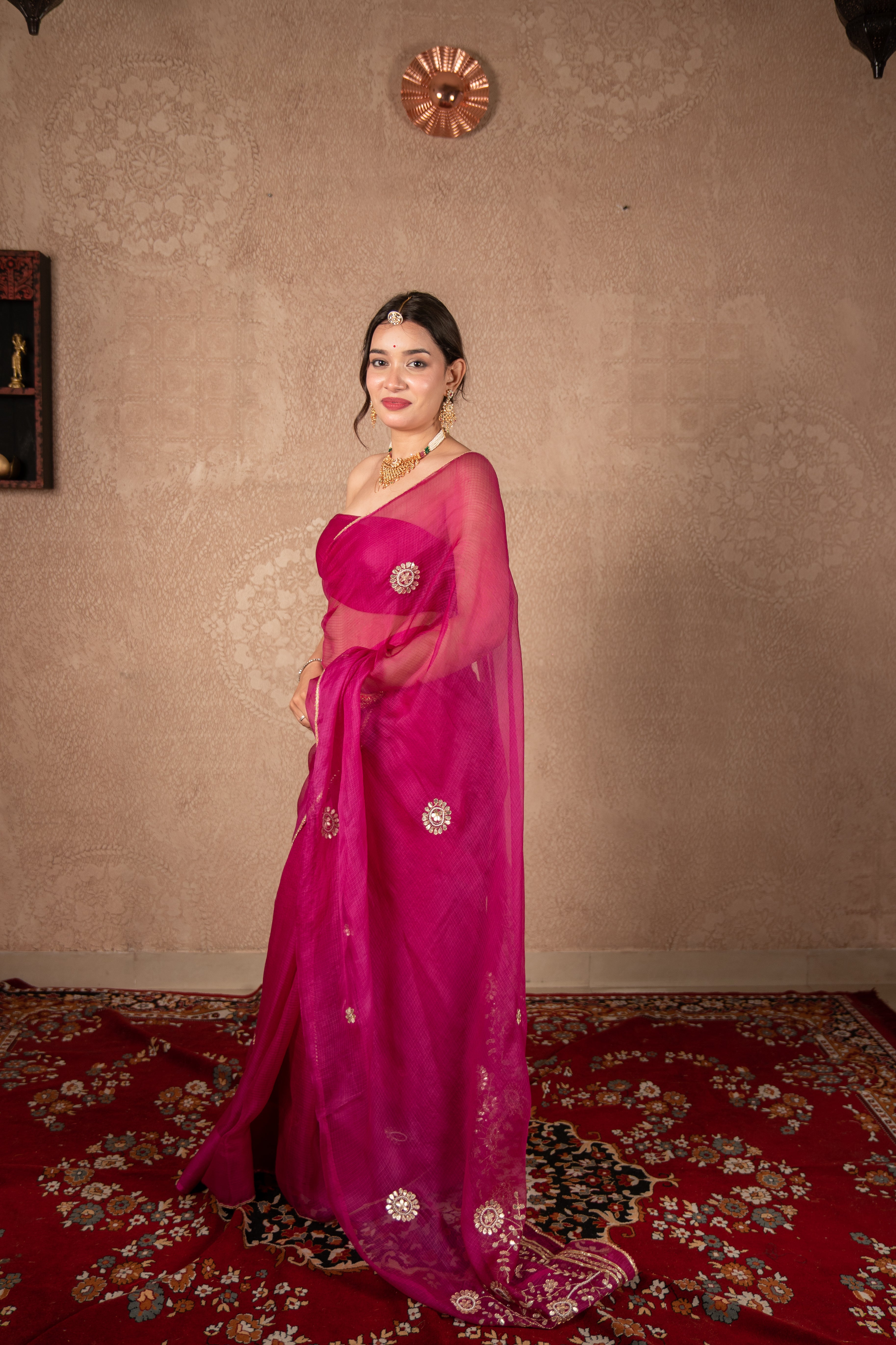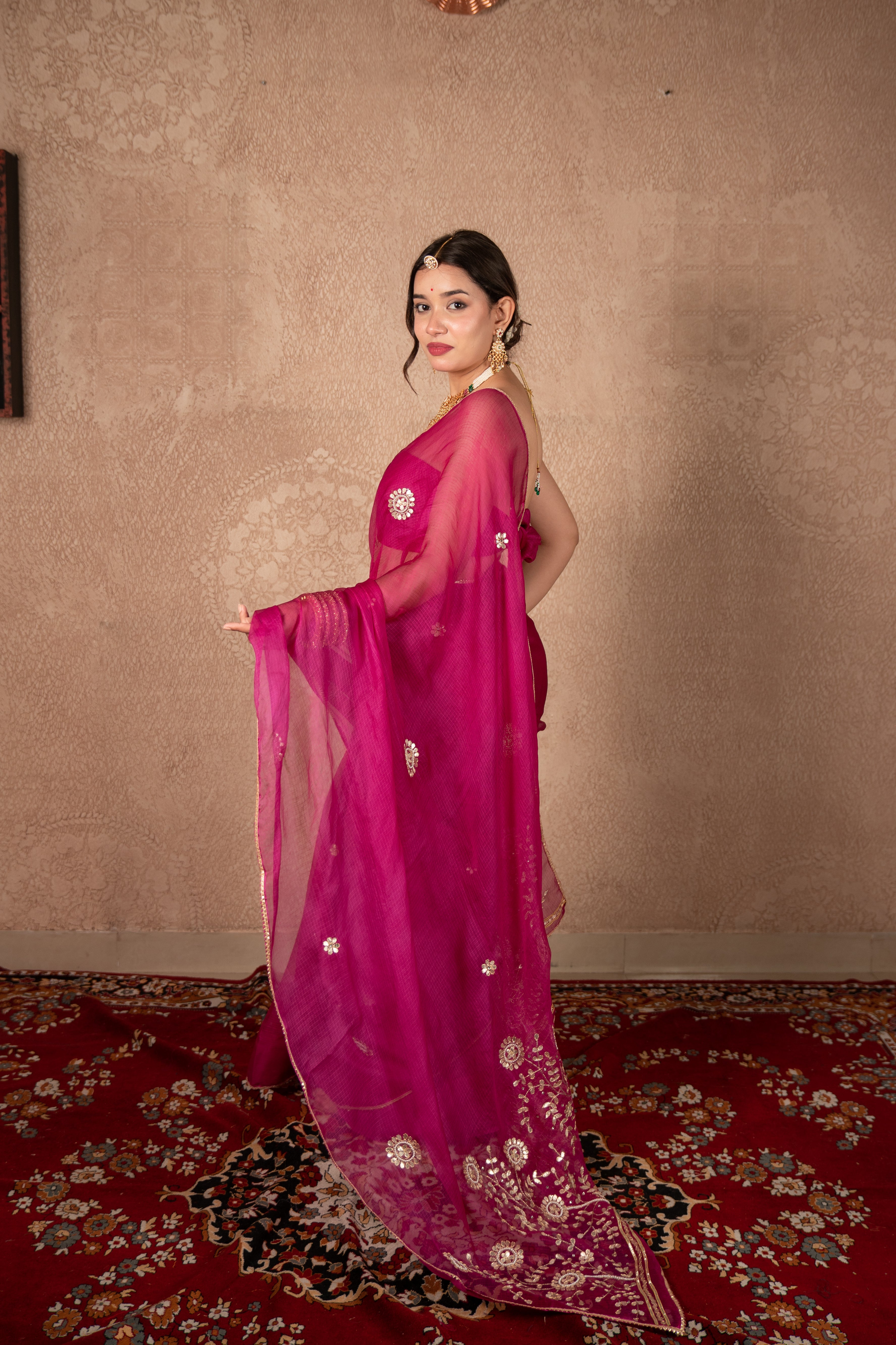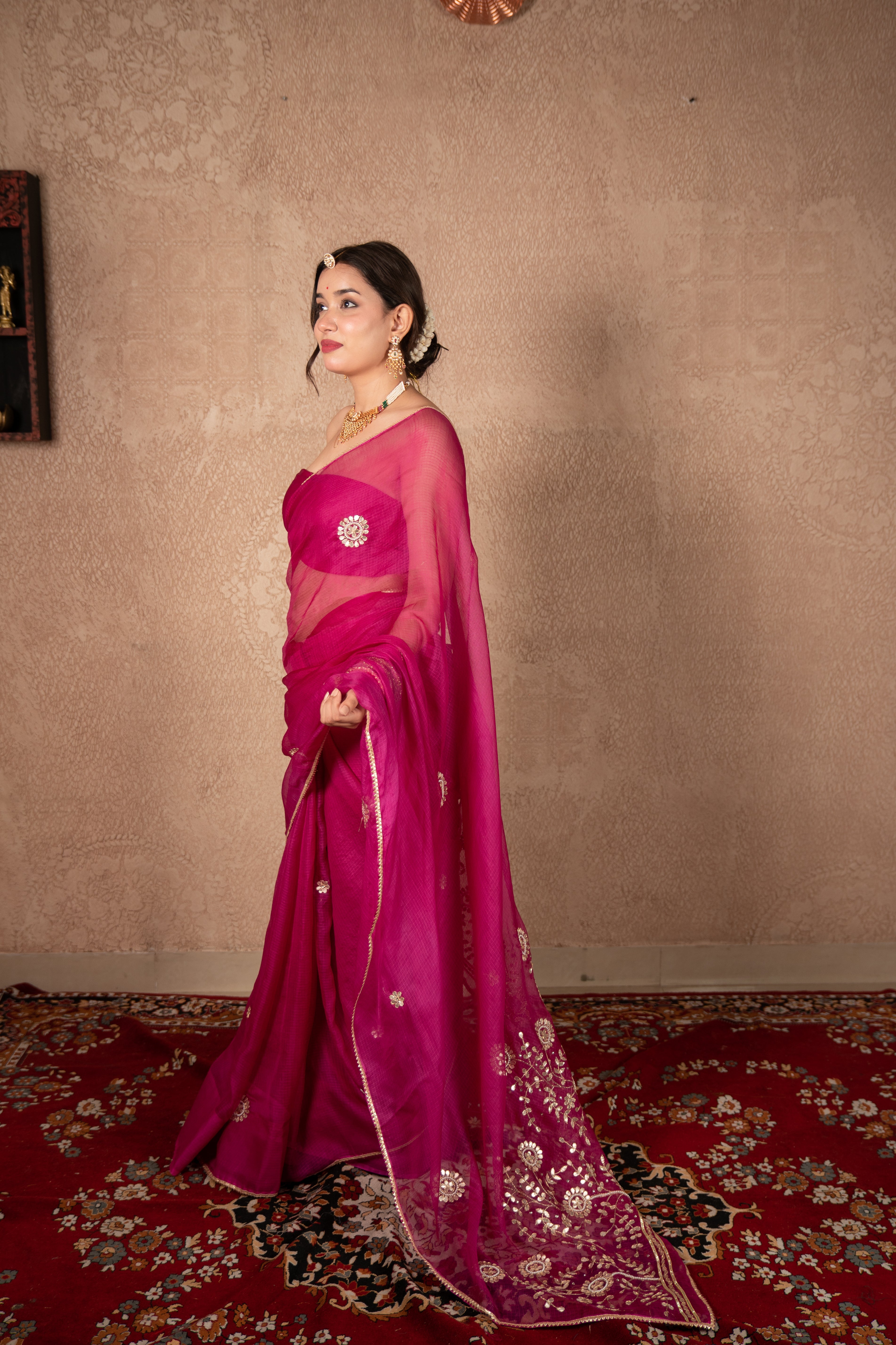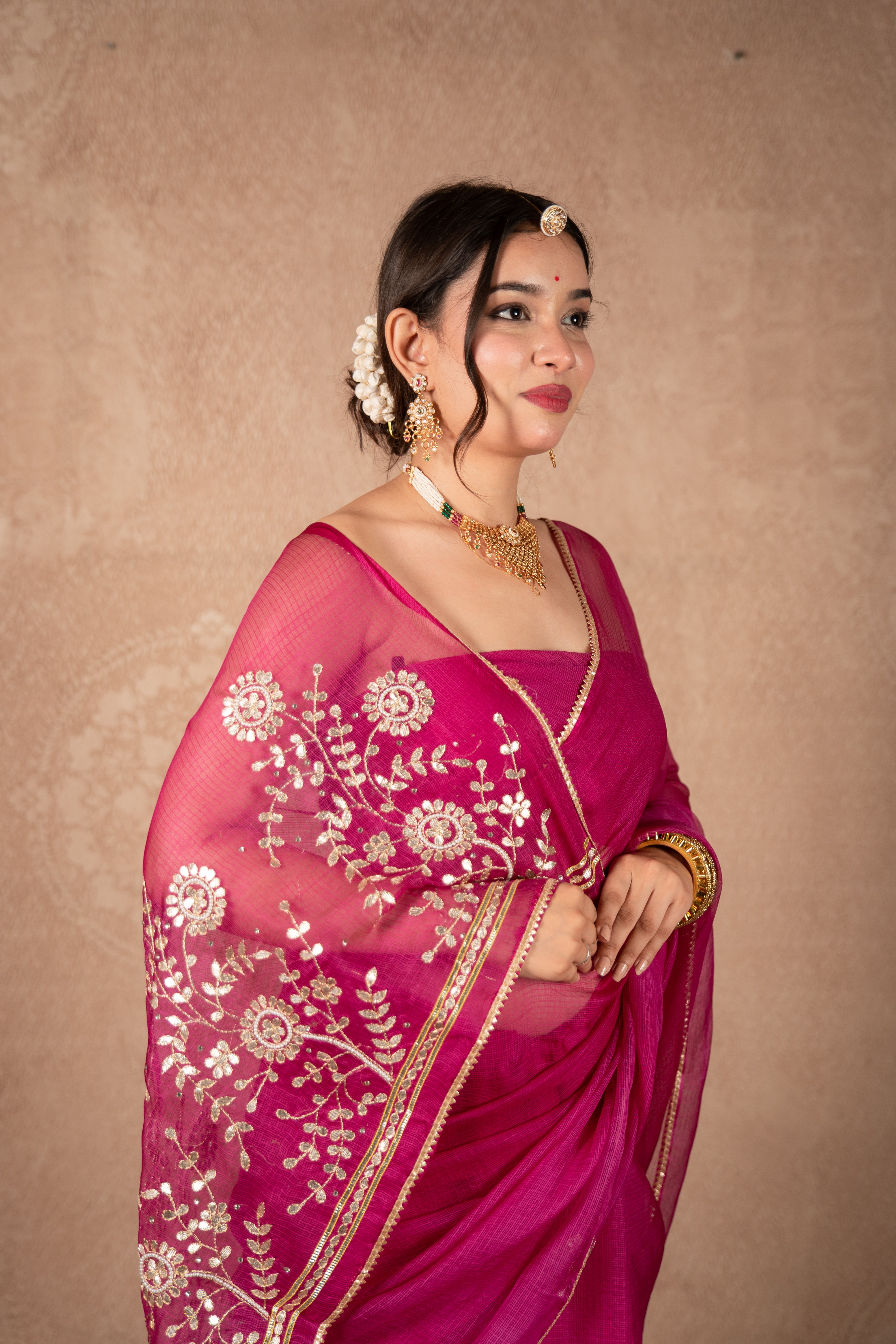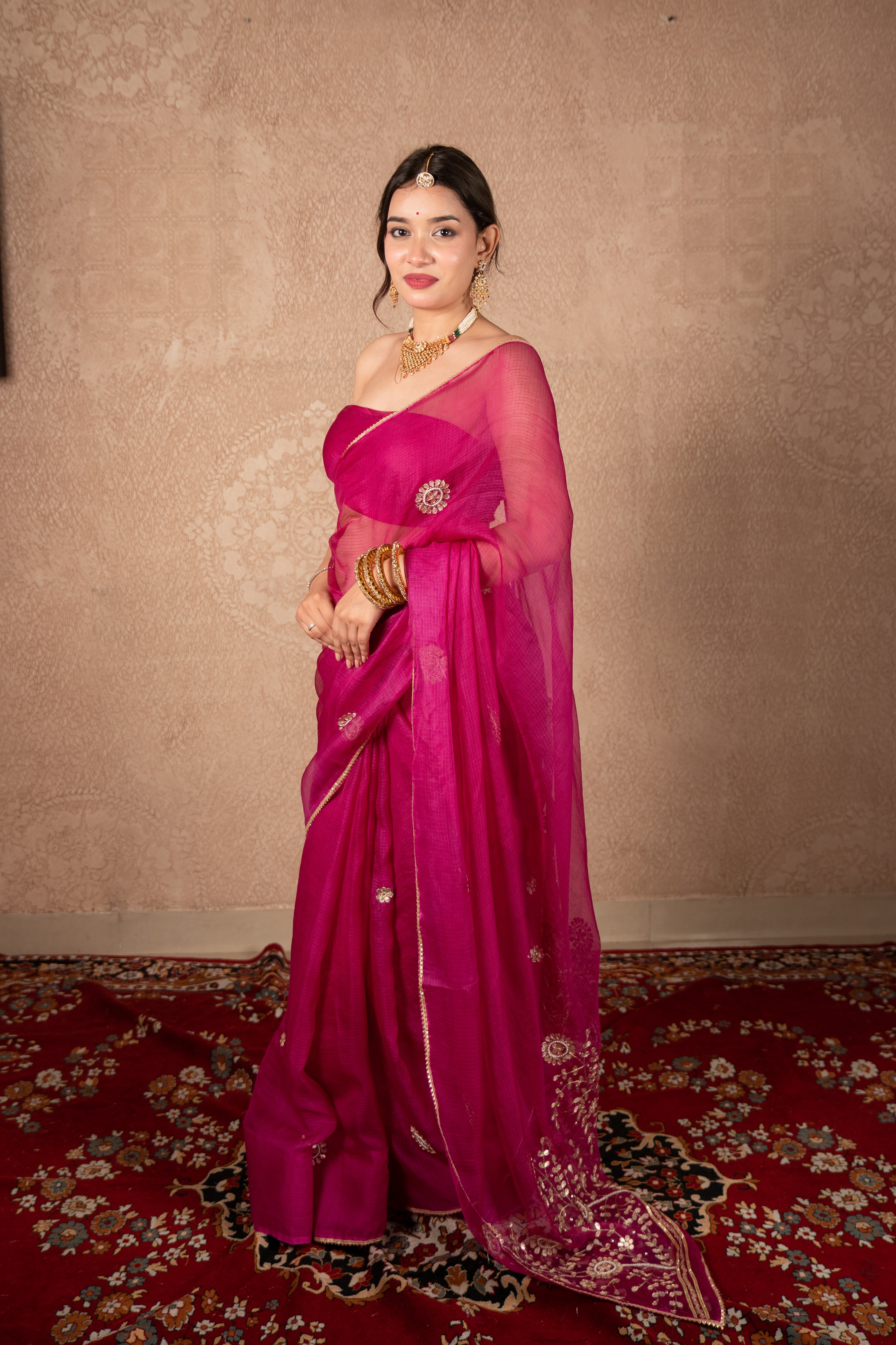 Step into graceful elegance with this Pink Kota Silk Saree featuring rich gota jaal work on the pallu and a refined lace border. Crafted from airy, lightweight Kota Silk, it offers a comfortable drape with a soft sheen that enhances its festive appeal. The vibrant pink hue embodies femininity and charm, while the intricate gota embroidery reflects timeless artistry.