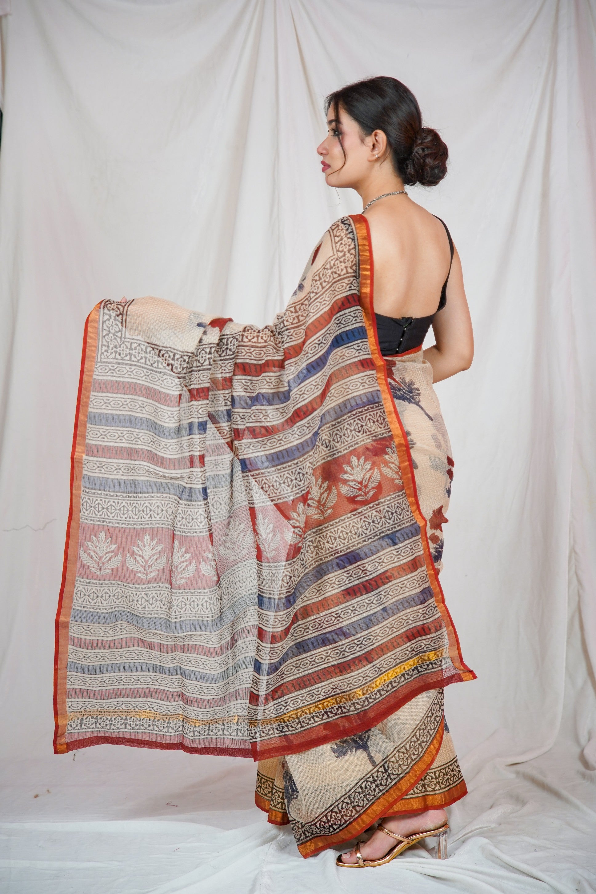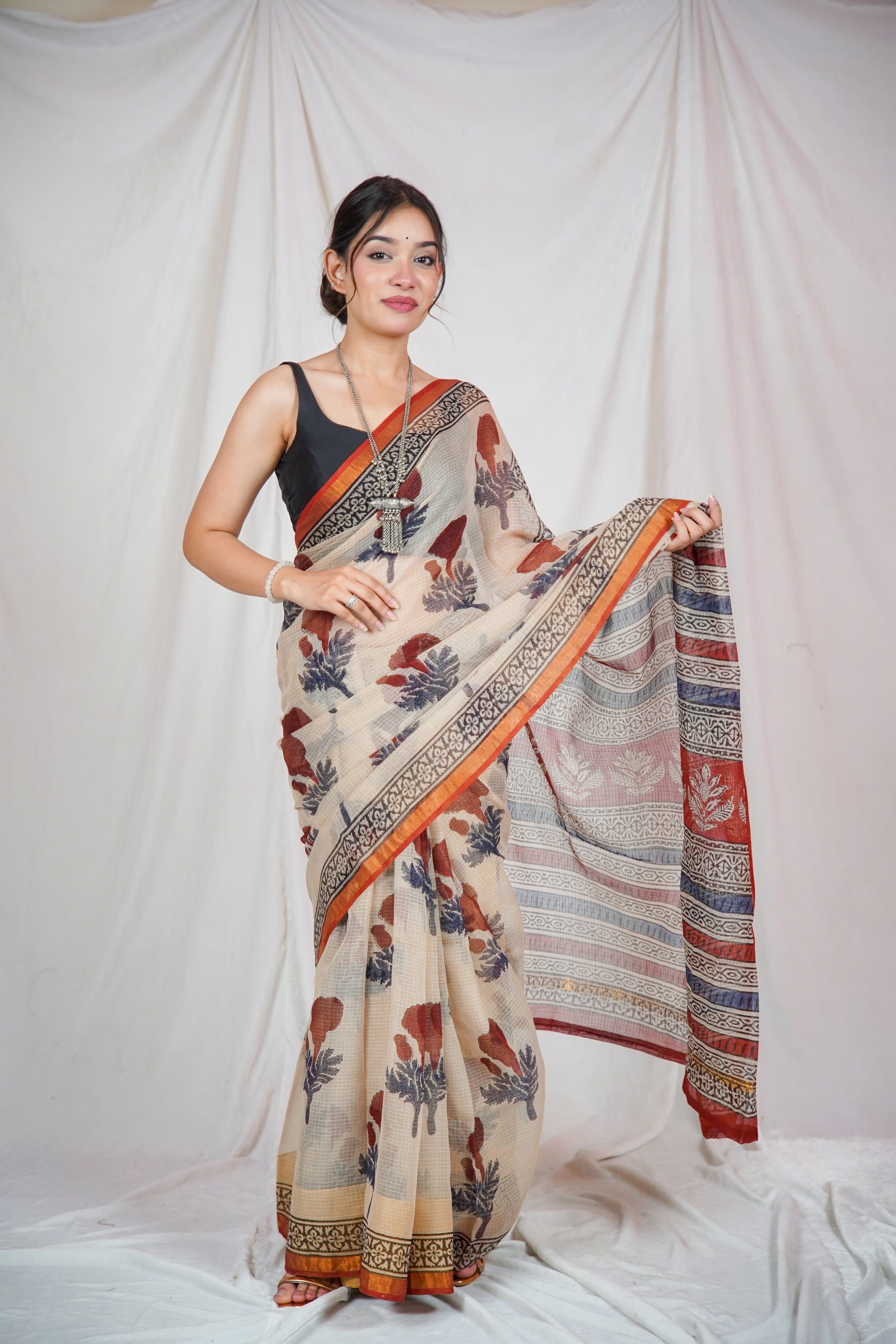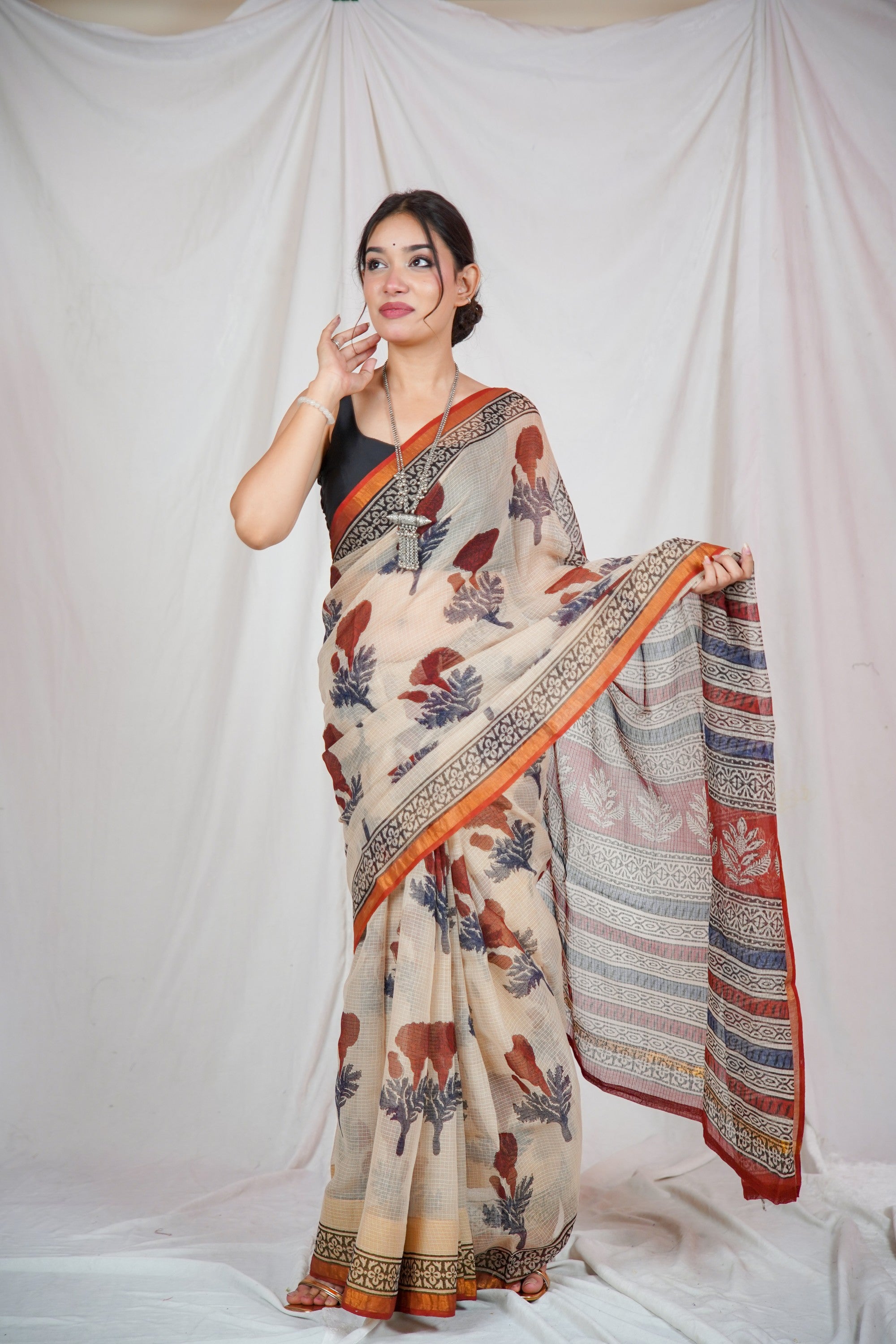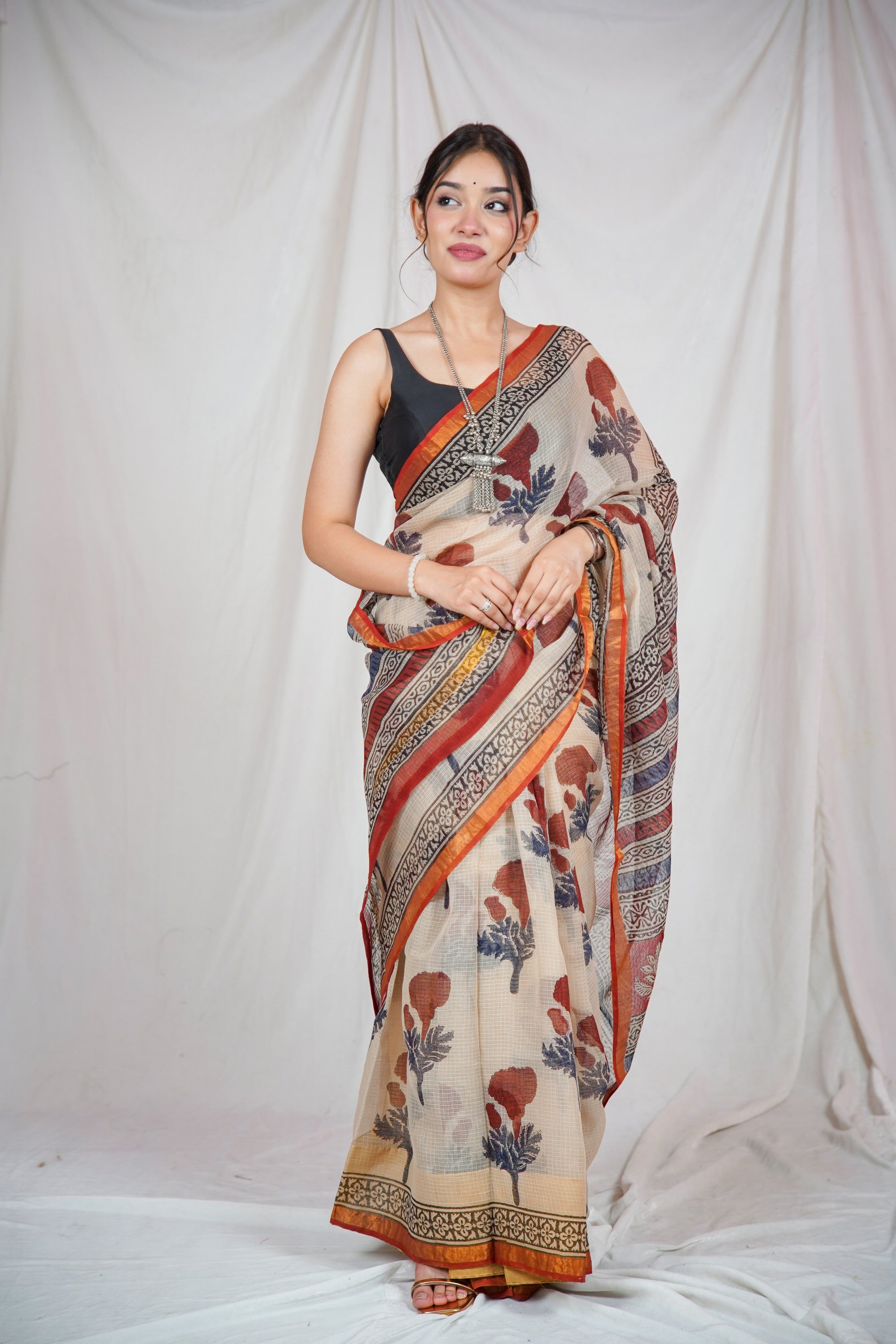 Make a statement with our Floral Whisper - Beige Ajrakh Kota Doria Saree a blend of heritage and style that stands out effortlessly. Order yours today! 💛✨