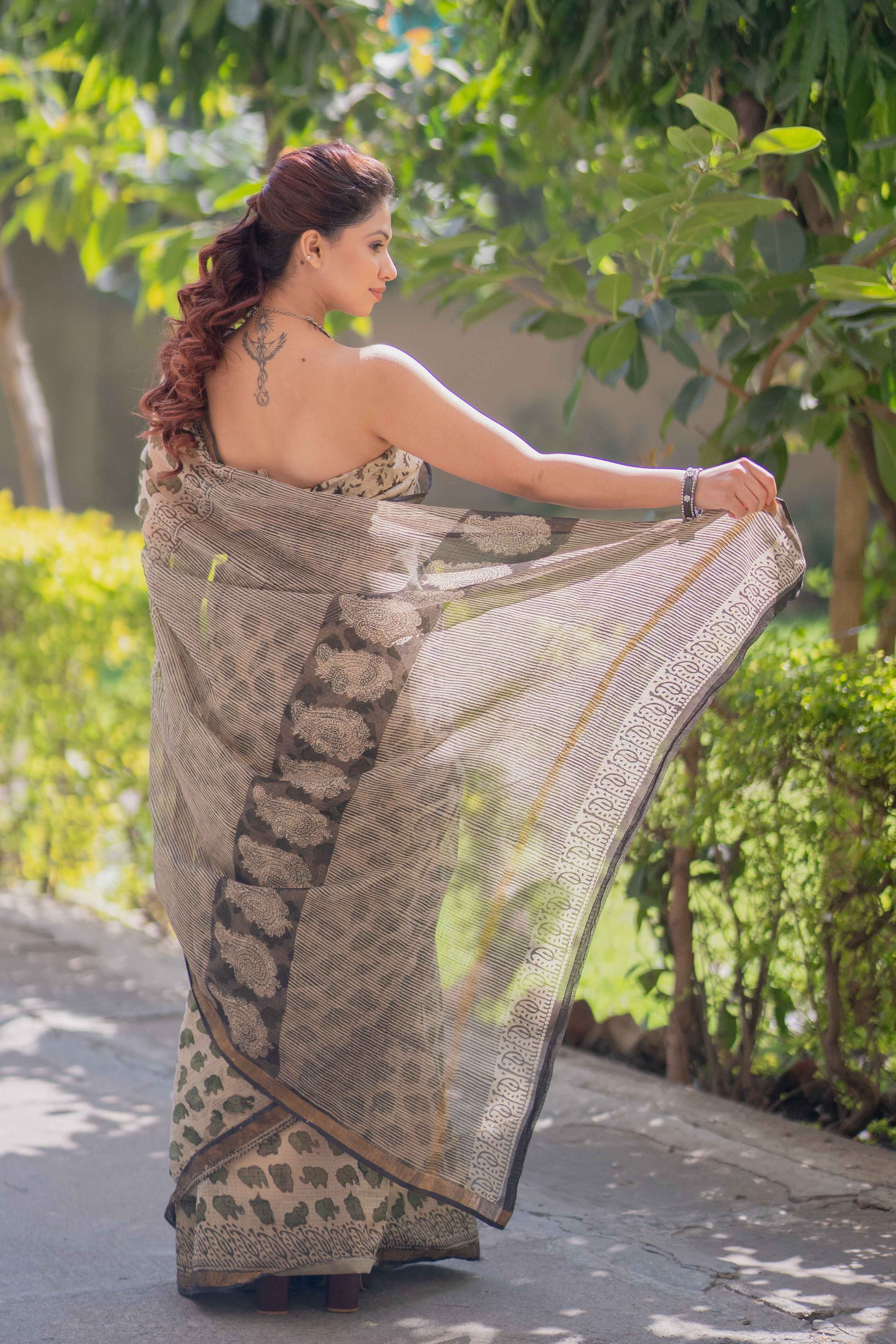 Step into grace with Gajrekha, a masterpiece from our exclusive Ashi collection. This cream Kota Doria saree is adorned with green elephant block prints, a symbol of wisdom and prosperity. Light, airy, and effortlessly elegant, it is perfect for festive gatherings, casual outings, and cultural celebrations.