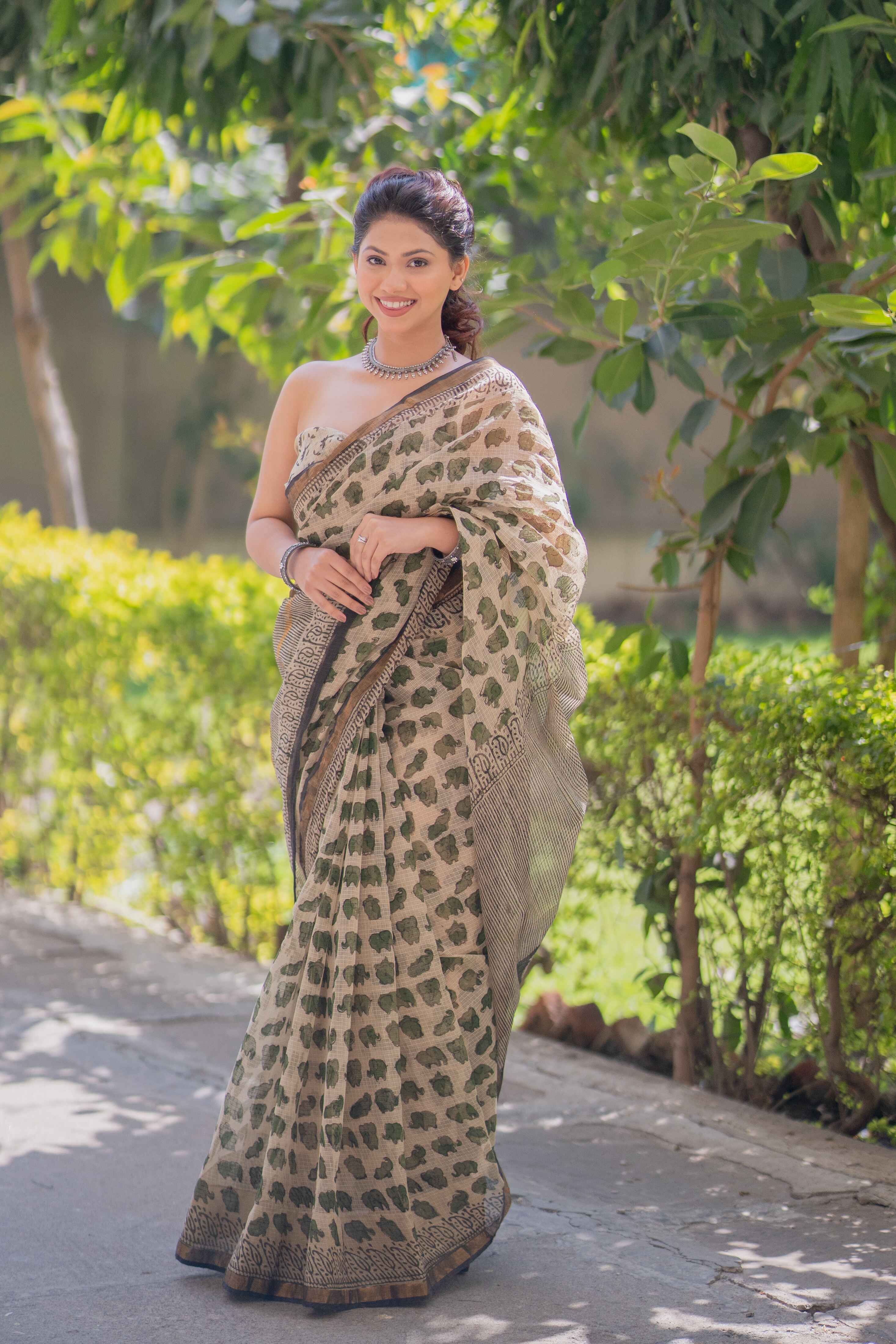 Crafted from pure Kota Doria, this saree embodies the heritage of Rajasthani weaving. The unique block print features handcrafted green elephants, each stamped with precision by skilled artisans. The lightweight, breathable fabric ensures all-day comfort, making it ideal for every season.