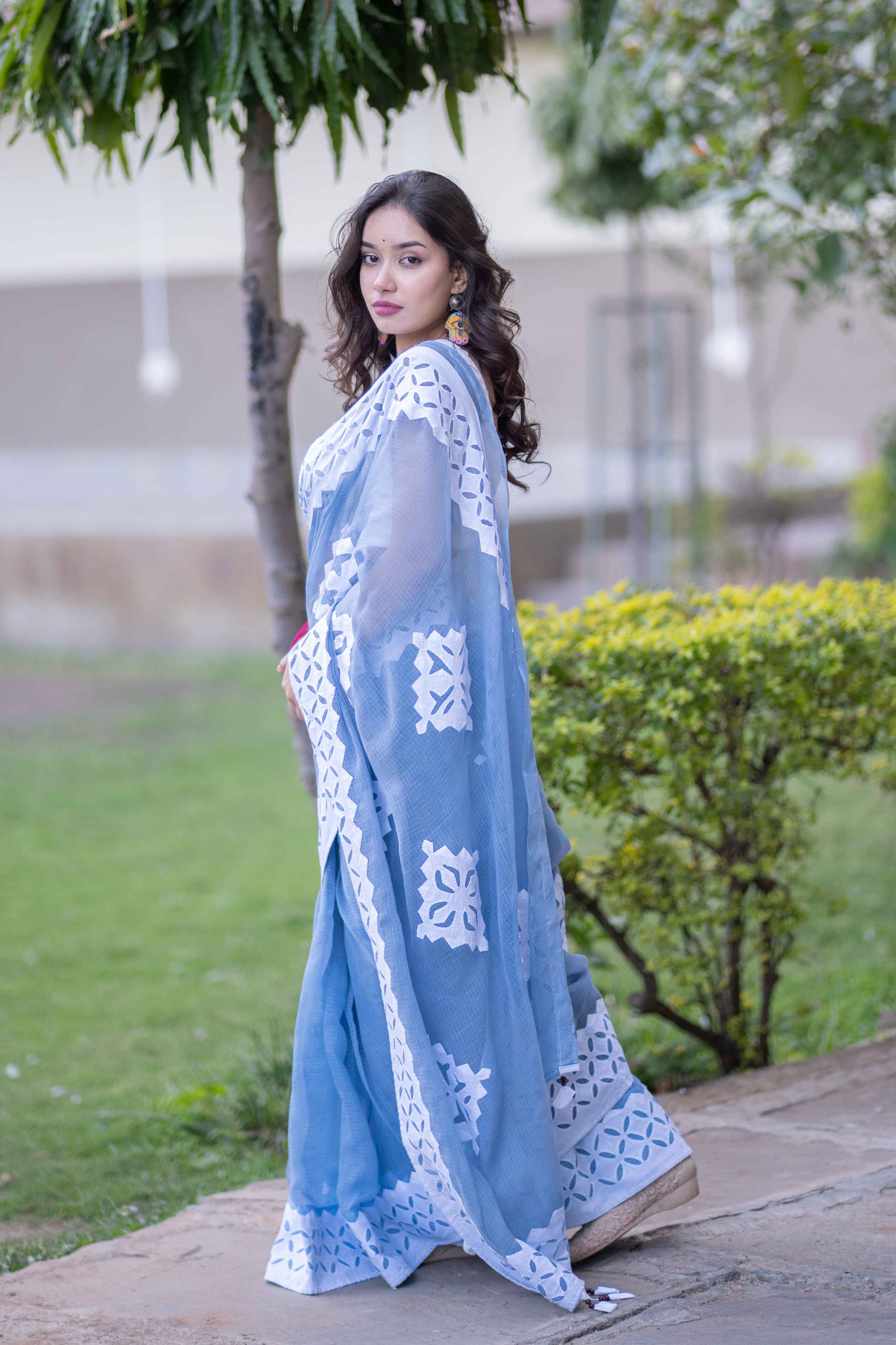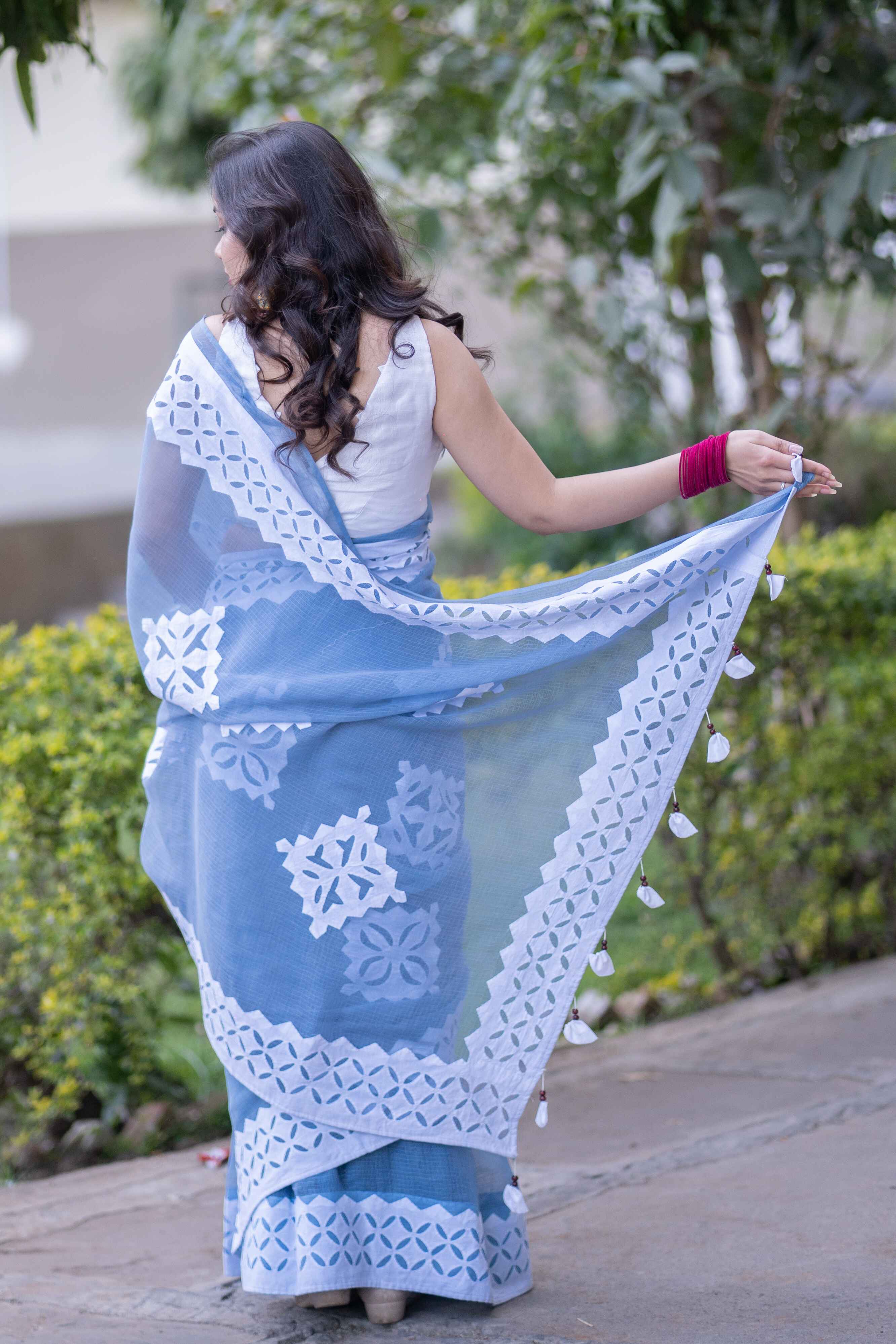 Drape yourself in the elegance of appliqué artistry with Geeta. Whether it's a festive gathering or a cultural soirée, this saree is designed to make you stand out with its serene charm.