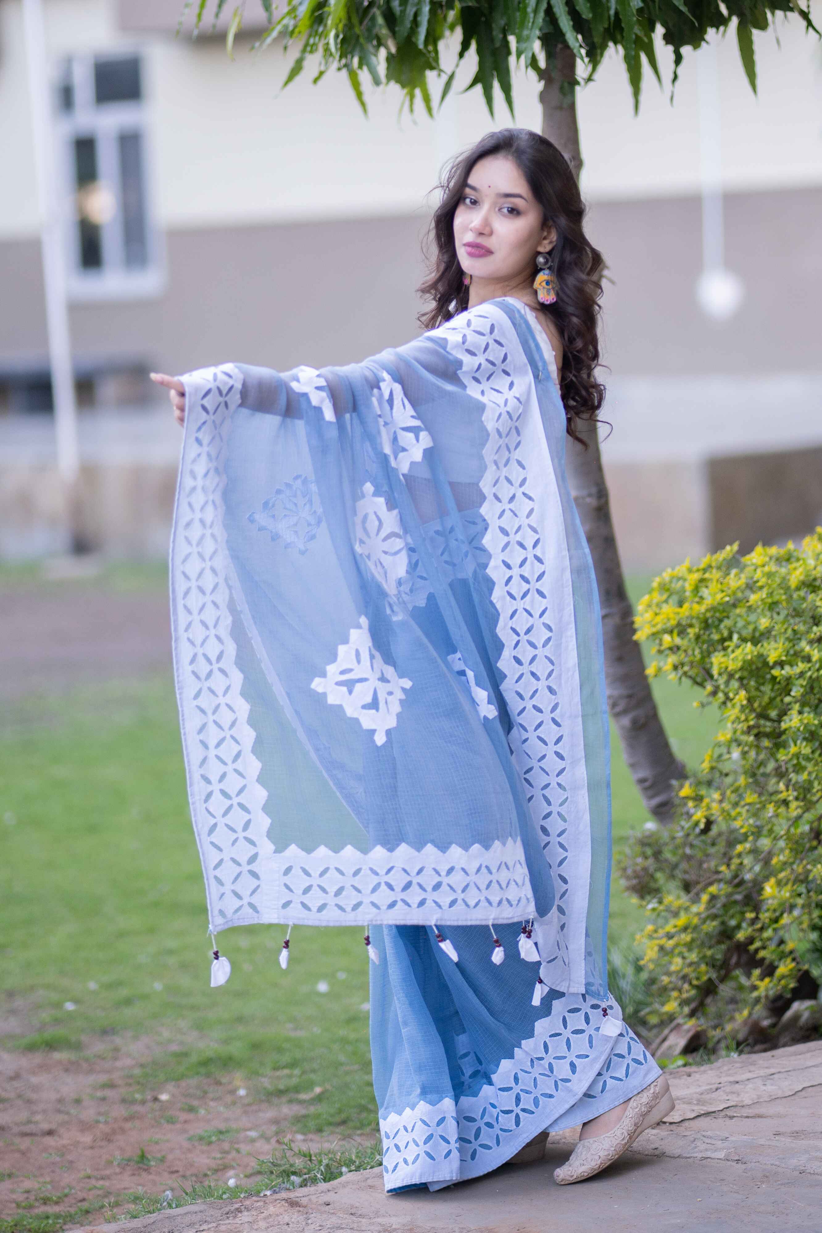 Crafted from pure Kota Doria fabric, this saree is a testament to timeless elegance. The feather-light texture and fine transparency of Kota Doria lend an effortless drape, while the hand-applied white appliqué work adds depth and character. This design is an exclusive creation of our brand, meticulously curated to blend heritage artistry with modern aesthetics.