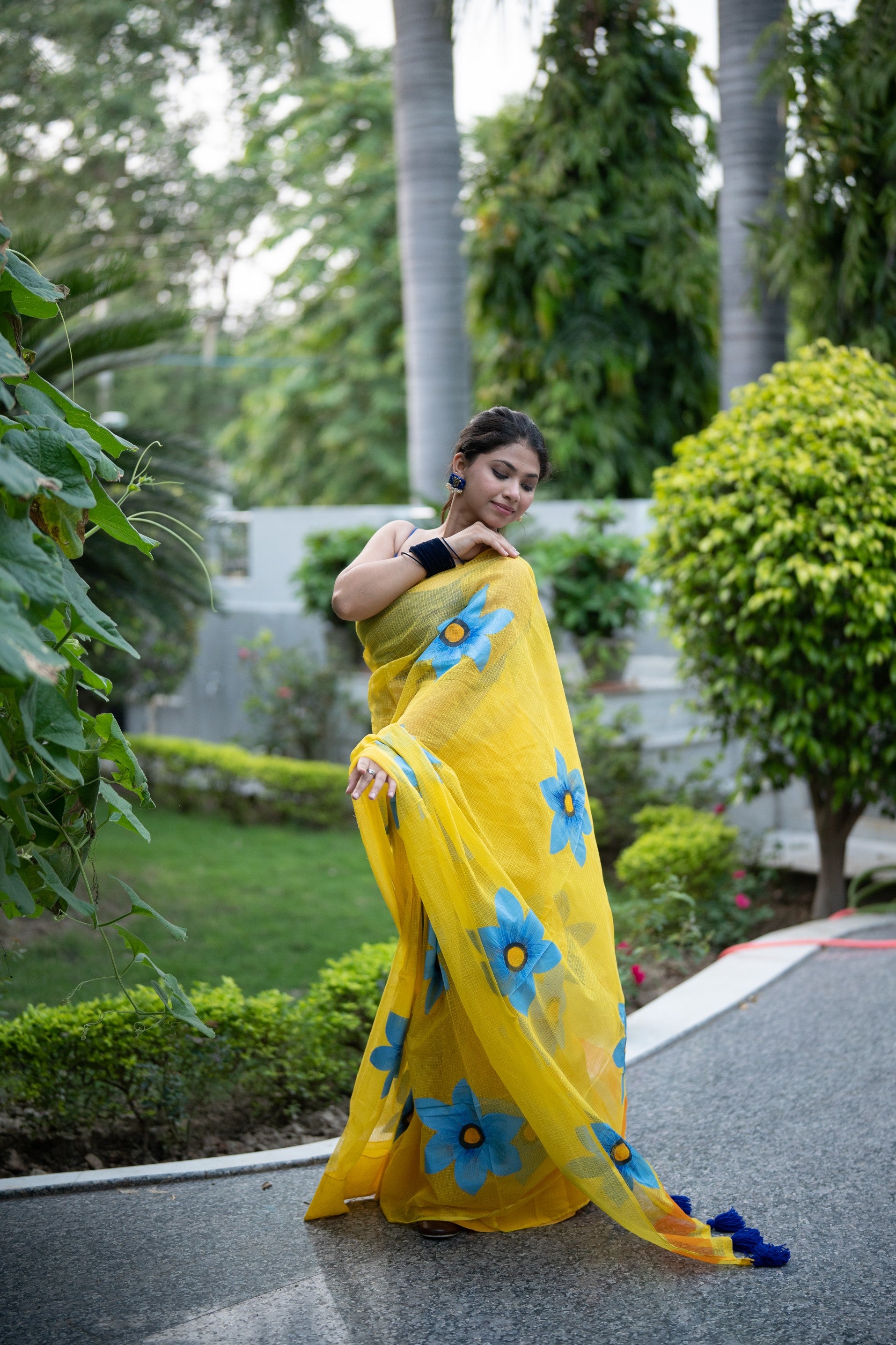 Yellow cotton saree, handpainted Kota Doria saree, floral saree, pure cotton saree, breathable summer saree, lightweight saree with tassels, blue floral saree, yellow festive saree, traditional cotton saree, elegant handpainted saree.