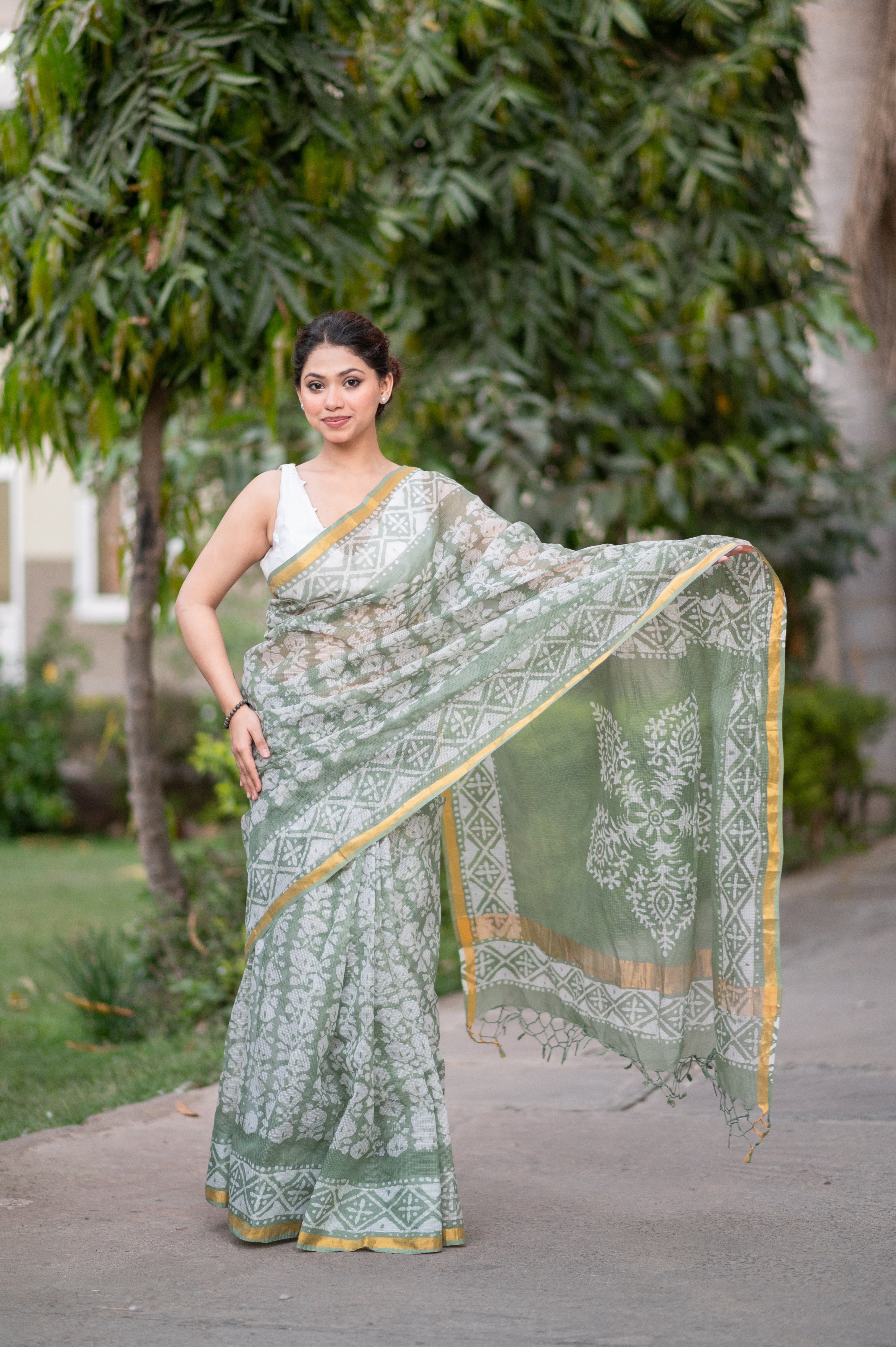Explore the allure of tradition and artistry with our Green Oasis Batik Kota Doria Saree.
