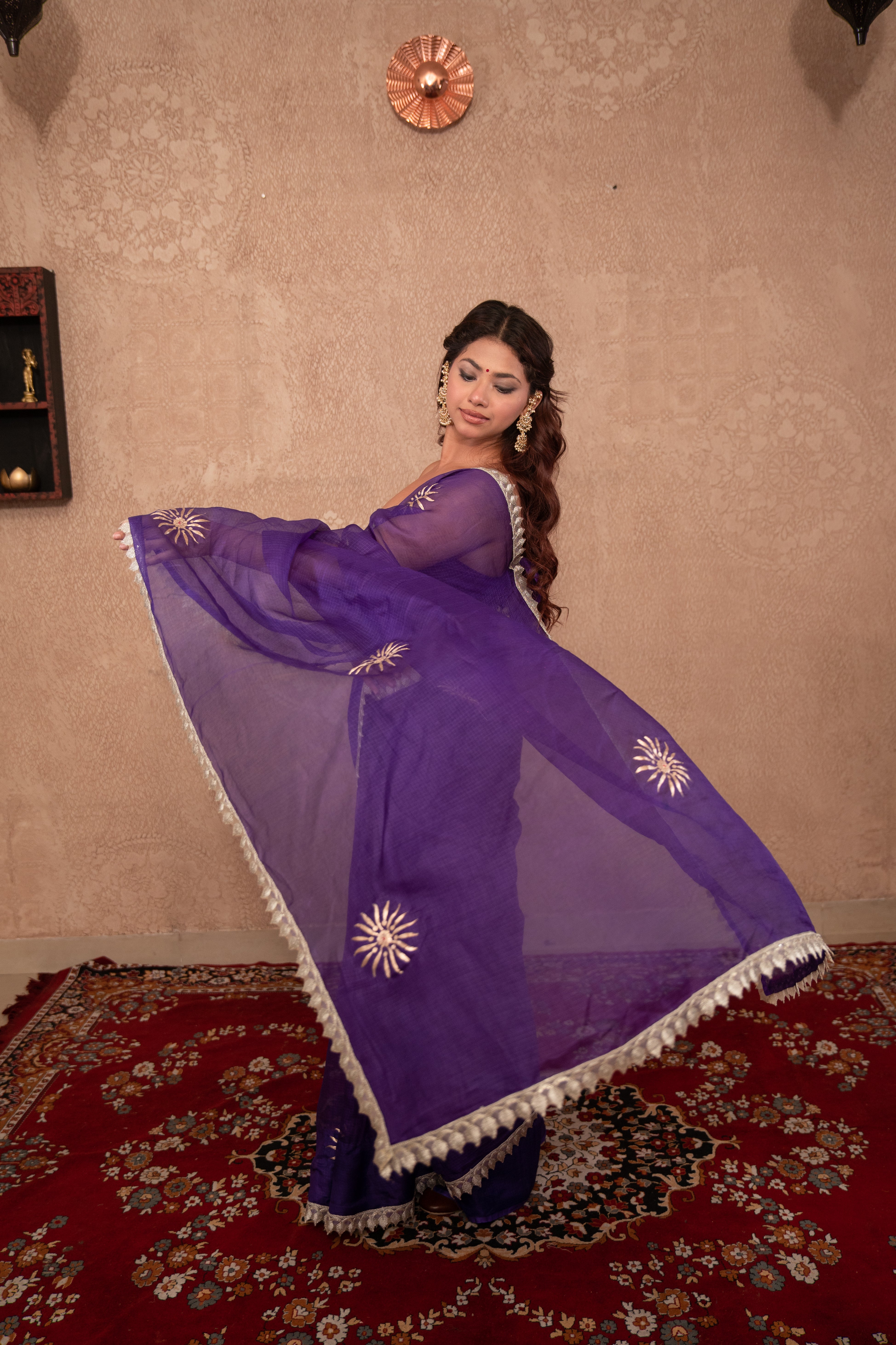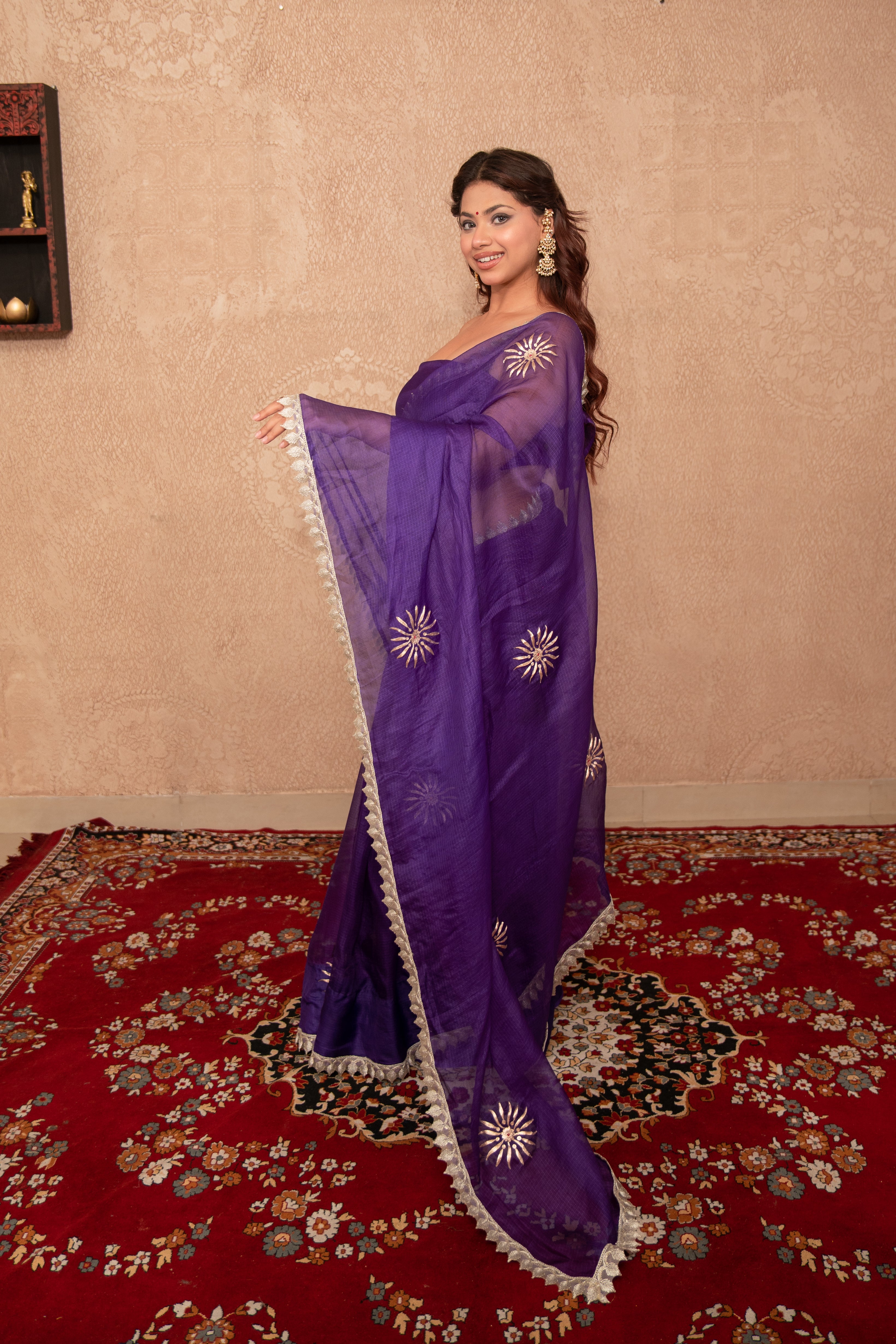 Bring royal elegance to your festive look with this Purple Kota Silk Saree beautifully decorated with hand pittan buti work and delicate lace all over. Woven from lightweight and airy Kota Silk, this saree drapes effortlessly while offering all-day comfort. The rich purple hue symbolizes grandeur and femininity, while the shimmering handcrafted pittan butis highlight traditional artistry with a touch of regal charm.
