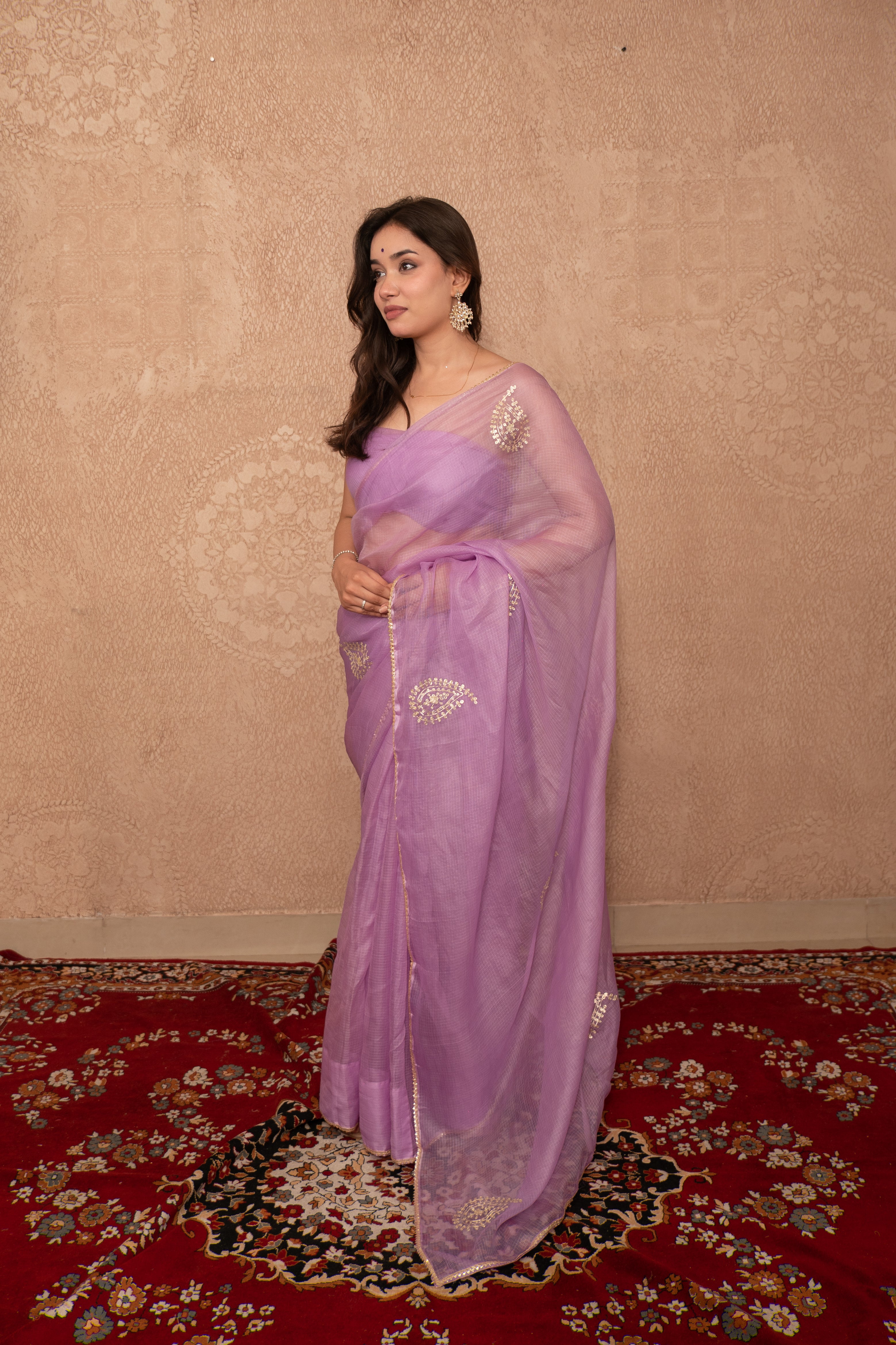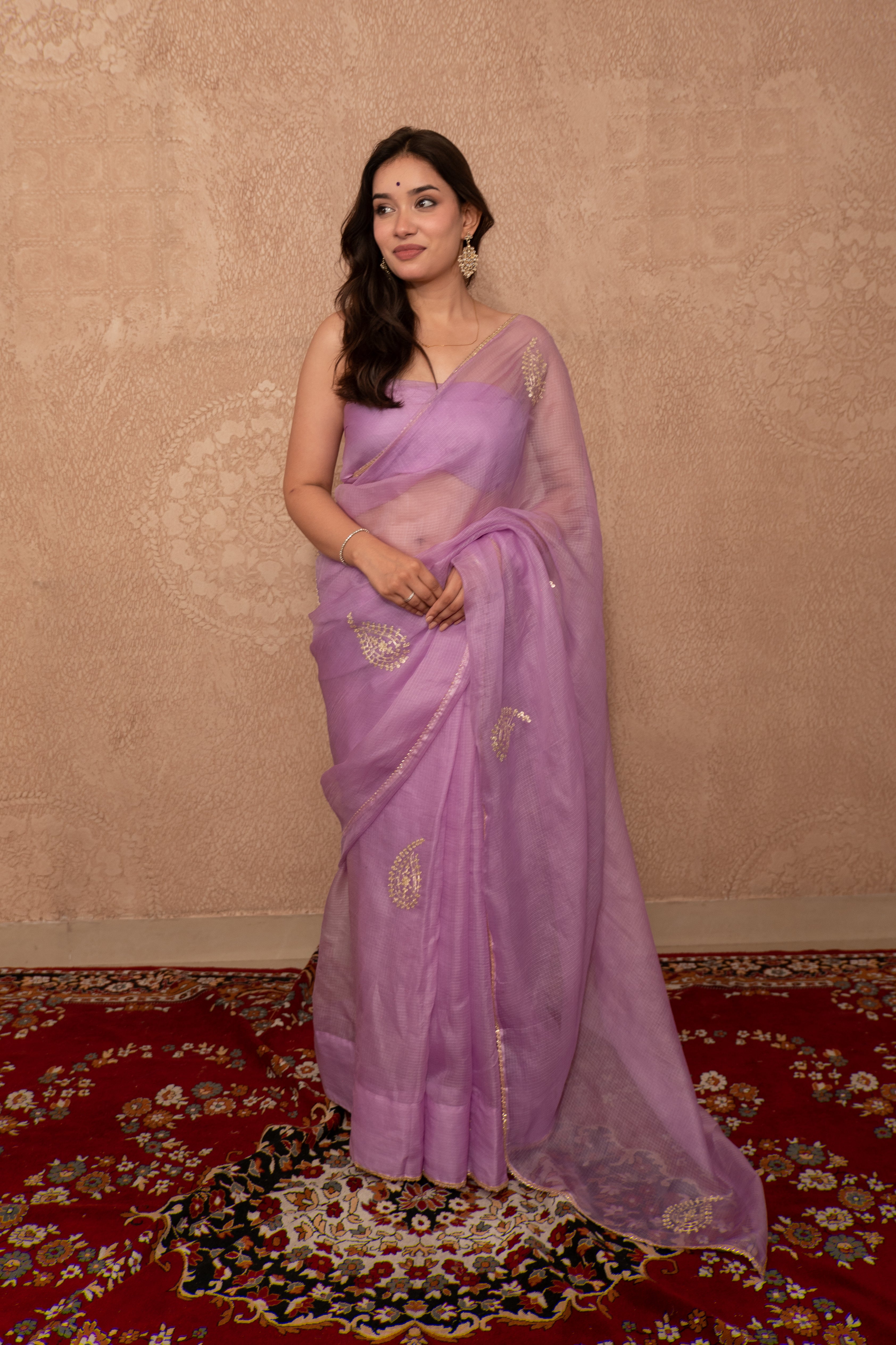 Step into understated elegance with this Mauve Kota Silk Saree adorned with delicate leaf pittan work. Crafted from lightweight Kota Silk, it drapes gracefully, offering comfort while adding a refined festive charm. The subtle mauve hue blends modern sophistication with traditional appeal, while the leaf-patterned pittan embroidery reflects timeless craftsmanship.