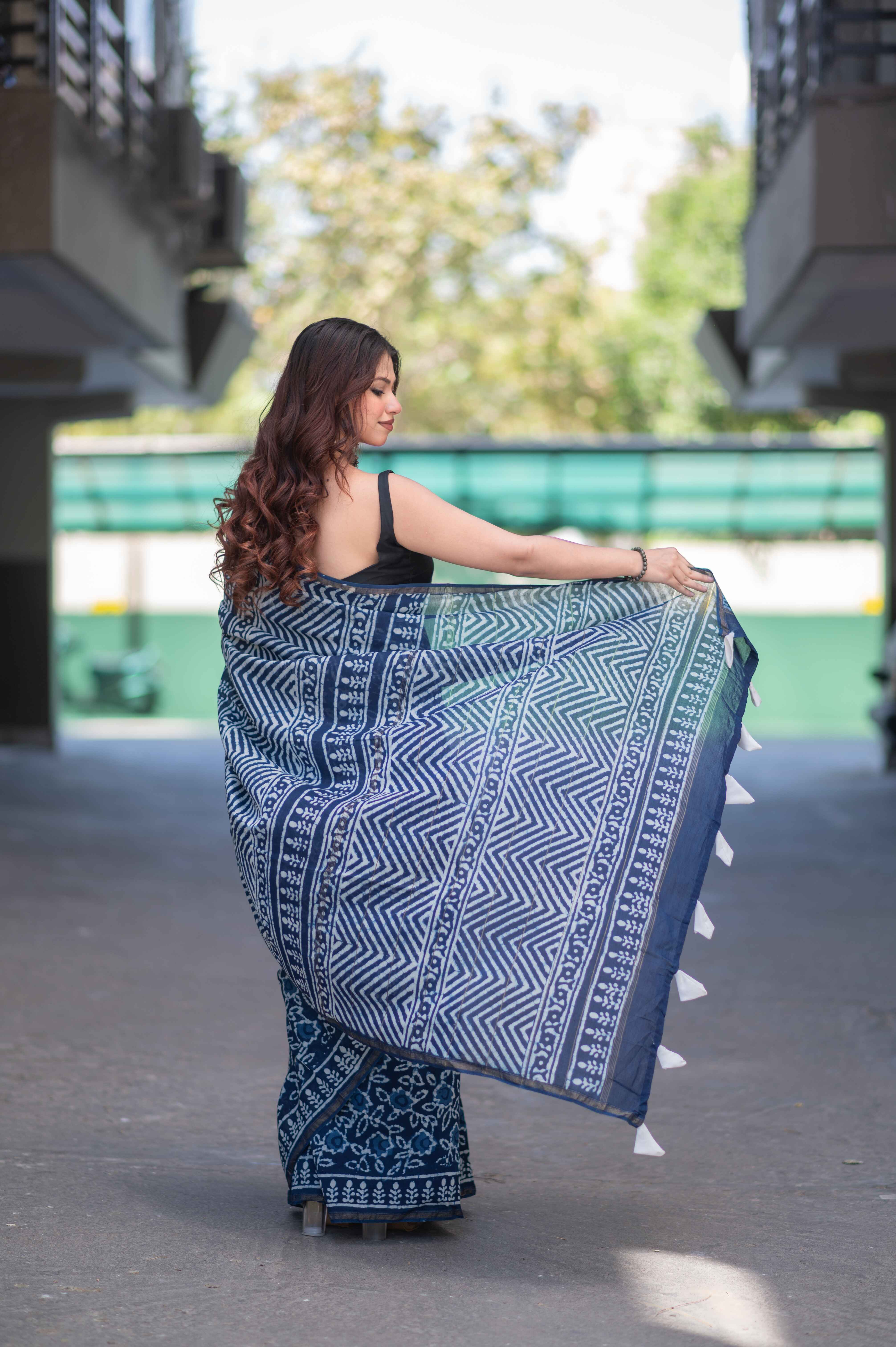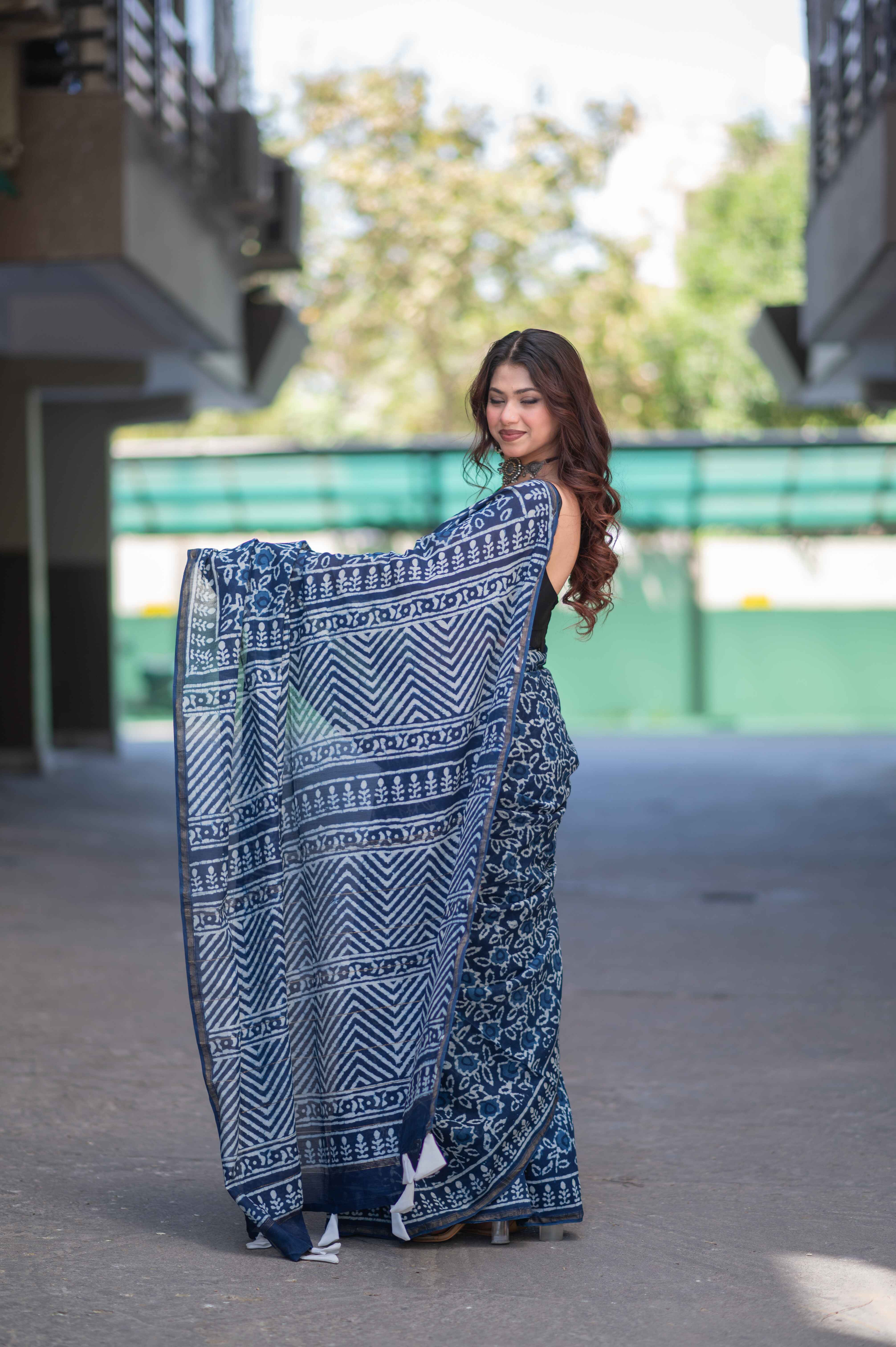 Introducing the Indigo Garden Maheshwari Silk Saree. A captivating ensemble that marries deep indigo hues with the delicate touch of white floral block prints. This saree is a testament to timeless elegance, designed for the modern woman who appreciates the allure of classic style.
