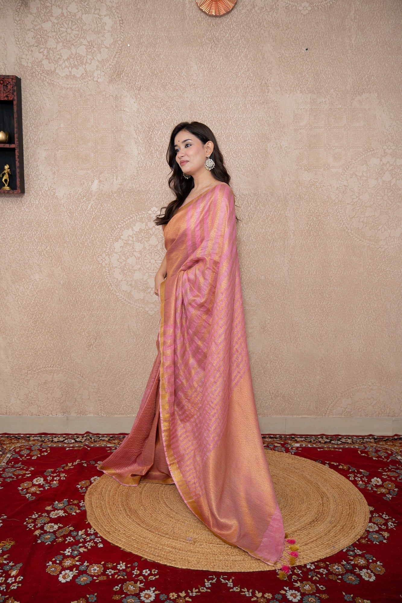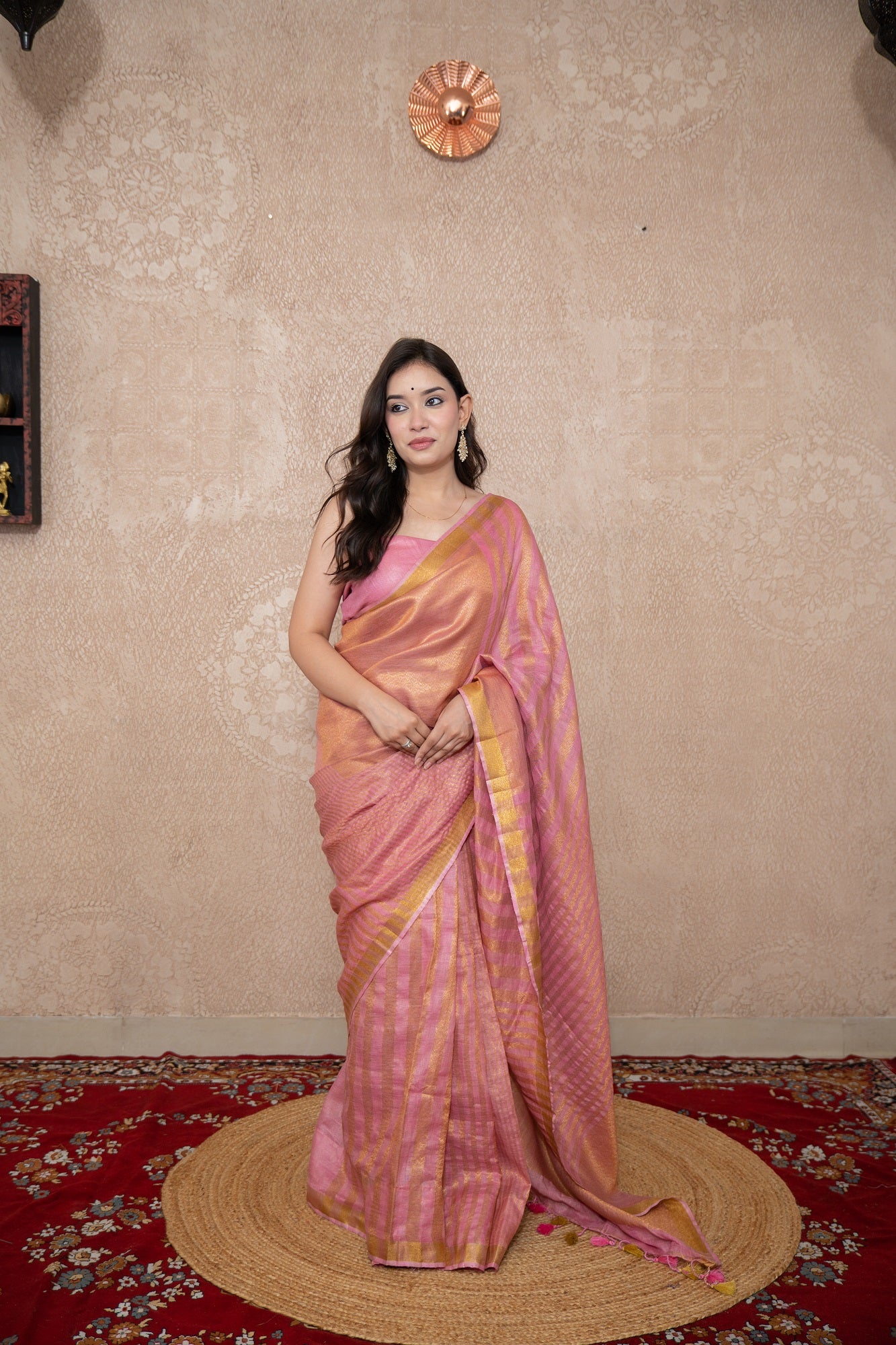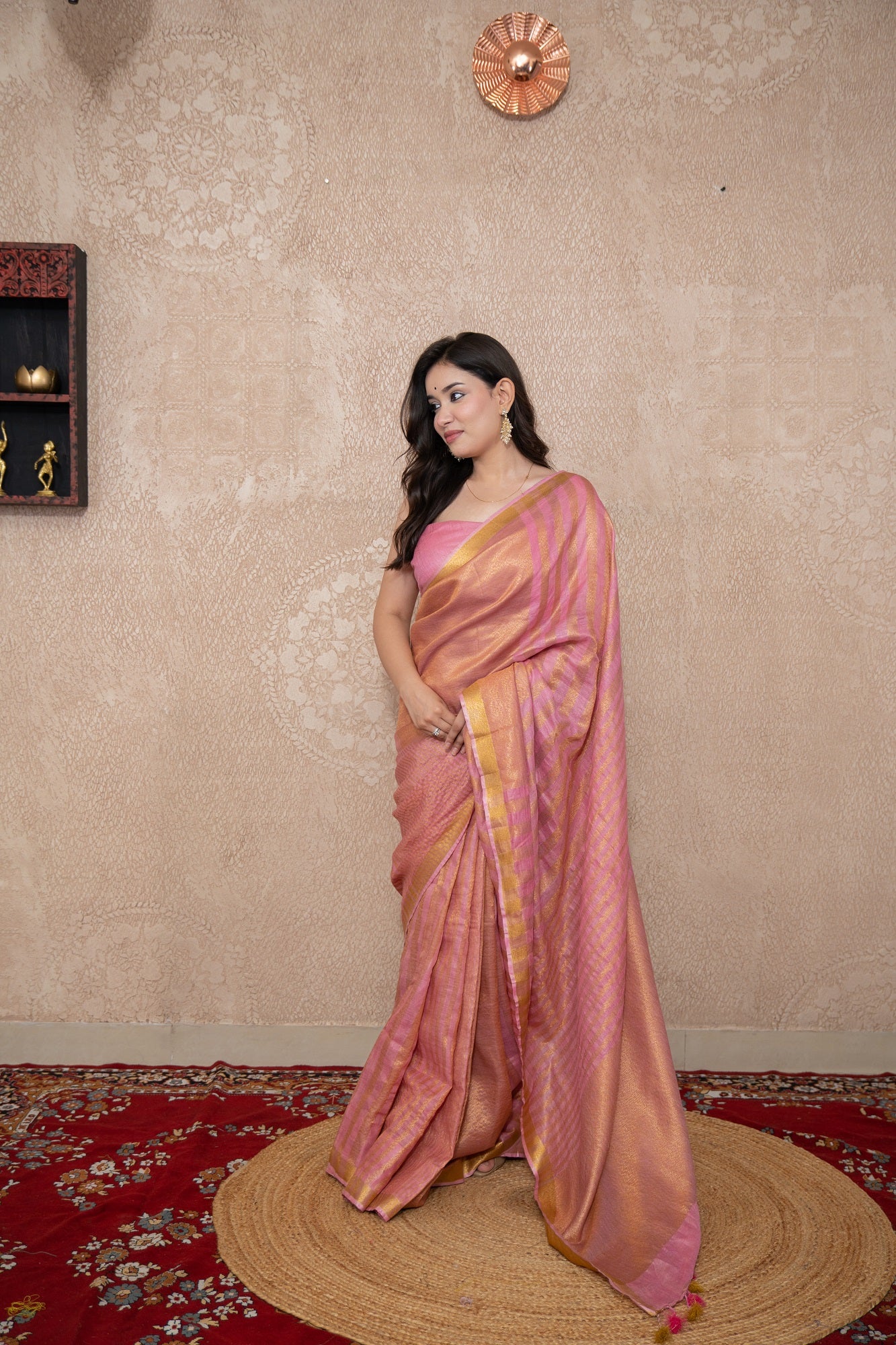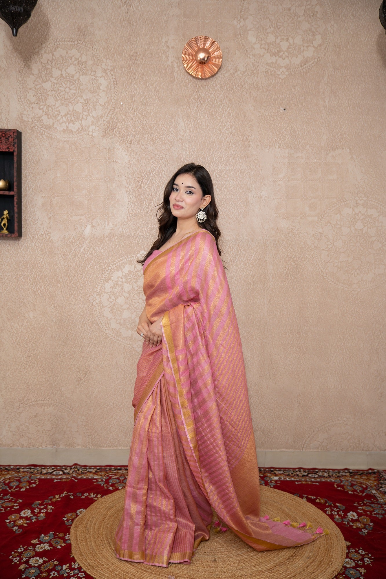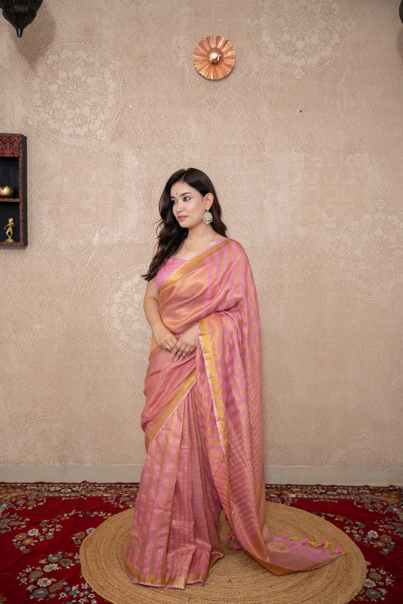 Soft, radiant, and effortlessly refined — Indulekha is a beautiful Pink Striped Zari Linen Saree that blends traditional weaving with modern charm. Part of our signature "Sone ki Abha" collection, it is perfect for festive brunches, temple visits, or graceful everyday elegance.