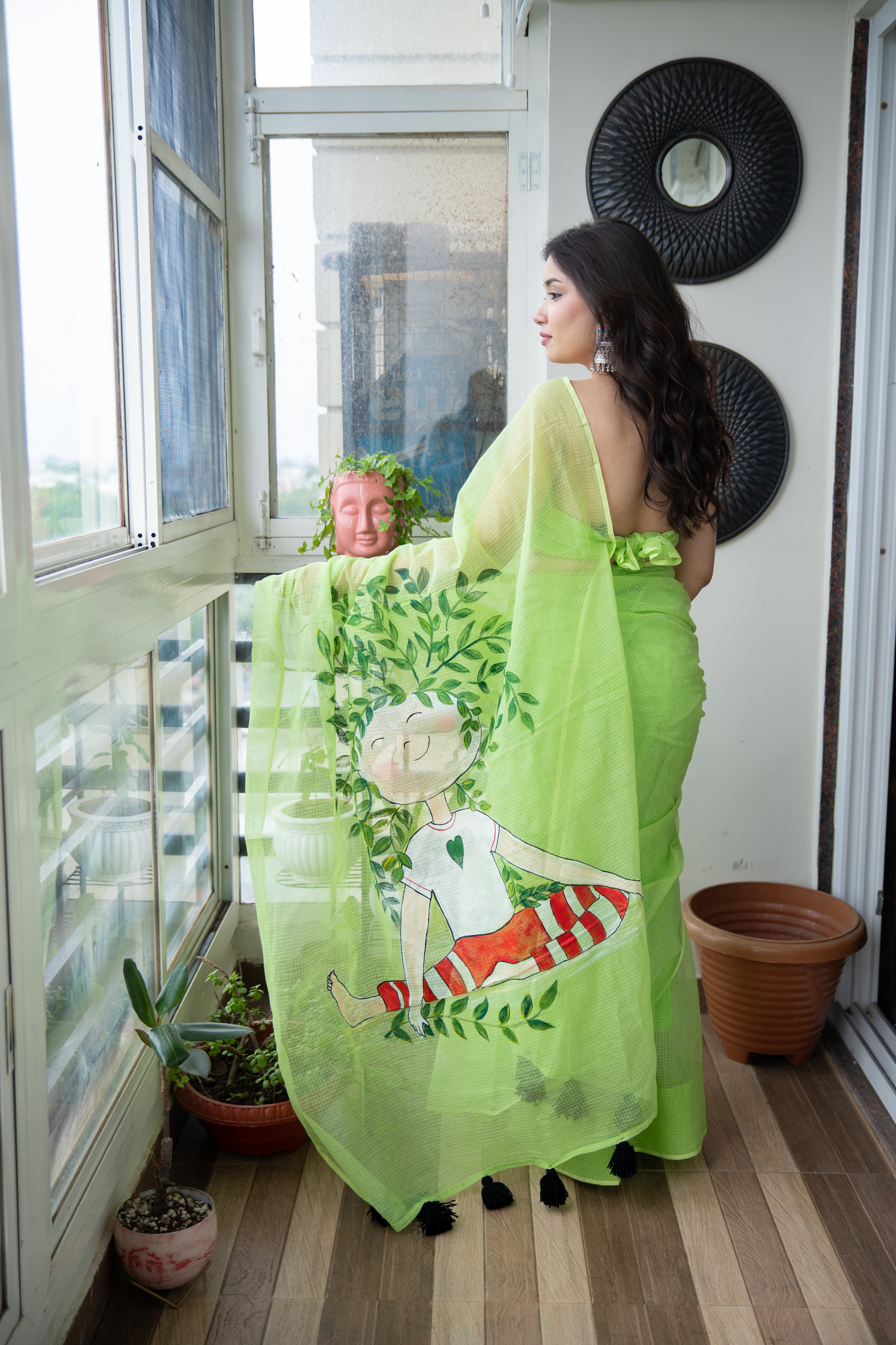 Experience timeless elegance with the Inner Peace Handpainted Kota Doria Saree. Crafted in soft, airy Kota Doria fabric, this green masterpiece features a meticulously handpainted pallu and delicate black tassels. Perfect for festive celebrations or intimate gatherings, it blends traditional artistry with modern grace.
