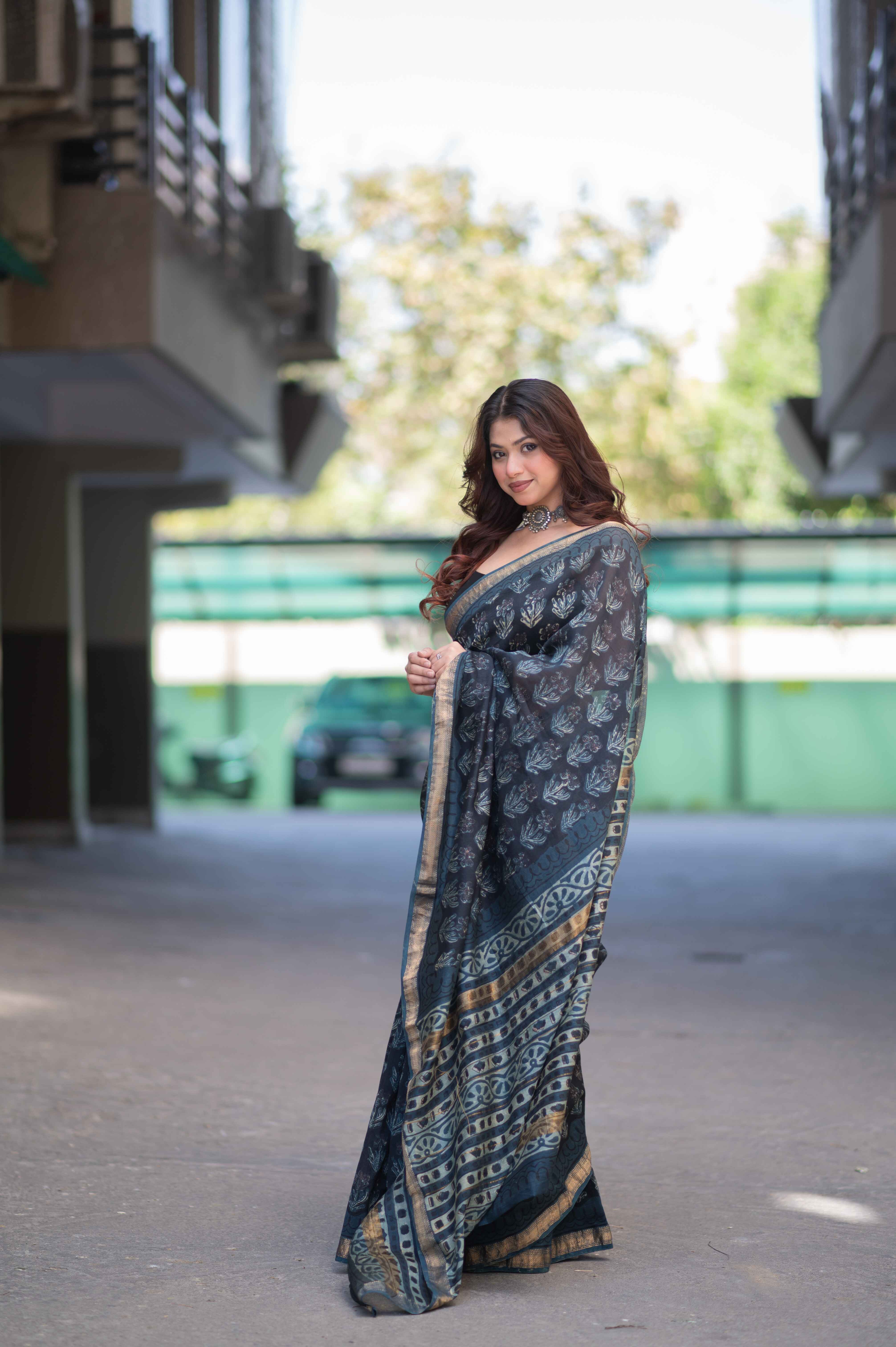 Crafted from premium Maheshwari silk, this saree showcases the intricate beauty of Ajrakh block printing, a centuries-old technique using natural vegetable dyes. The rich blue hues, combined with the soft sheen of Maheshwari silk, create an exquisite drape that exudes grace and elegance. The saree is lightweight yet opulent, ensuring effortless styling and day-long comfort.