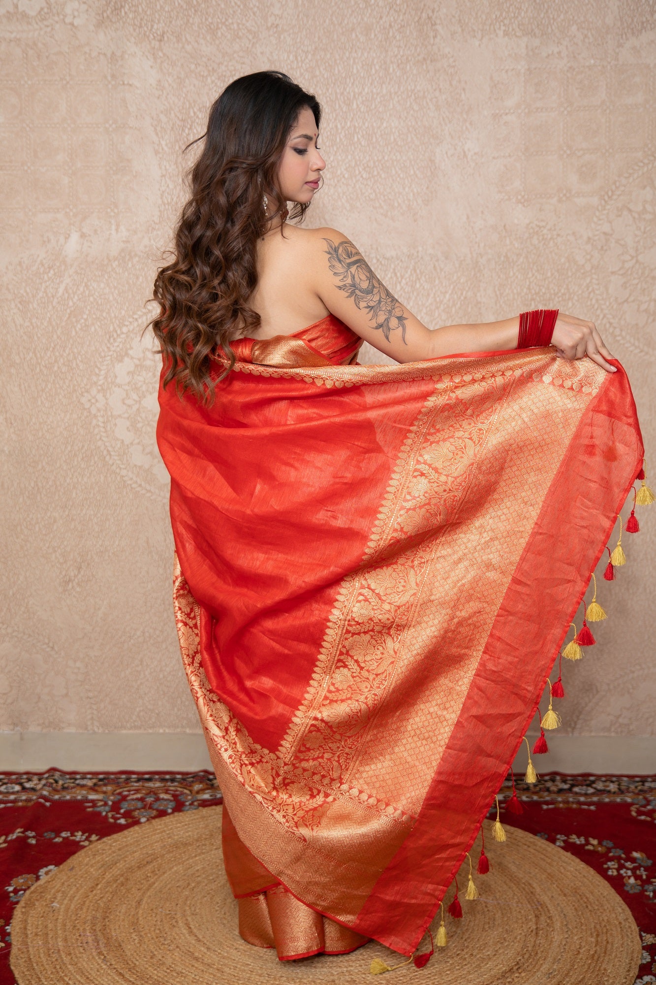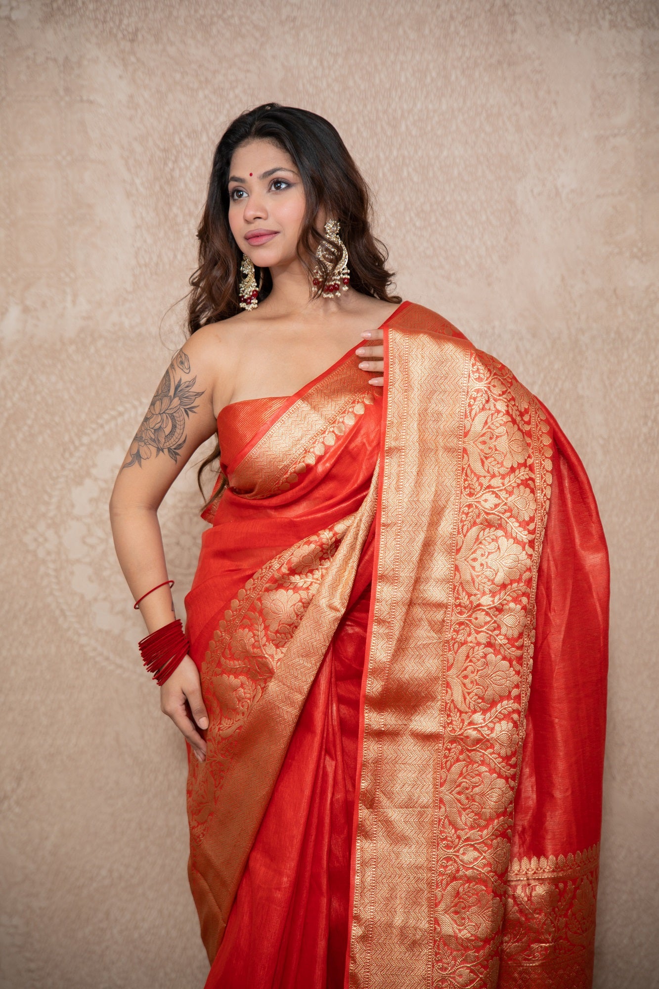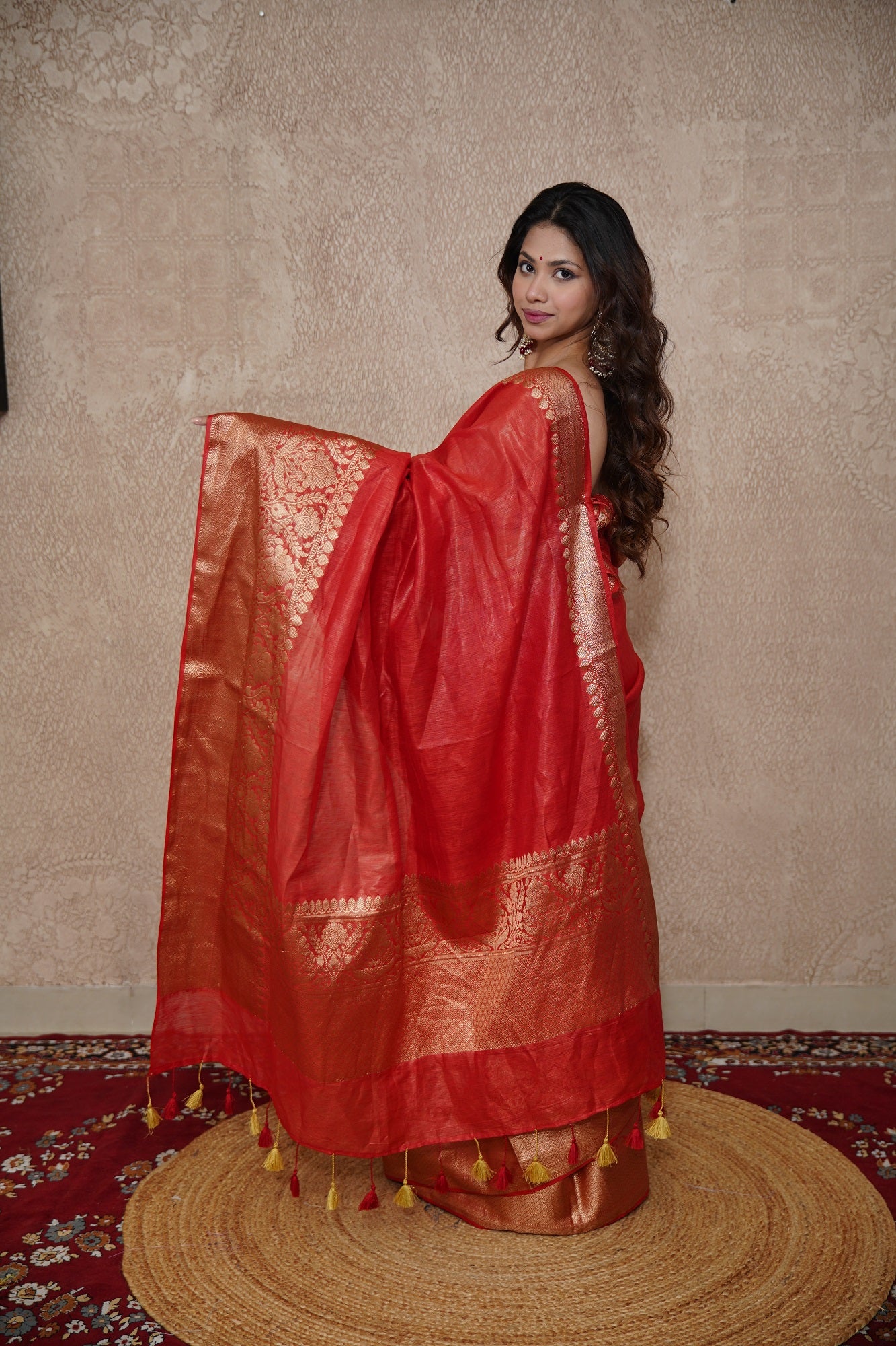 Bold. Elegant. Unapologetically timeless—Kaavya is a stunning Red Silk Linen Saree that celebrates the essence of tradition with a touch of modern minimalism. As a hero piece from our "Sone ki Abha" collection, Kaavya is designed for grand occasions where you want to make a powerful yet graceful statement.