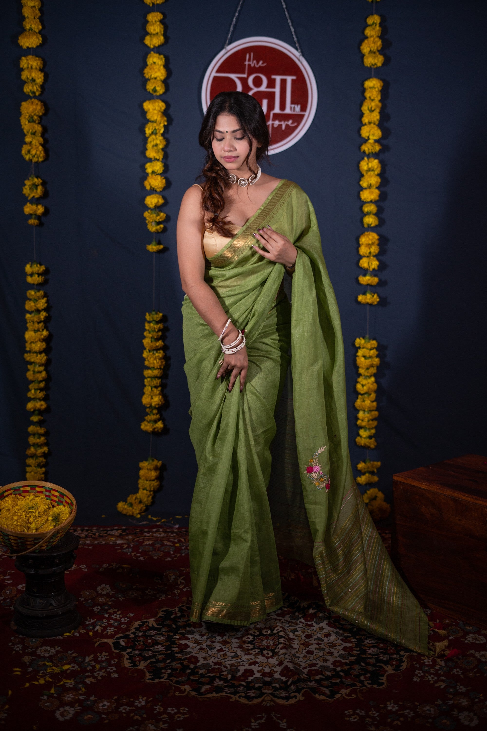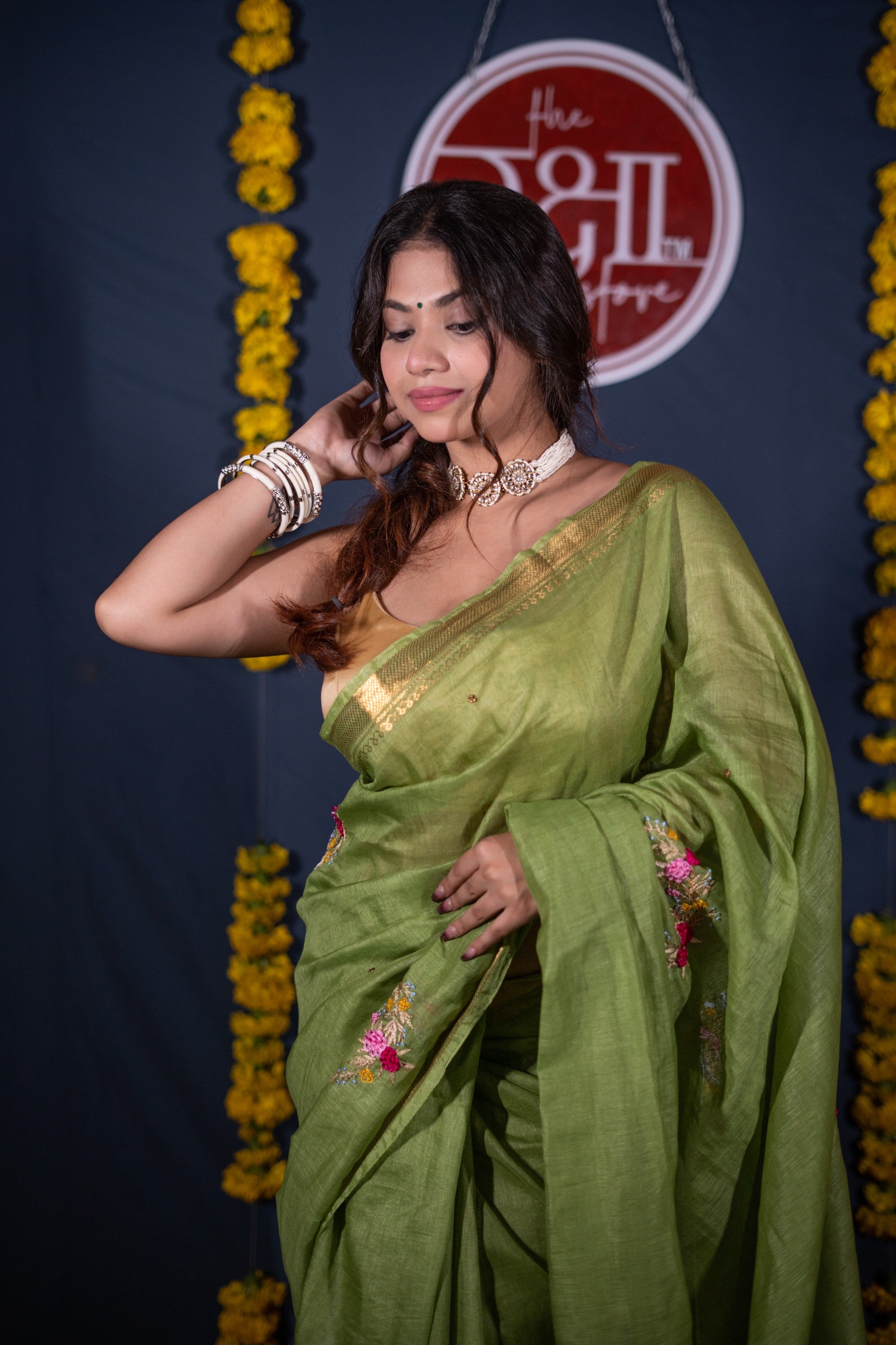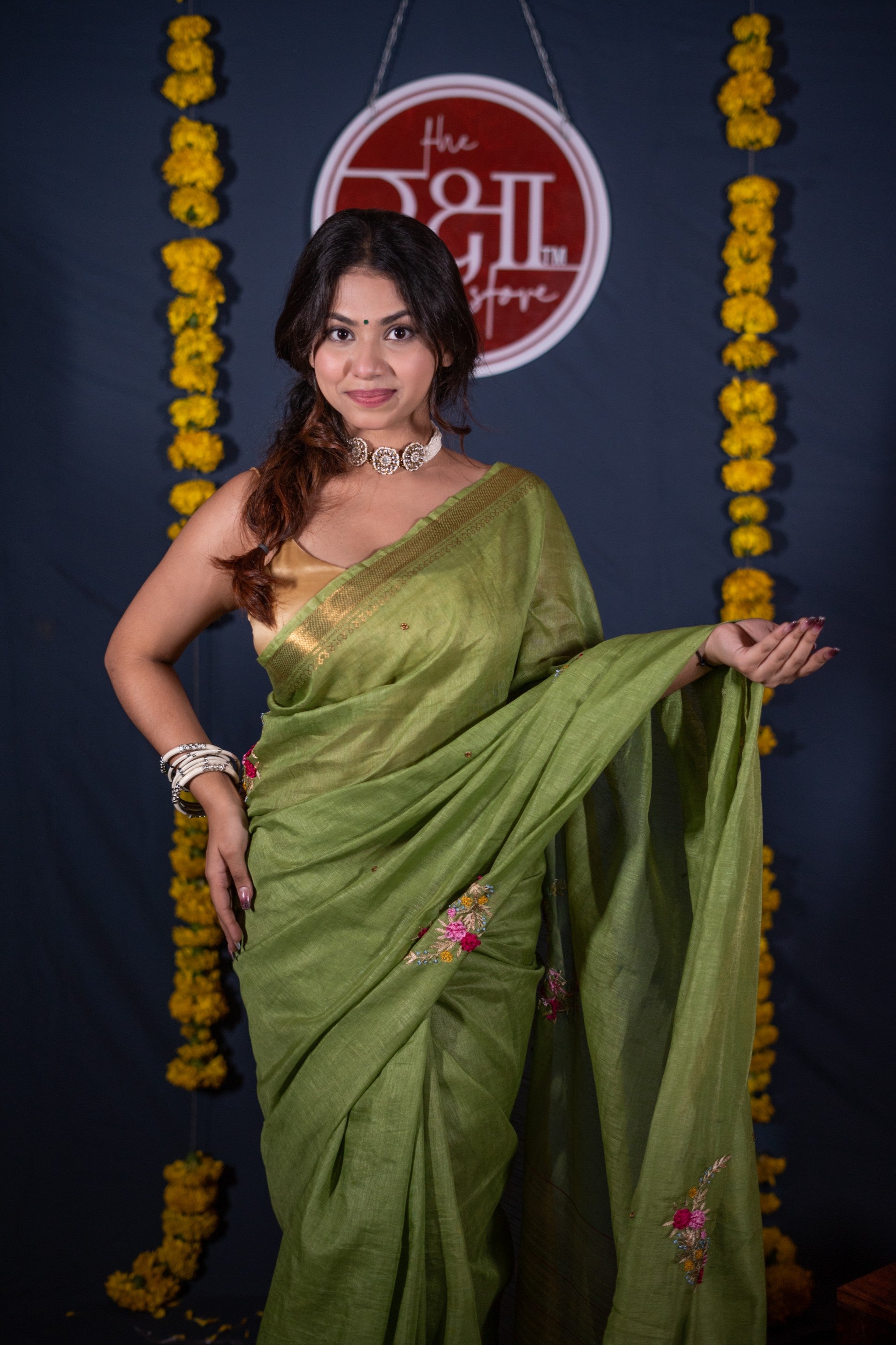 The silk linen fabric combines the lightweight comfort of linen with the luxurious sheen of silk, making it ideal for festive gatherings, weddings, or elegant evening outings. The floral embroidery saree design paired with the golden border ensures you stand out effortlessly.
