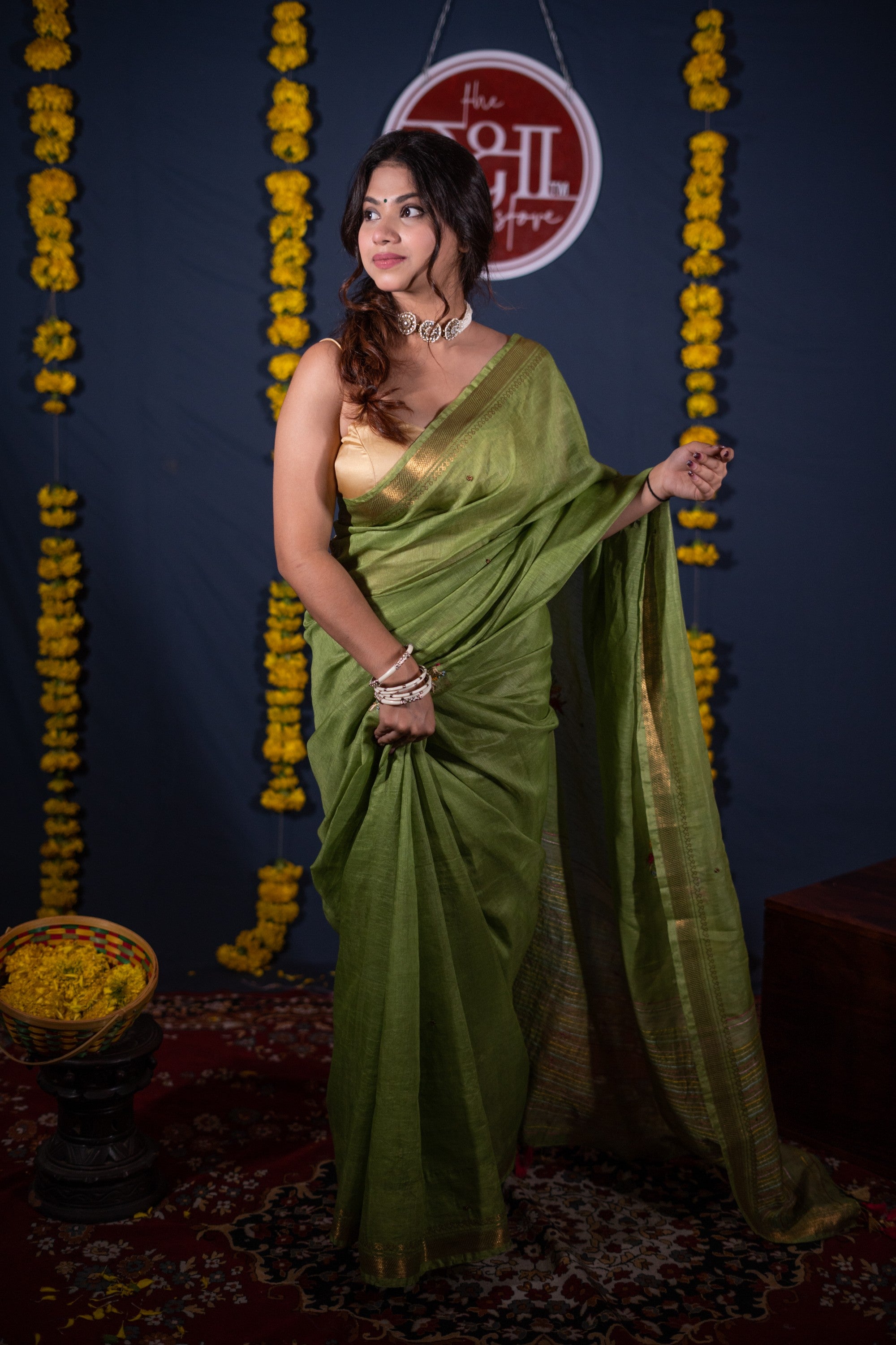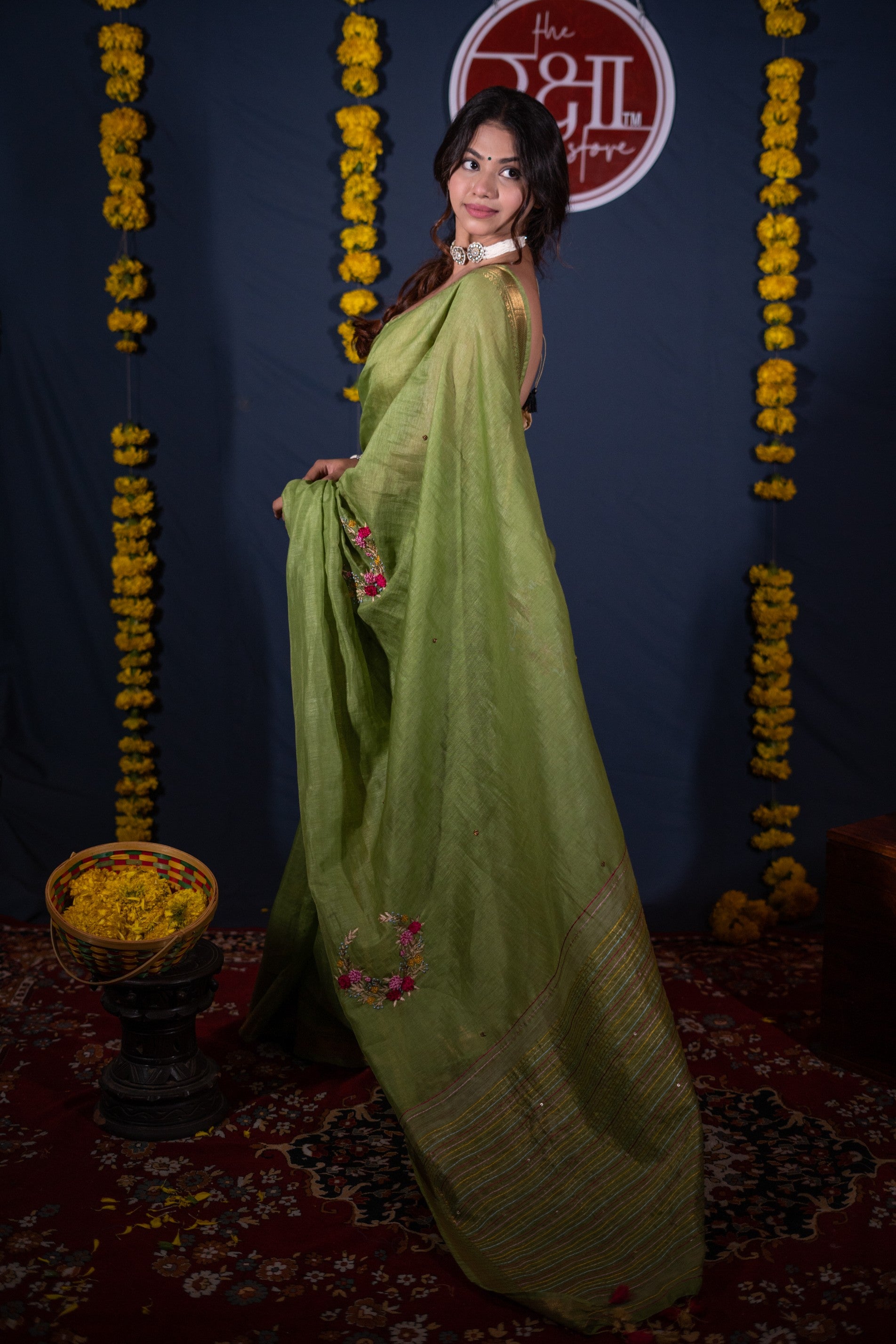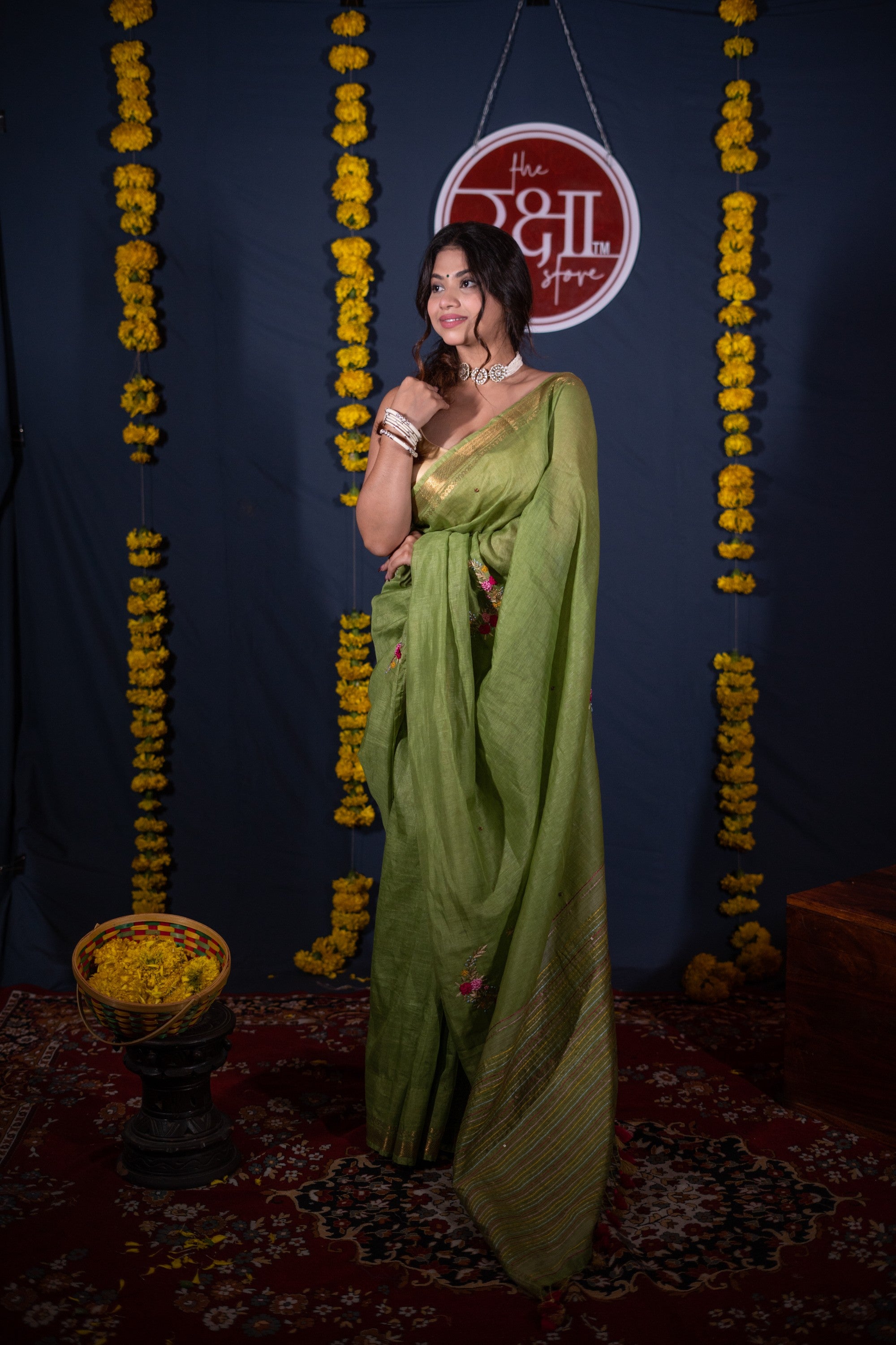 The silk linen fabric combines the lightweight comfort of linen with the luxurious sheen of silk, making it ideal for festive gatherings, weddings, or elegant evening outings. The floral embroidery saree design paired with the golden border ensures you stand out effortlessly.