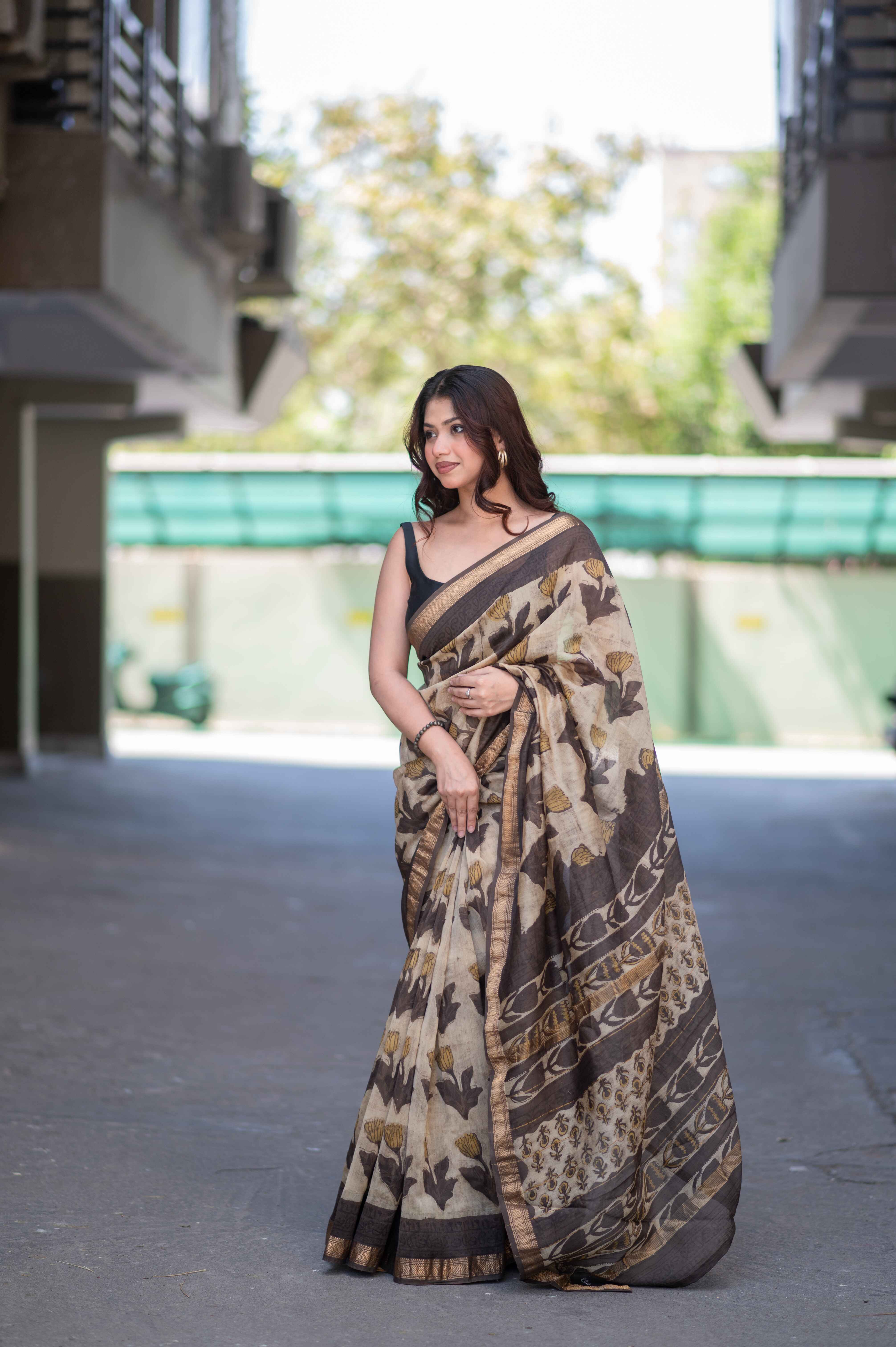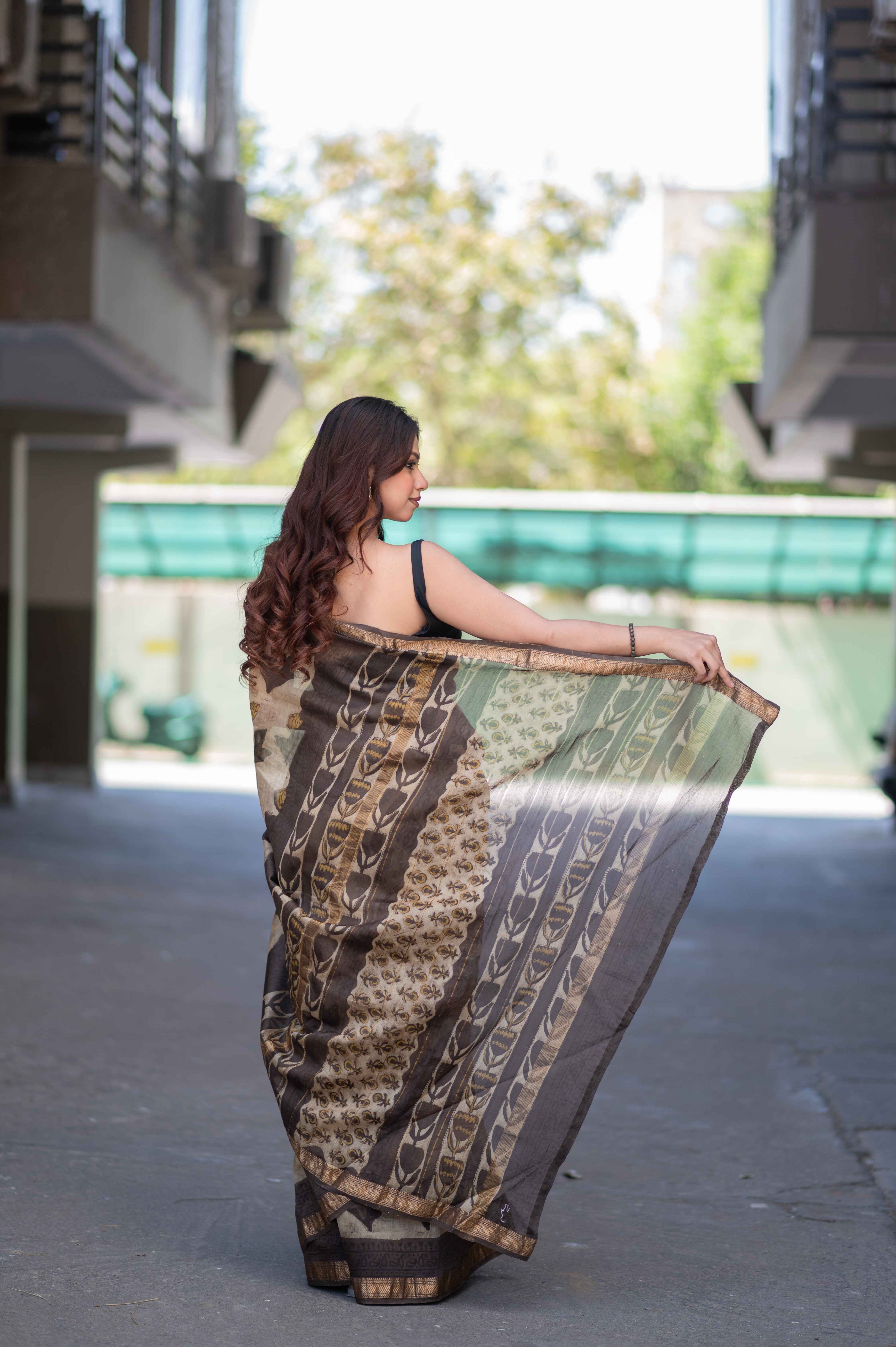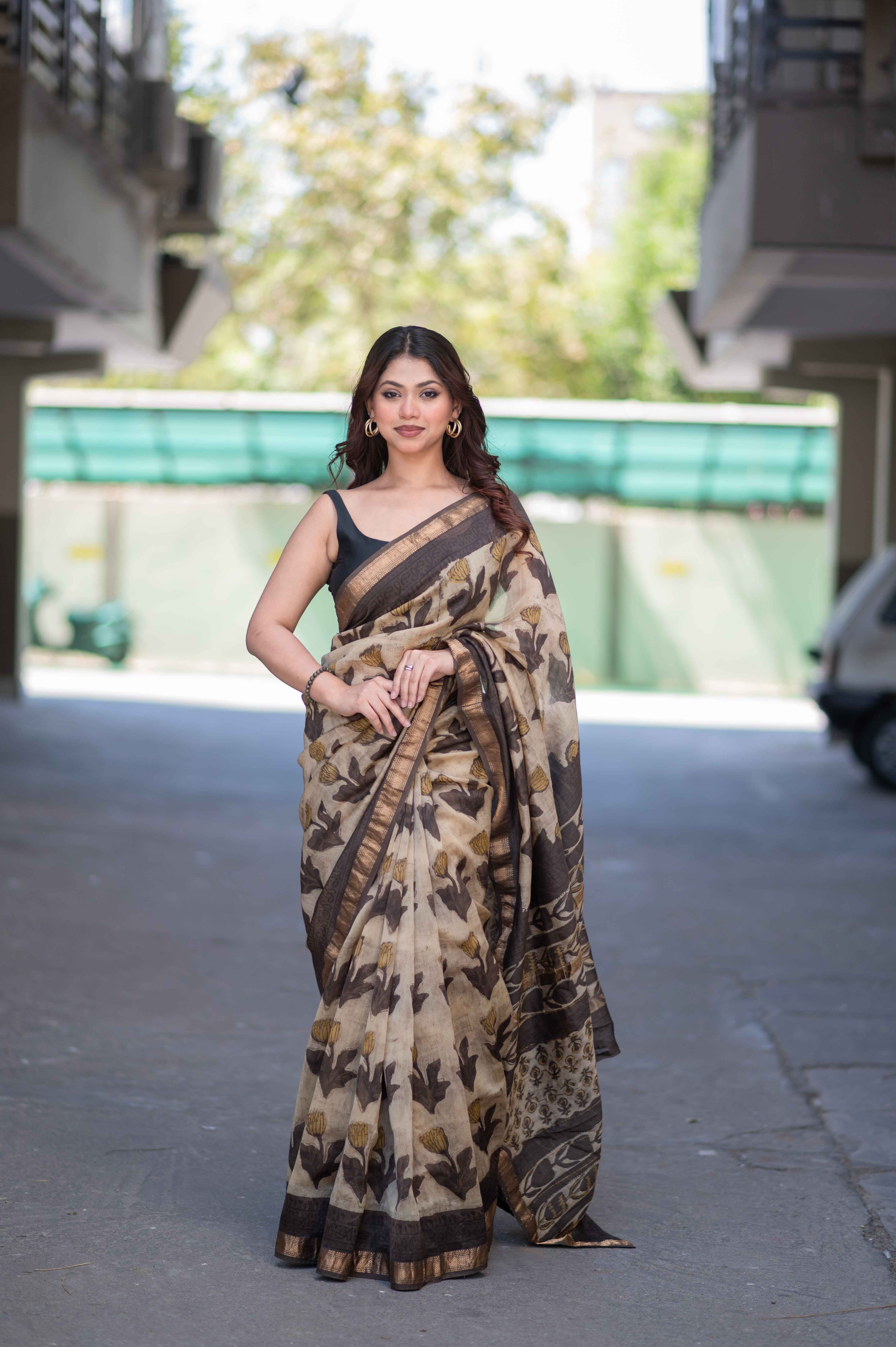 Kamalini- Beige Ajrakh Maheshwari Silk Saree