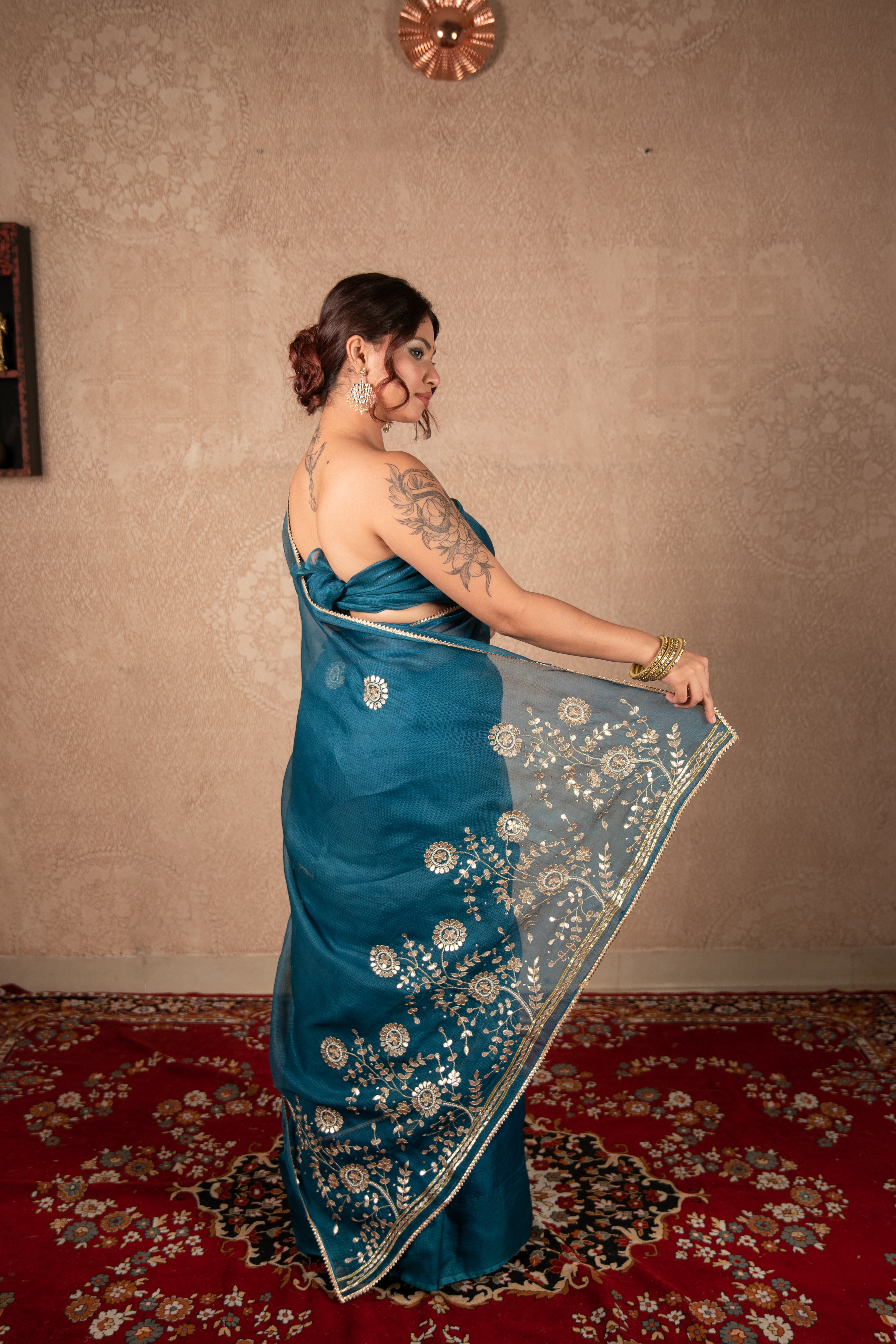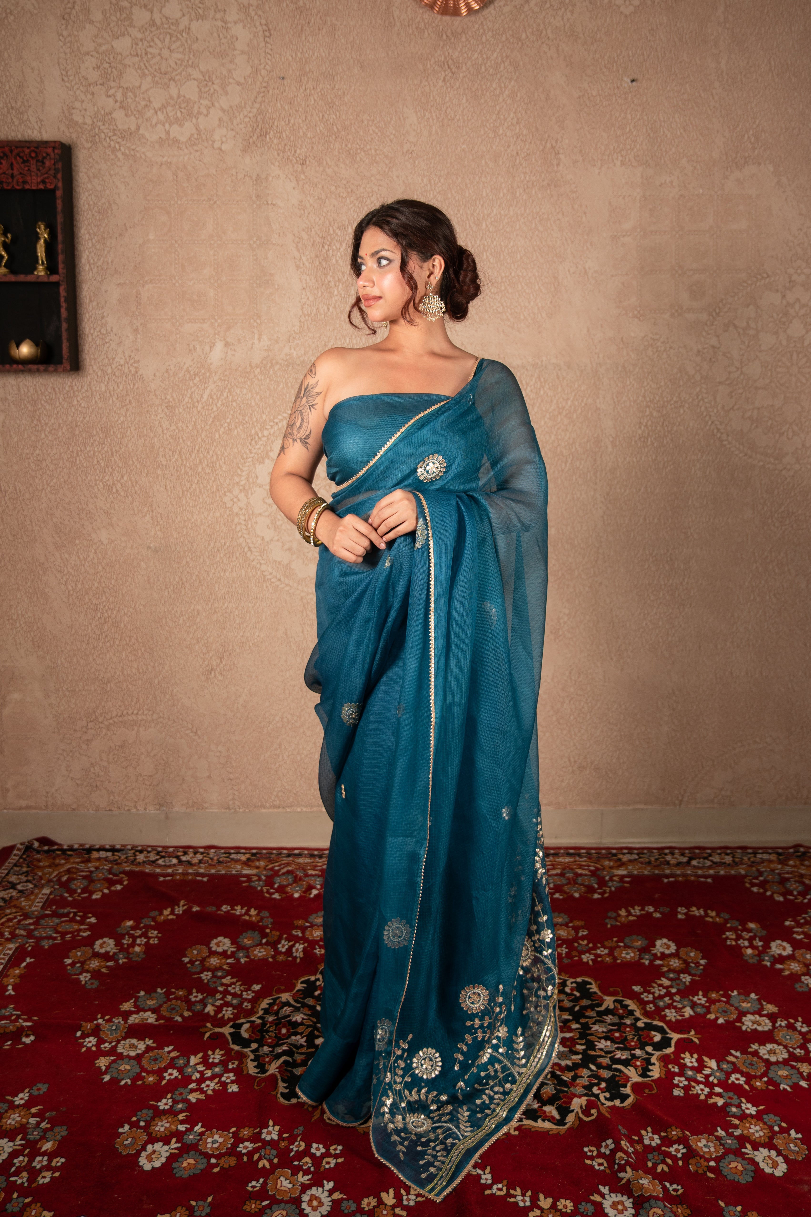 Turn heads with this Teal Blue Kota Silk Saree, adorned with exquisite gota jaal work on the pallu and finished with a delicate lace border. Made from lightweight and breathable Kota Silk, this saree drapes with effortless grace while offering comfort and style. The rich teal blue hue combines depth with vibrancy, perfectly highlighted by the shimmering gota embroidery that adds a festive grandeur.