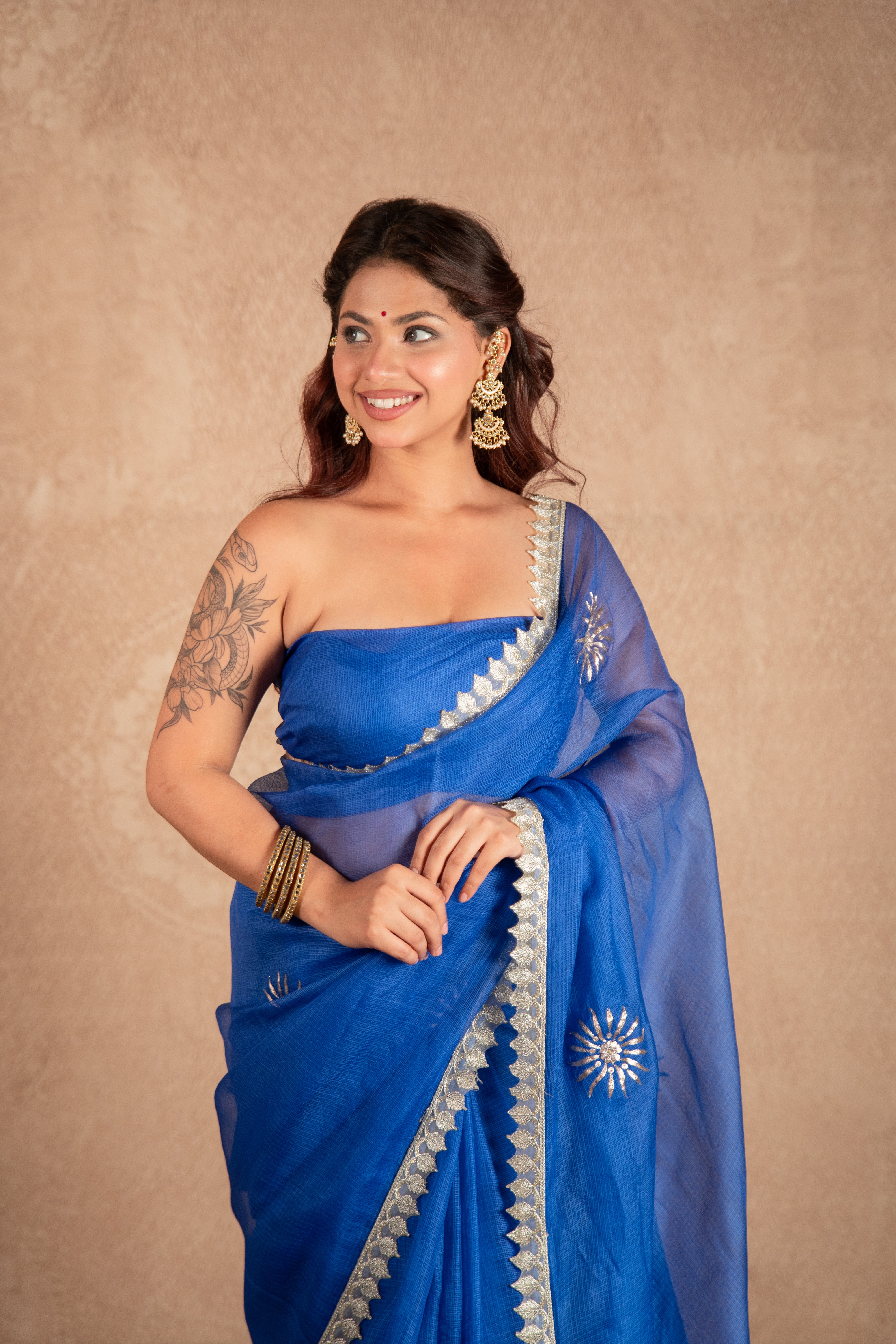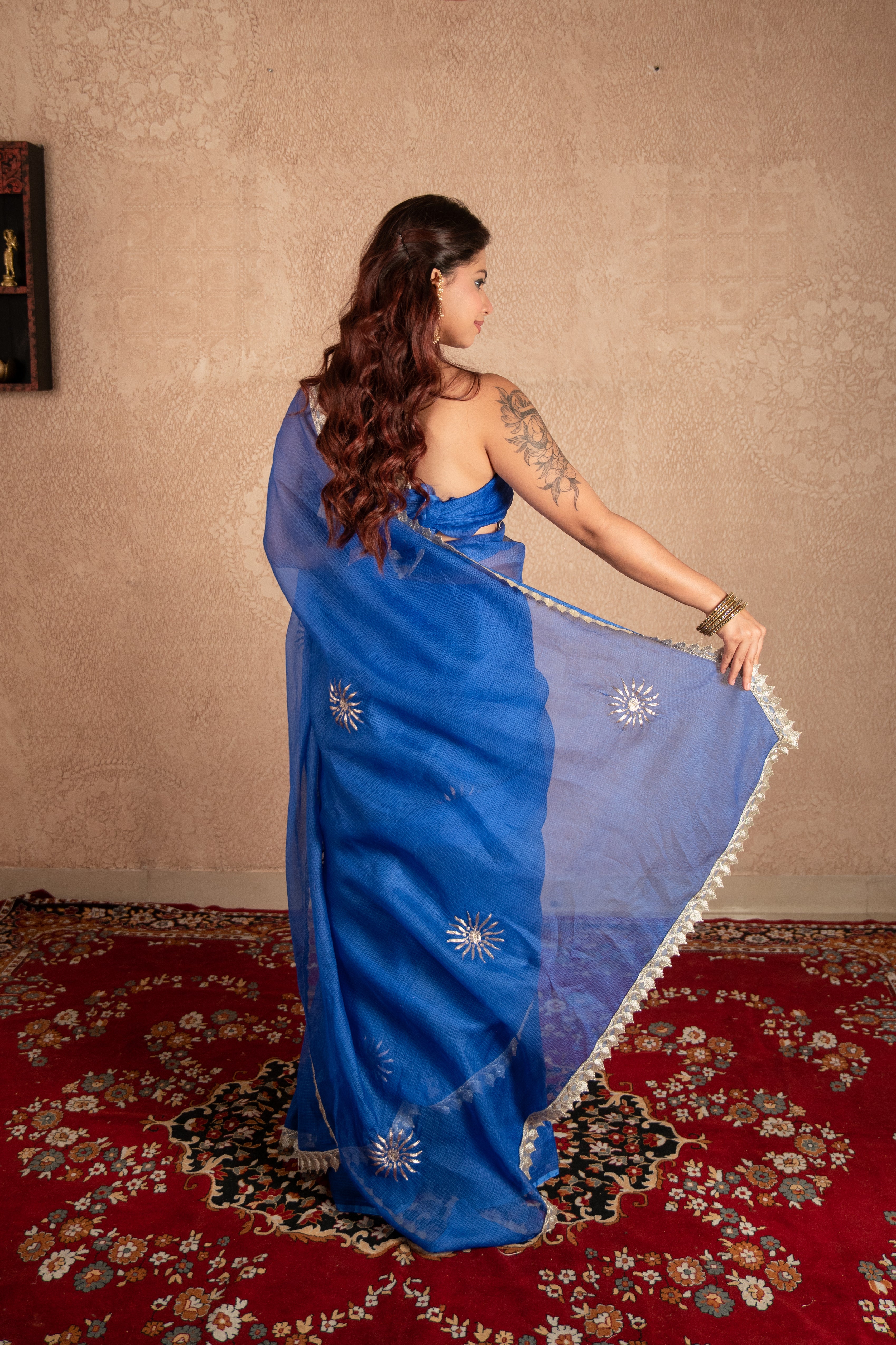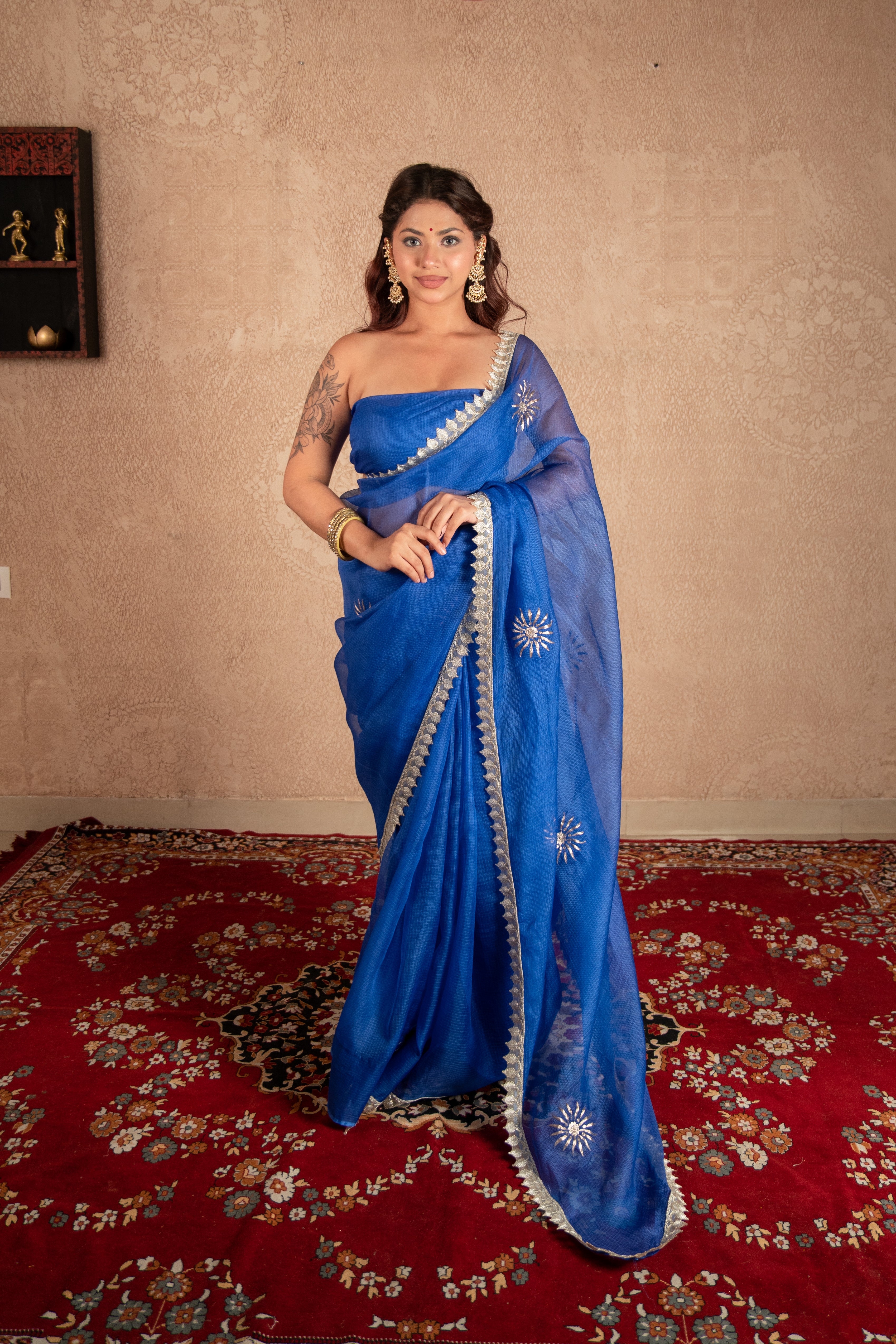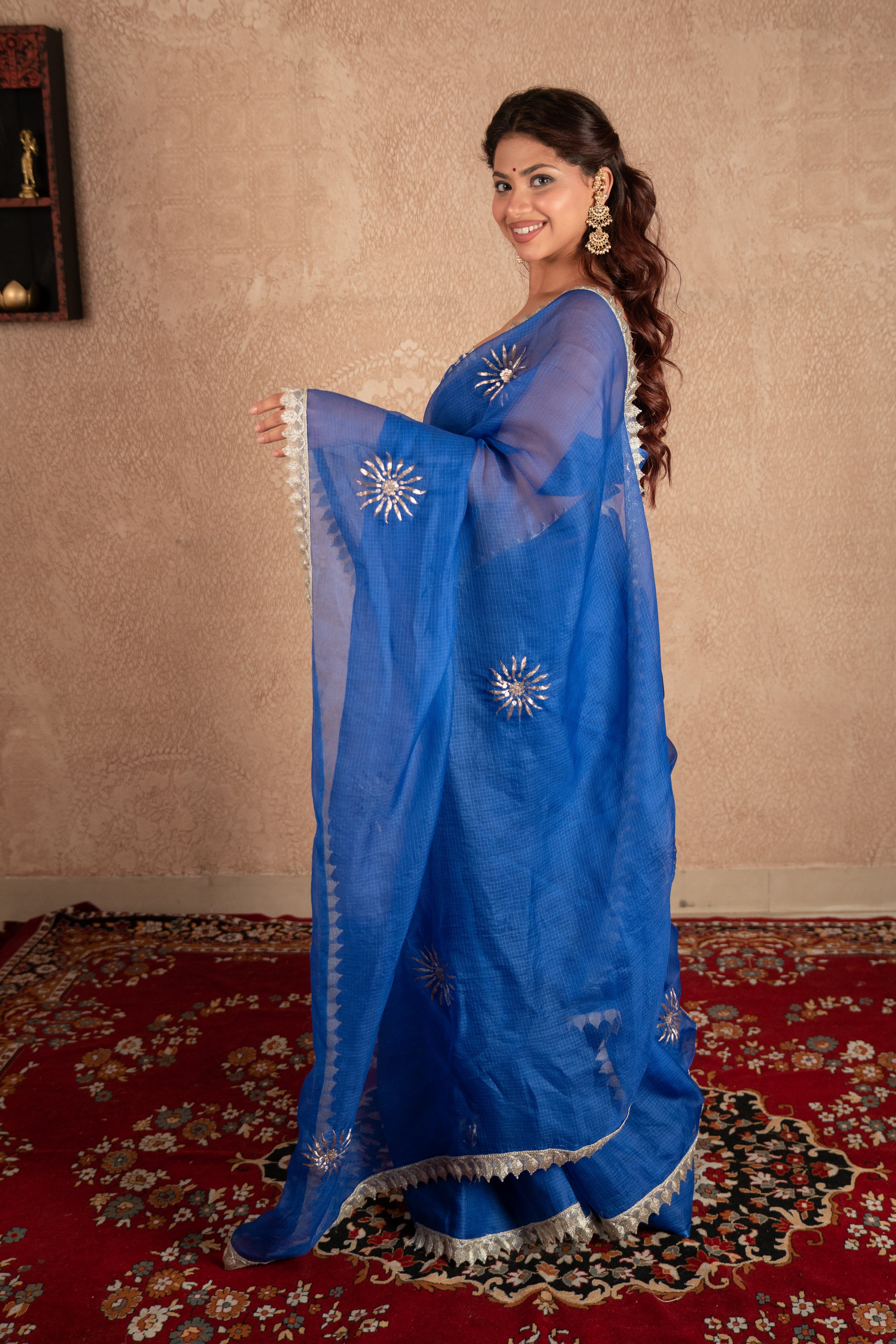 Step into elegance with this Blue Kota Silk Saree beautifully designed with hand pittan buti work and lace all over. Woven from airy Kota Silk, it drapes lightly while keeping you comfortable throughout the day. The royal blue hue brings out sophistication and charm, while the shimmering pittan buti embroidery adds artisanal finesse and festive allure.
