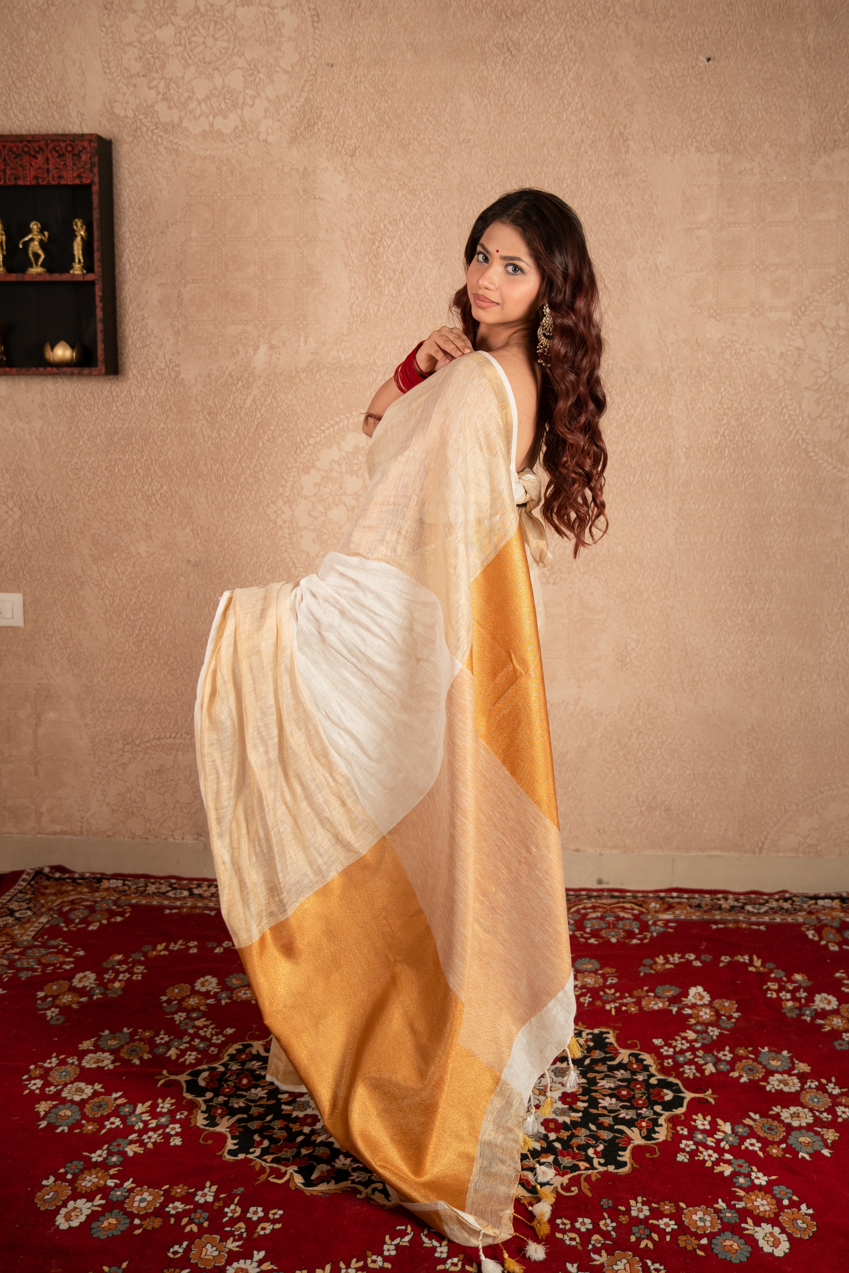 Step into timeless elegance with this White Linen Saree, accentuated by a striking broad golden border. Crafted from soft and breathable linen, this saree offers a perfect blend of comfort and sophistication, making it an ideal choice for festive occasions, cultural events, and formal gatherings.