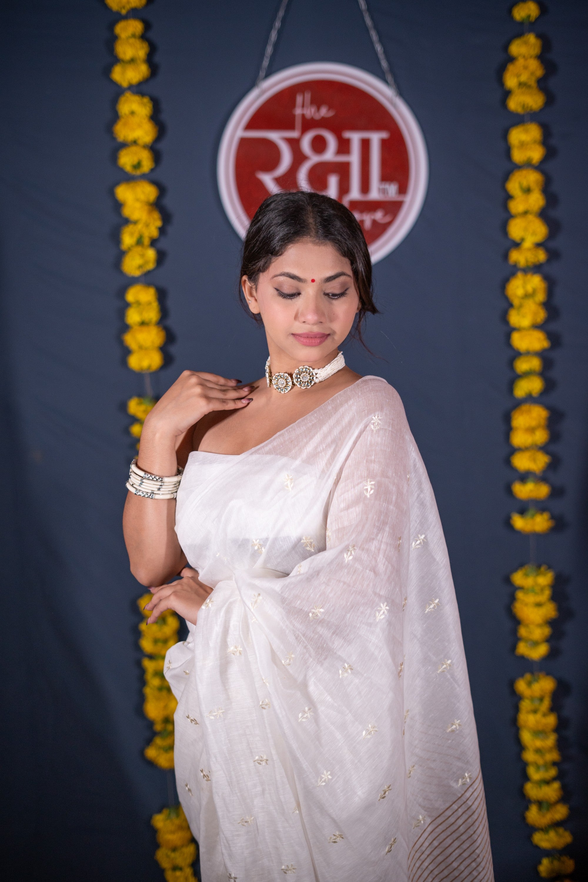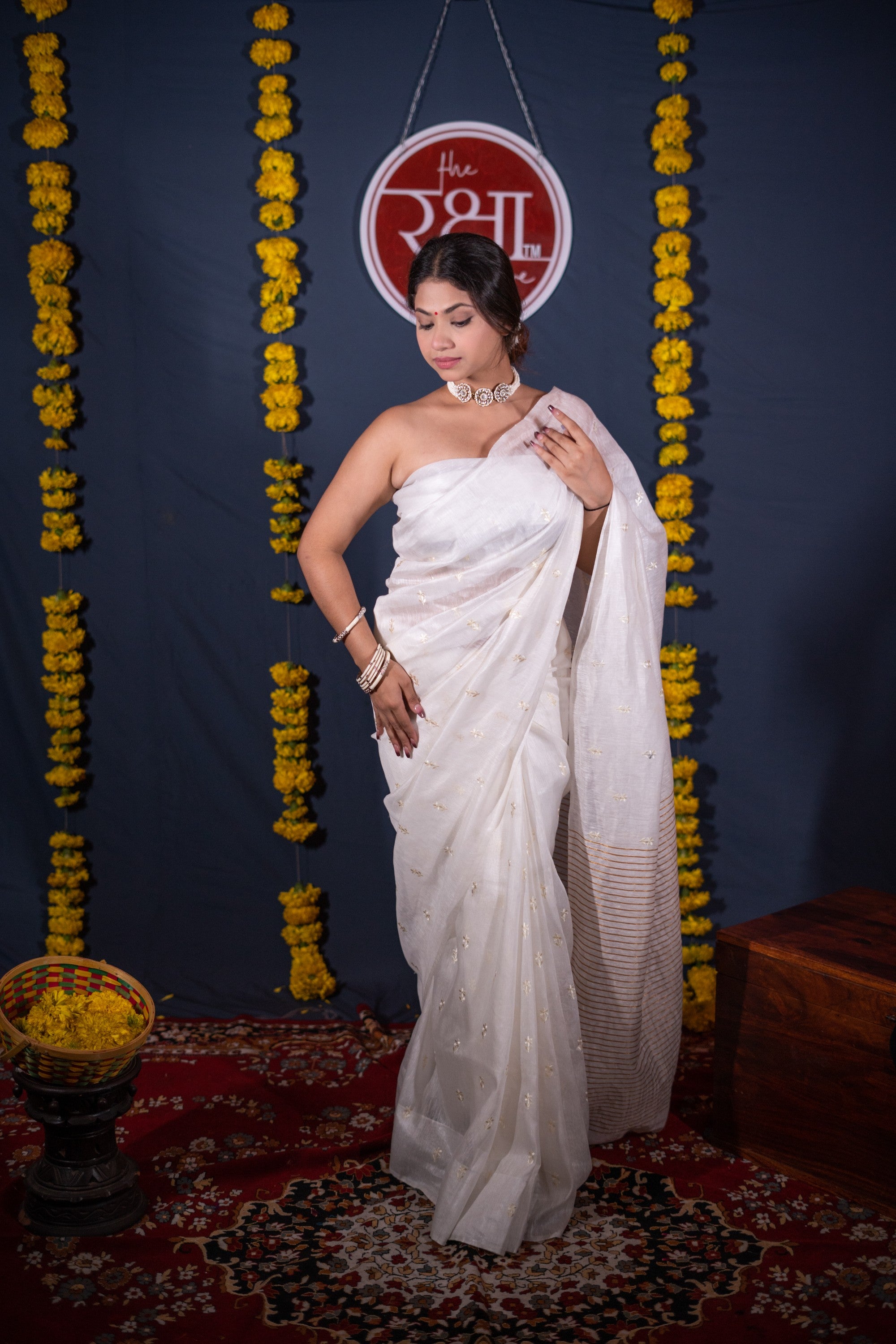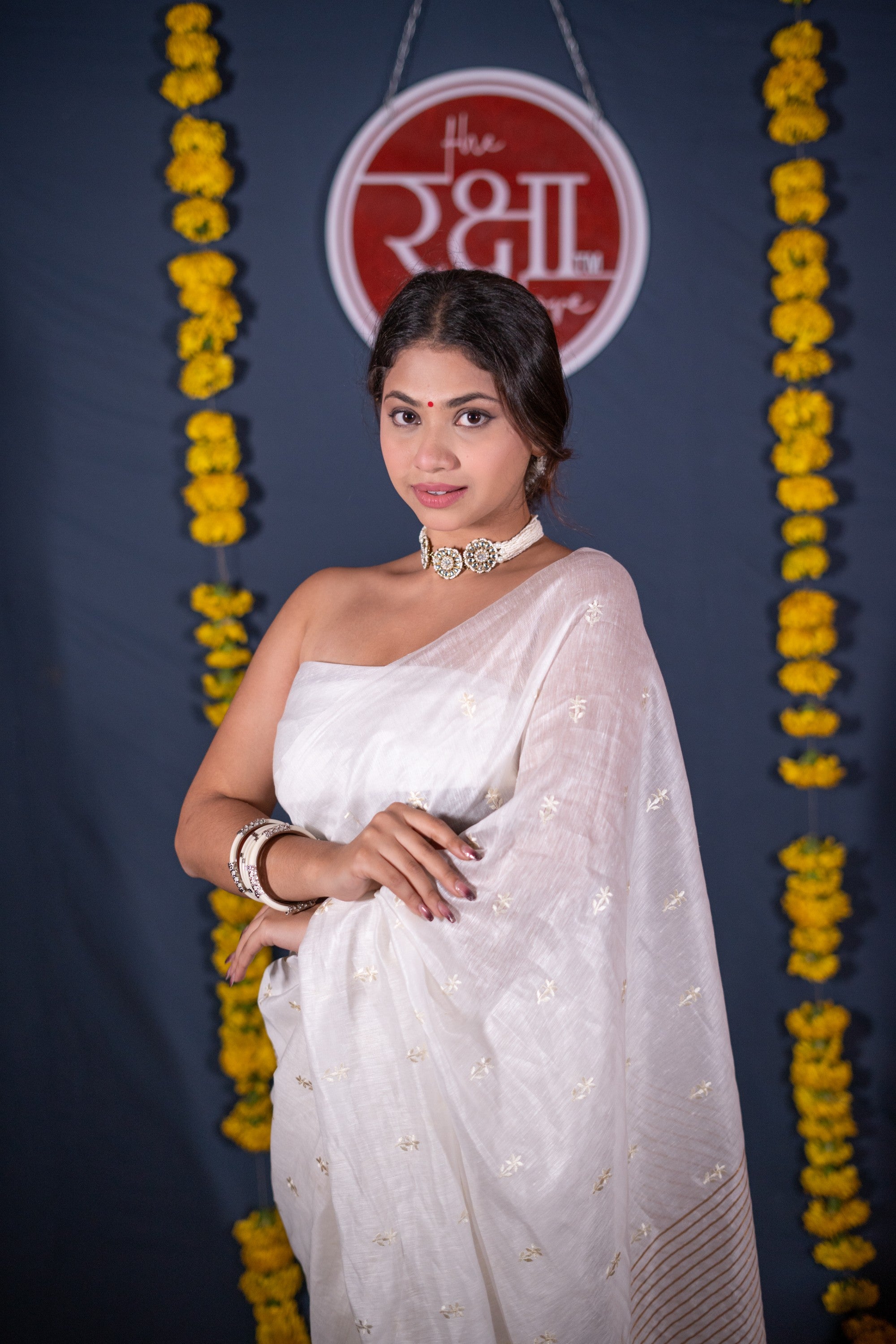Whether you're attending a family gathering, festival, or wedding, this white embroidered silk linen saree is a versatile addition to your ethnic wardrobe. The breathable silk linen fabric ensures comfort without compromising on style, while its delicate embroidery and golden details make a statement of elegance and tradition.