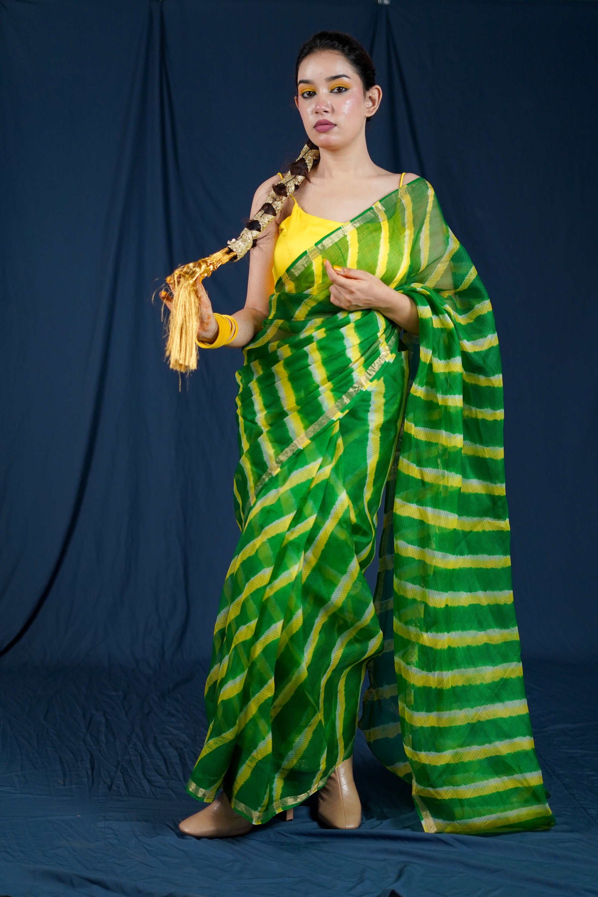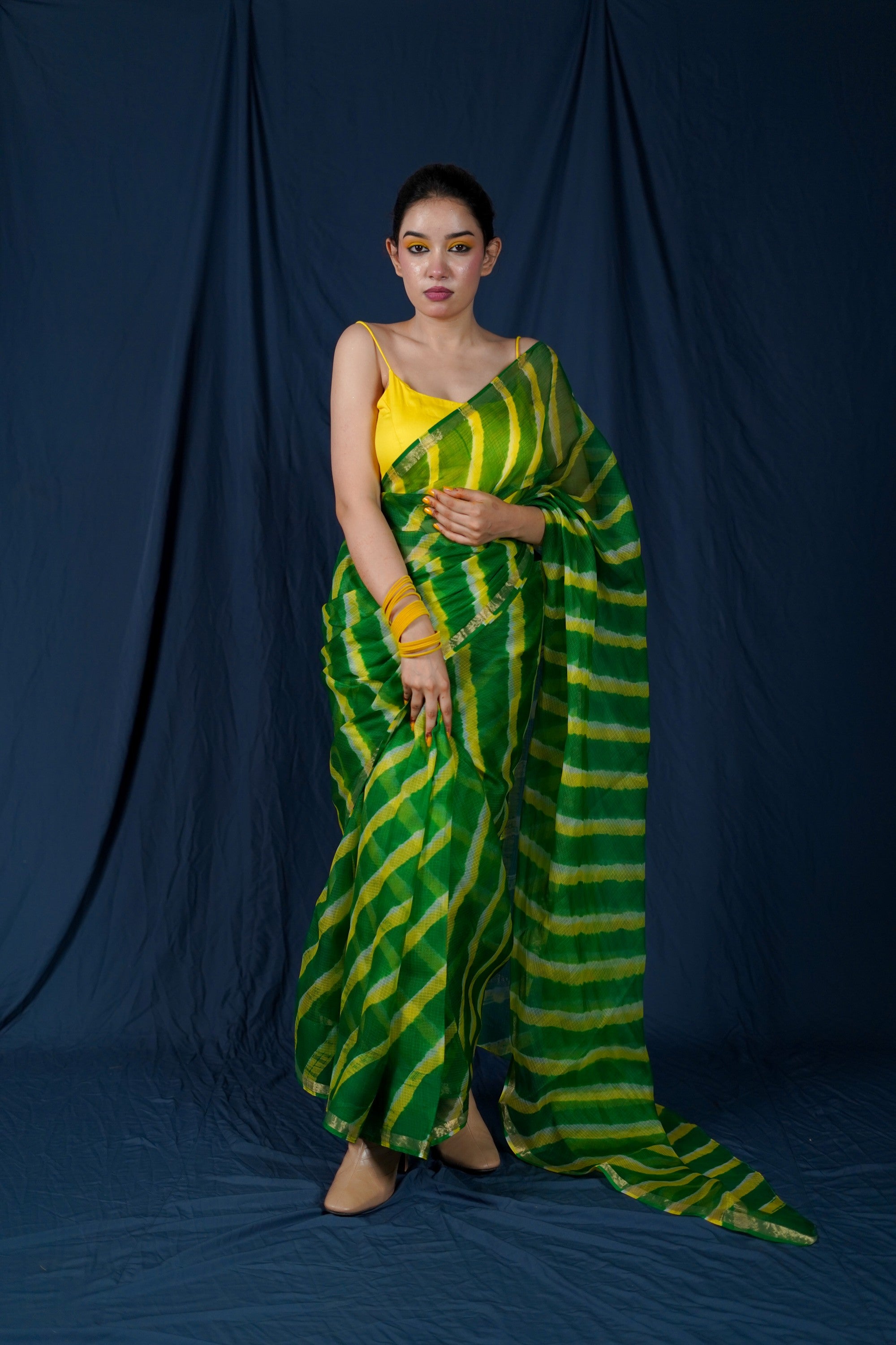 Vibrant Leheriya Pattern: The vibrant green and yellow hues in a classic Leheriya pattern create a mesmerizing visual appeal. It adds a touch of tradition and culture to the saree.