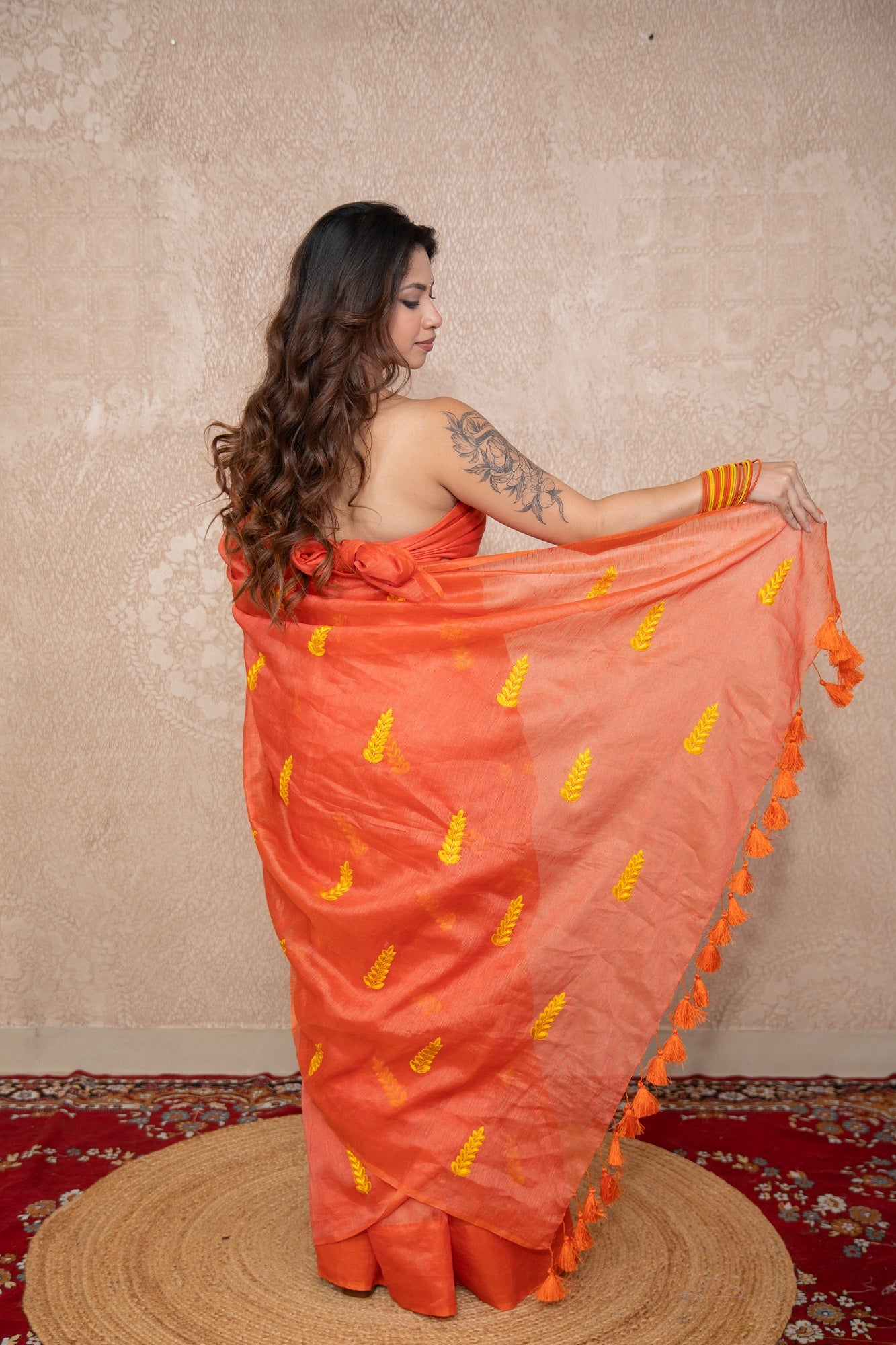 Color: Festive orange with refined embroidered leaf motifs
