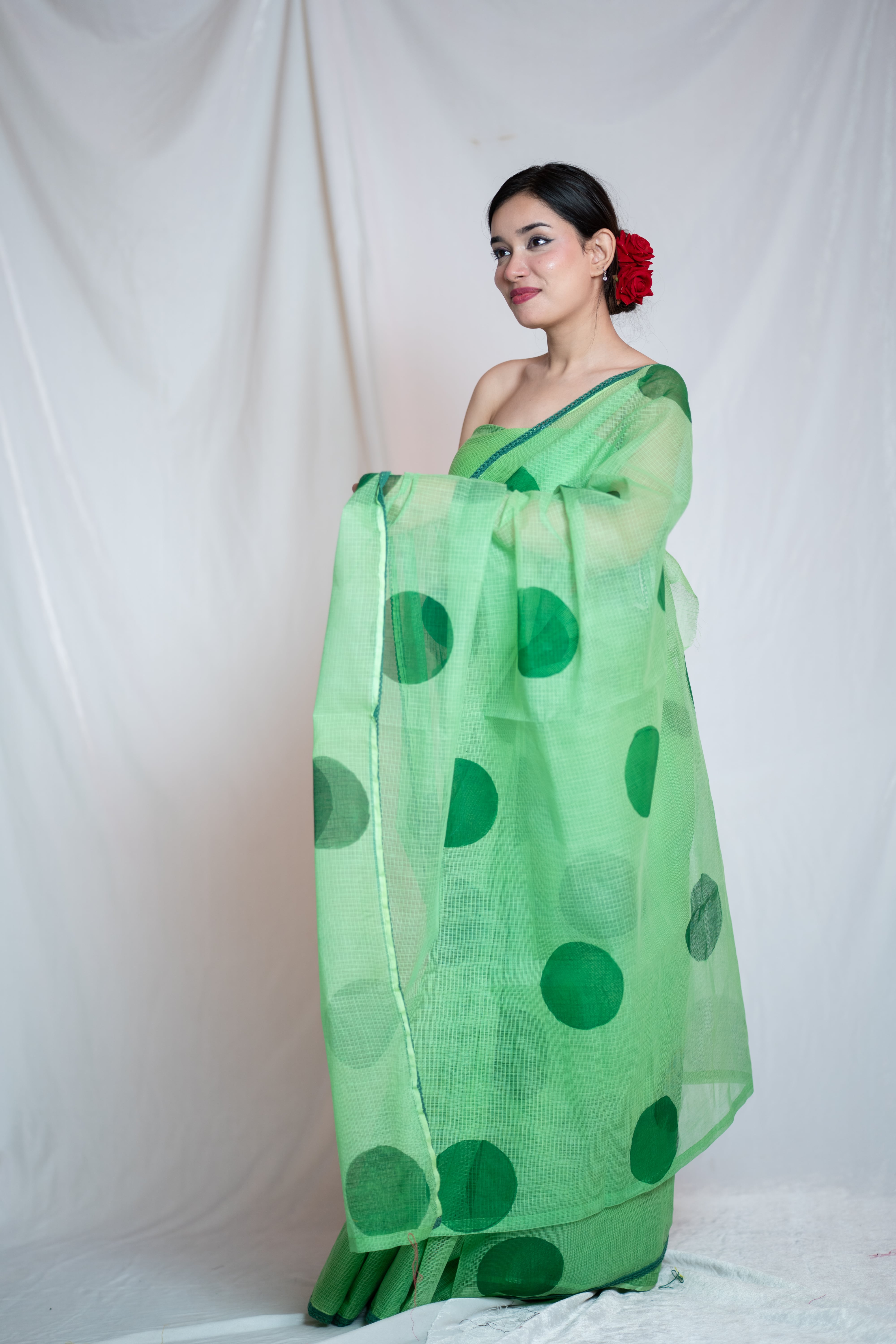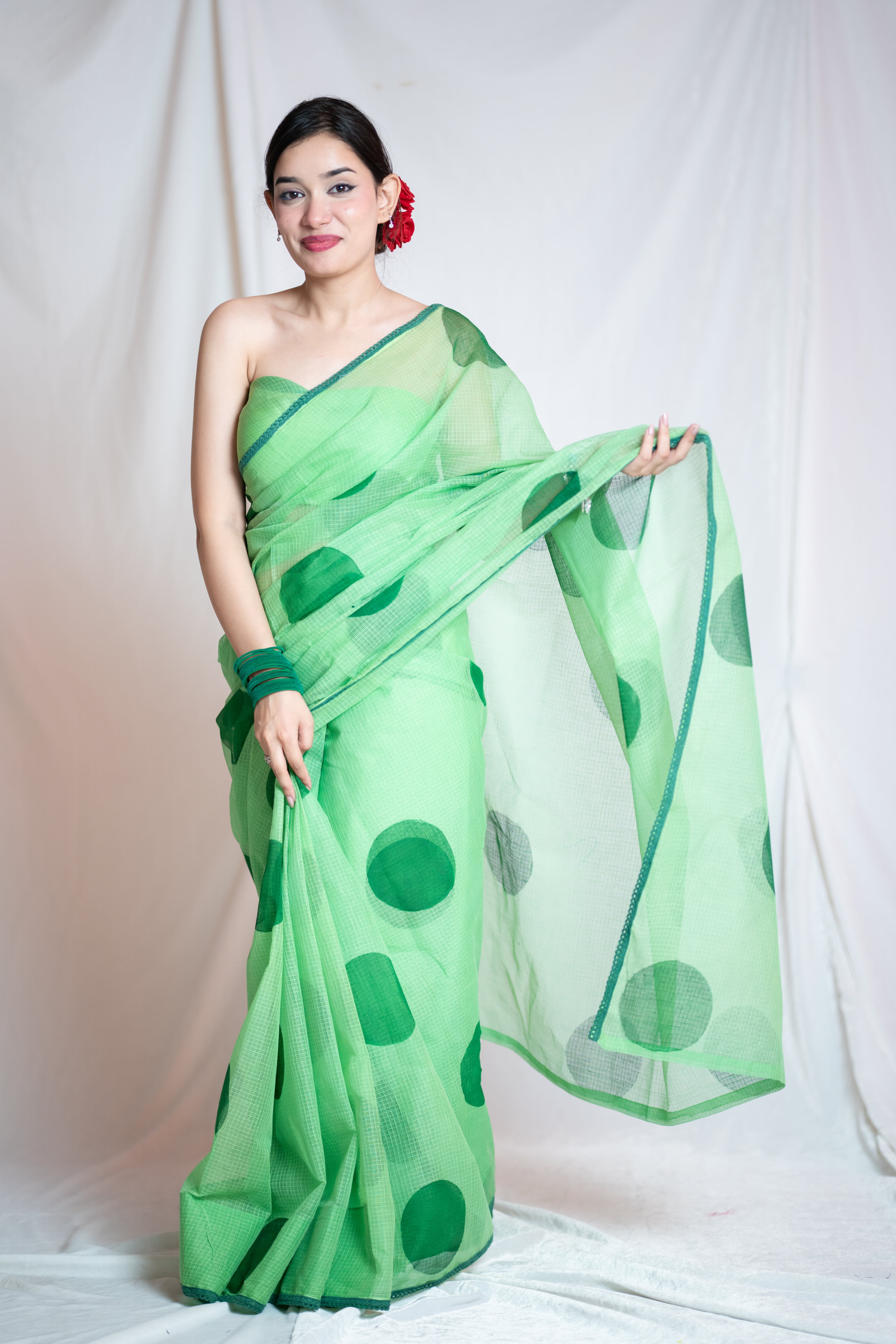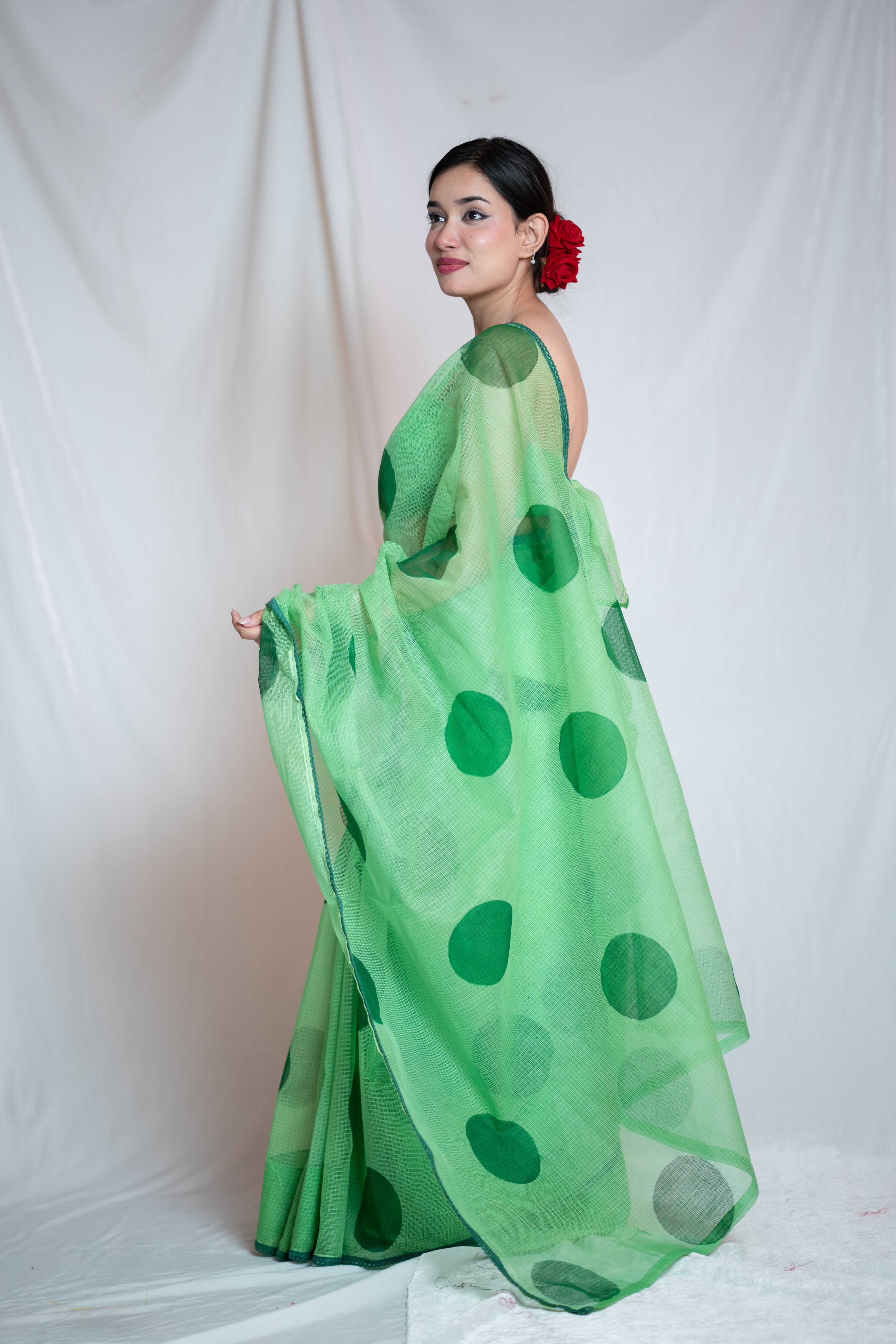 Indulge in a journey through timeless elegance with Mathe Ri Bindu's stunning green doria saree. This exquisite piece is a celebration of vintage charm, featuring dark green polka dots scattered artfully across its pure cotton fabric. The classic allure of the saree is further accentuated by the delicate lace edging that adorns its entirety, adding a touch of grace to its retro-inspired design.