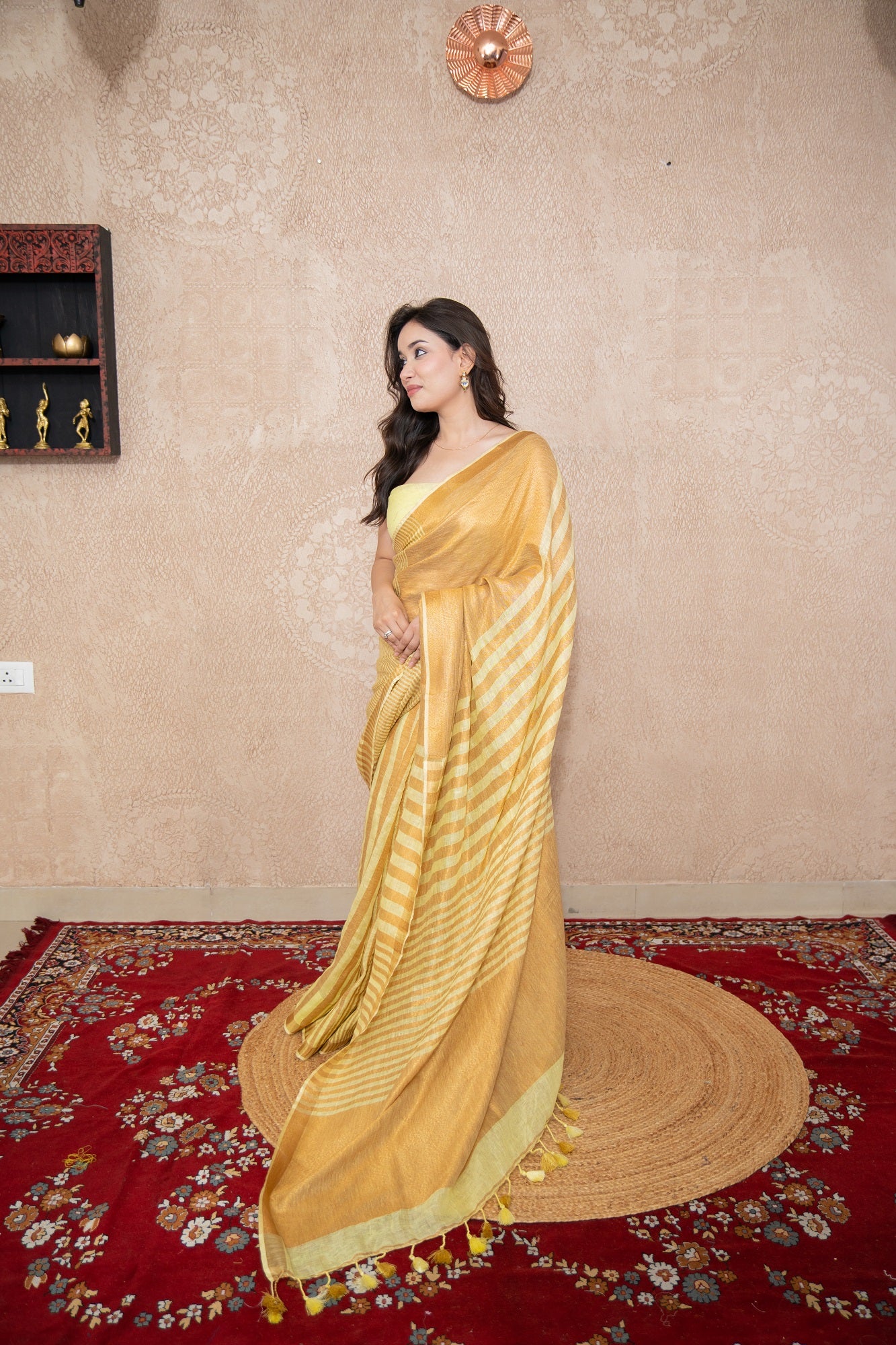 Bright, uplifting, and gracefully minimal — Meghrima is a radiant Yellow Striped Zari Linen Saree that captures the warmth of sunshine and the sophistication of handwoven tradition. A standout piece from our "Sone ki Abha" collection, it’s the perfect choice for festive mornings, haldi ceremonies, or elegant daytime affairs.