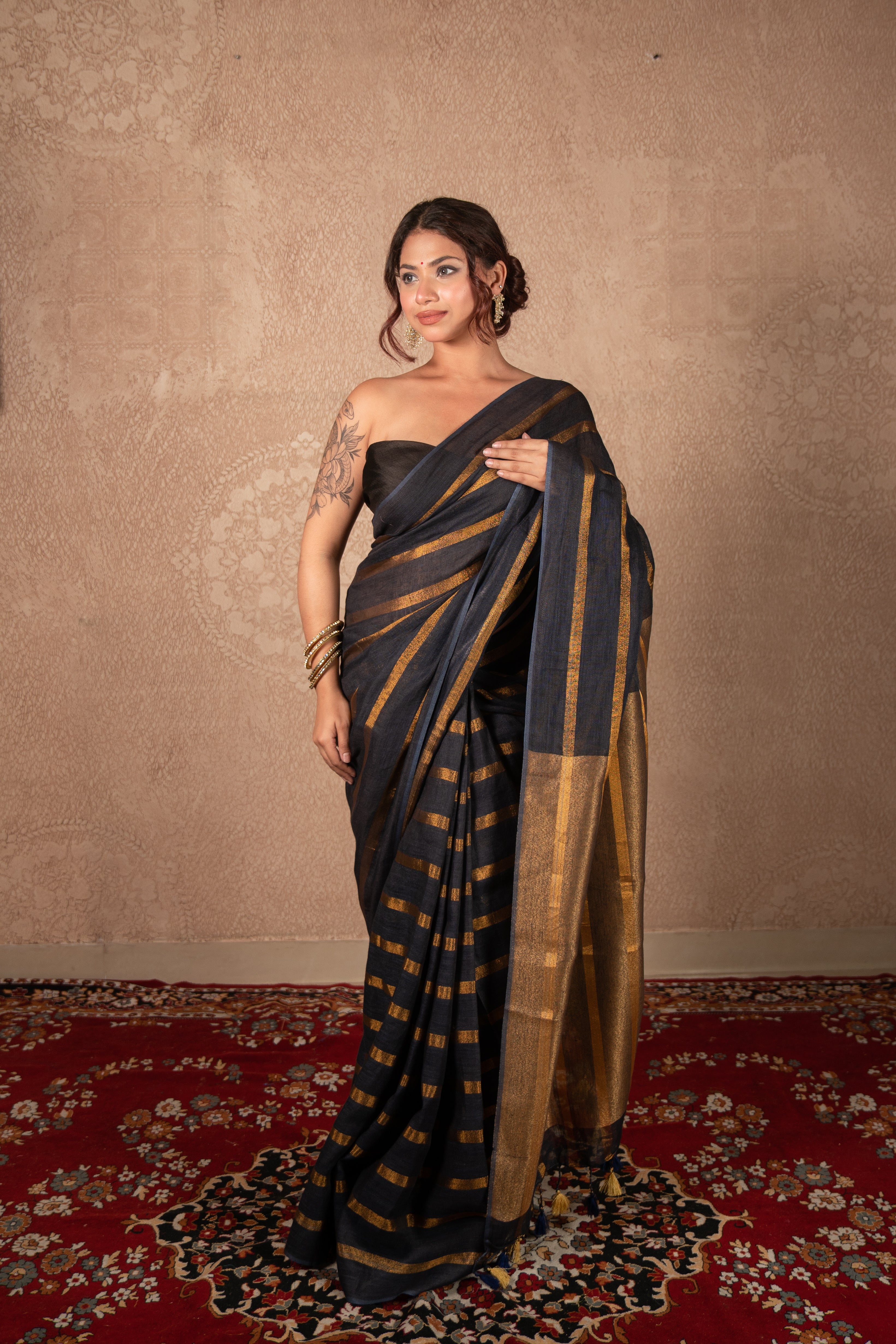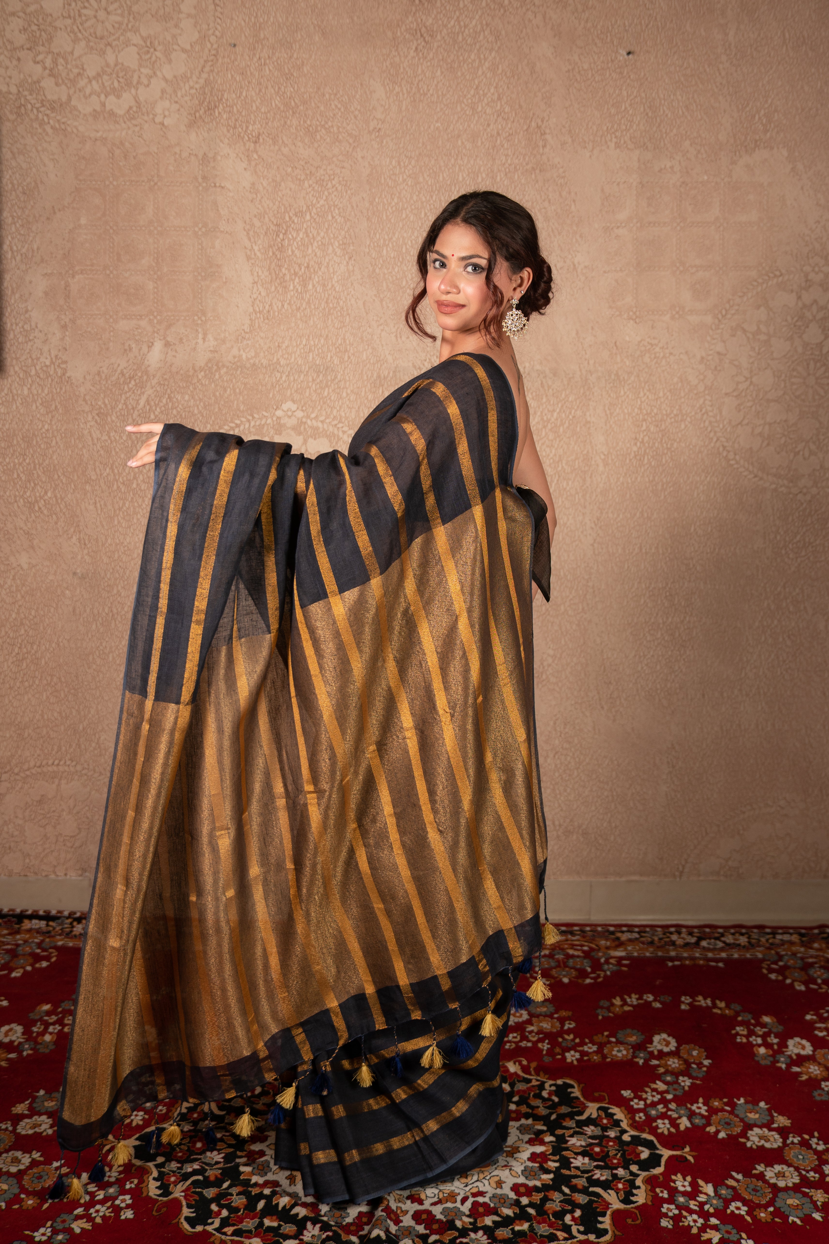 Blue Linen Saree, Striped Linen Saree, Golden Pallu Saree, Pure Linen Saree, Elegant Linen Saree, Office Wear Saree, Casual Wear Saree, Traditional Saree, Festive Saree, Lightweight Saree