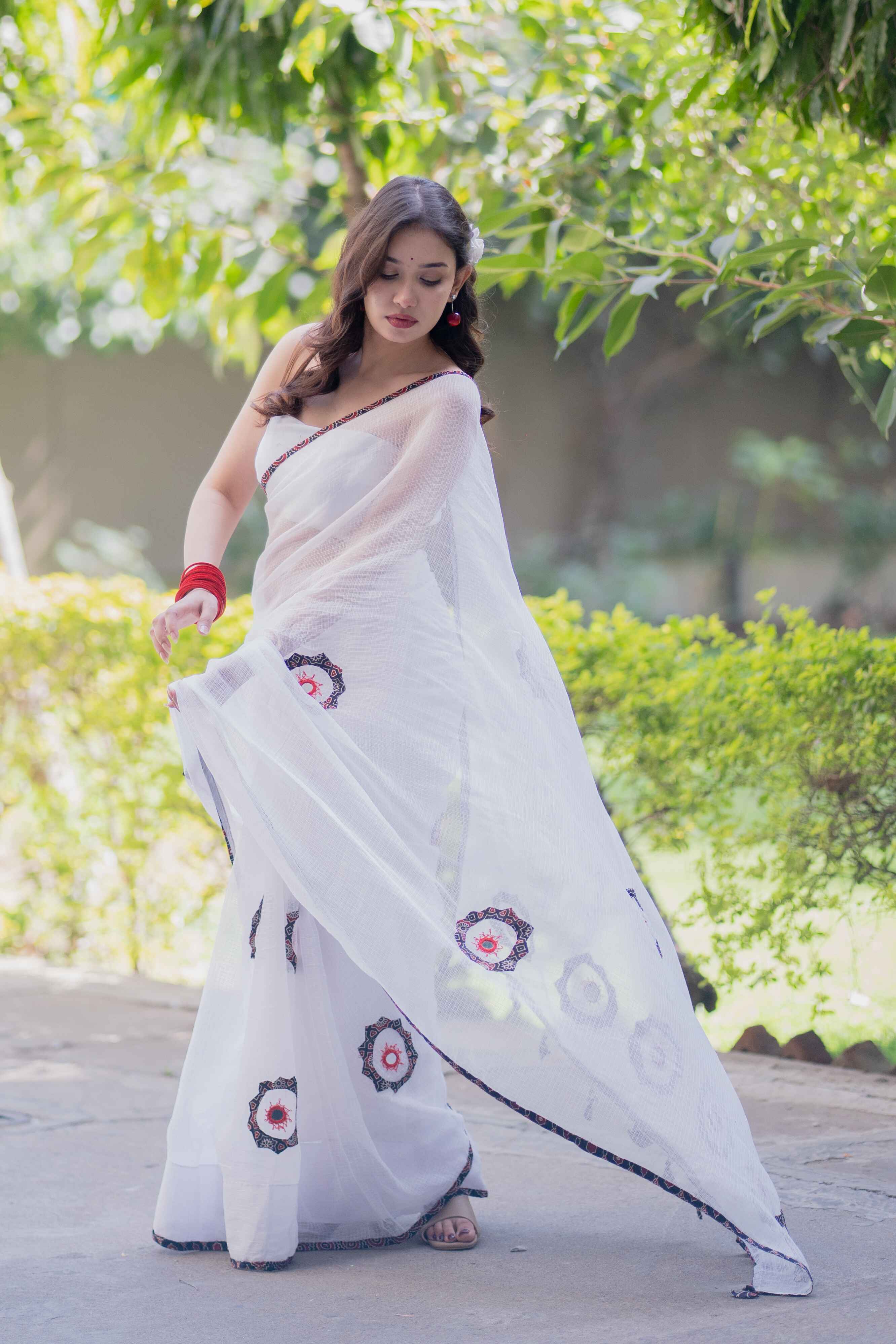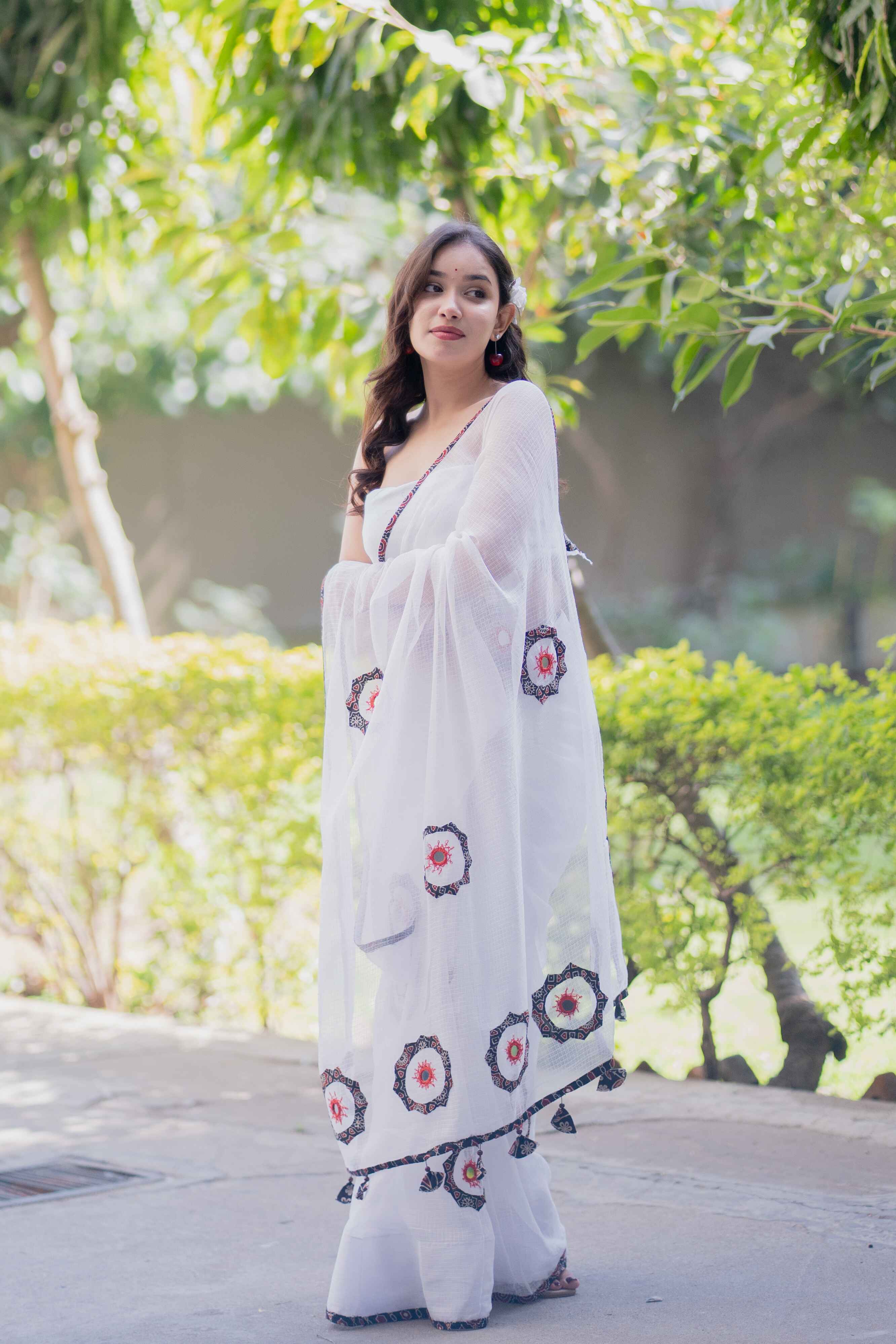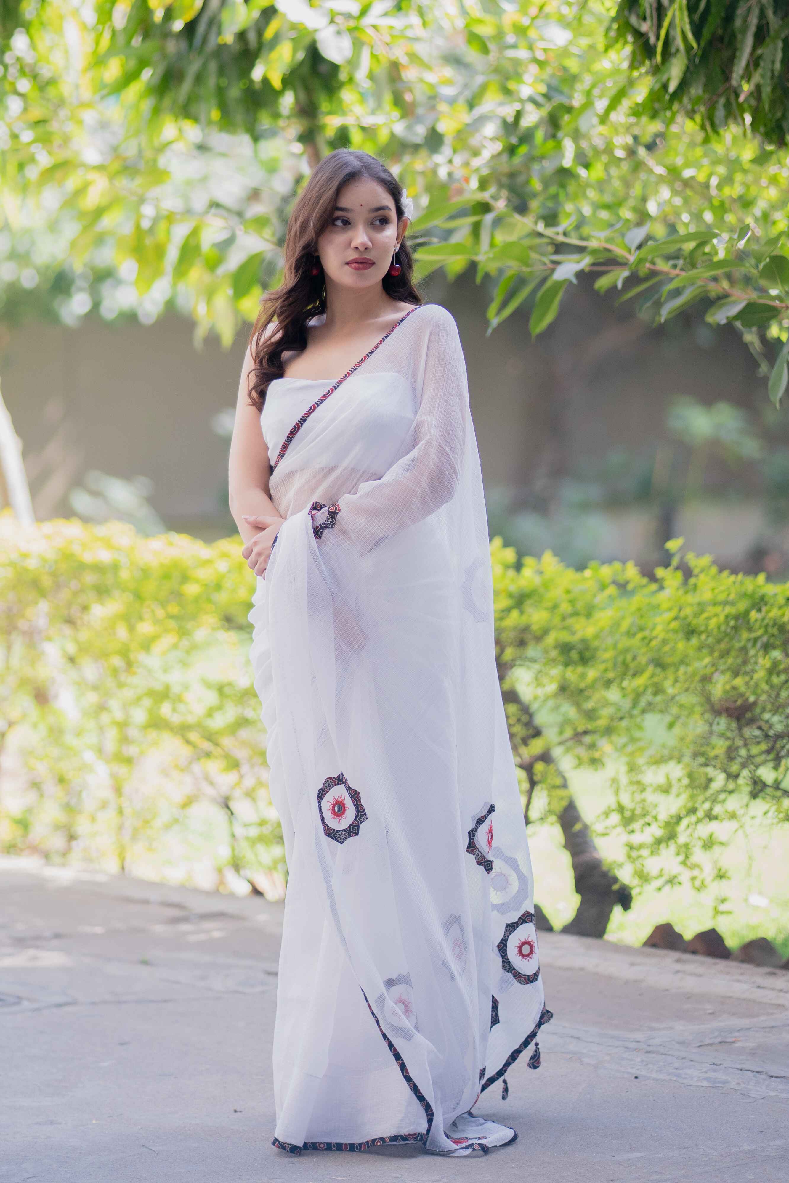 A seamless blend of tradition and artisanal craftsmanship, the Nandini Kota Doria Saree is a celebration of understated grace. Designed for the modern woman who cherishes heritage, this saree features a delicate Ajrakh applique border in a striking shade of blue, adorned with intricate floral motifs and mirror work that shimmer with every move.